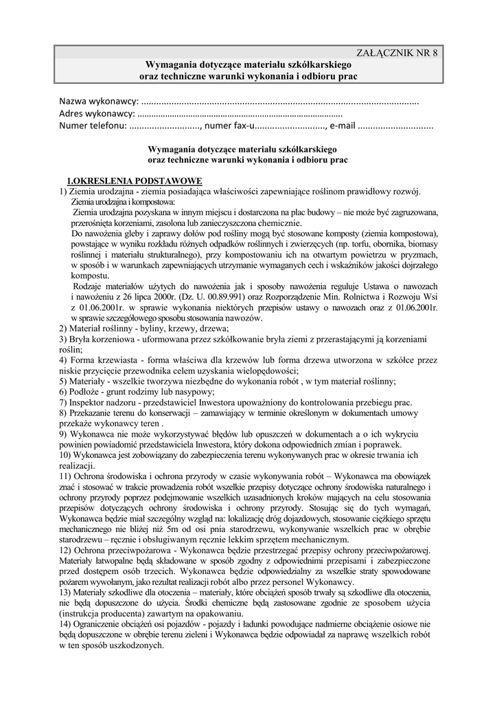ZAŁĄCZNIK NR 8 Wymagania dotyczące materiału szkółkarskiego oraz techniczne warunki wykonania i odbioru prac Nazwa wykonawcy: .............................................................................................................. Adres wykonawcy: …………………………………………………………………………….. Numer telefonu: ............................, numer fax-u............................, e-mail .............................. Wymagania dotyczące materiału szkółkarskiego oraz techniczne warunki wykonania i odbioru prac 1.OKRESLENIA PODSTAWOWE 1) Ziemia urodzajna - ziemia posiadająca właściwości zapewniające roślinom prawidłowy rozwój. Ziemia urodzajna i kompostowa: Ziemia urodzajna pozyskana w innym miejscu i dostarczona na plac budowy – nie moŜe być zagruzowana, przerośnięta korzeniami, zasolona lub zanieczyszczona chemicznie. Do nawoŜenia gleby i zaprawy dołów pod rośliny mogą być stosowane komposty (ziemia kompostowa), powstające w wyniku rozkładu róŜnych odpadków roślinnych i zwierzęcych (np. torfu, obornika, biomasy roślinnej i materiału strukturalnego), przy kompostowaniu ich na otwartym powietrzu w pryzmach, w sposób i w warunkach zapewniających utrzymanie wymaganych cech i wskaźników jakości dojrzałego kompostu. Rodzaje materiałów uŜytych do nawoŜenia jak i sposoby nawoŜenia reguluje Ustawa o nawozach i nawoŜeniu z 26 lipca 2000r. (Dz. U. 00.89.991) oraz Rozporządzenie Min. Rolnictwa i Rozwoju Wsi z 01.06.2001r. w sprawie wykonania niektórych przepisów ustawy o nawozach oraz z 01.06.2001r. w sprawie szczegółowego sposobu stosowania nawozów. 2) Materiał roślinny - byliny, krzewy, drzewa; 3) Bryła korzeniowa - uformowana przez szkółkowanie bryła ziemi z przerastającymi ją korzeniami roślin; 4) Forma krzewiasta - forma właściwa dla krzewów lub forma drzewa utworzona w szkółce przez niskie przycięcie przewodnika celem uzyskania wielopędowości; 5) Materiały - wszelkie tworzywa niezbędne do wykonania robót , w tym materiał roślinny; 6) PodłoŜe - grunt rodzimy lub nasypowy; 7) Inspektor nadzoru - przedstawiciel Inwestora upowaŜniony do kontrolowania przebiegu prac. 8) Przekazanie terenu do konserwacji – zamawiający w terminie określonym w dokumentach umowy przekaŜe wykonawcy teren . 9) Wykonawca nie moŜe wykorzystywać błędów lub opuszczeń w dokumentach a o ich wykryciu powinien powiadomić przedstawiciela Inwestora, który dokona odpowiednich zmian i poprawek. 10) Wykonawca jest zobowiązany do zabezpieczenia terenu wykonywanych prac w okresie trwania ich realizacji. 11) Ochrona środowiska i ochrona przyrody w czasie wykonywania robót – Wykonawca ma obowiązek znać i stosować w trakcie prowadzenia robót wszelkie przepisy dotyczące ochrony środowiska naturalnego i ochrony przyrody poprzez podejmowanie wszelkich uzasadnionych kroków mających na celu stosowania przepisów dotyczących ochrony środowiska i ochrony przyrody. Stosując się do tych wymagań, Wykonawca będzie miał szczególny wzgląd na: lokalizację dróg dojazdowych, stosowanie cięŜkiego sprzętu mechanicznego nie bliŜej niŜ 5m od osi pnia starodrzewu, wykonywanie wszelkich prac w obrębie starodrzewu – ręcznie i obsługiwanym ręcznie lekkim sprzętem mechanicznym. 12) Ochrona przeciwpoŜarowa - Wykonawca będzie przestrzegać przepisy ochrony przeciwpoŜarowej. Materiały łatwopalne będą składowane w sposób zgodny z odpowiednimi przepisami i zabezpieczone przed dostępem osób trzecich. Wykonawca będzie odpowiedzialny za wszelkie straty spowodowane poŜarem wywołanym, jako rezultat realizacji robót albo przez personel Wykonawcy. 13) Materiały szkodliwe dla otoczenia – materiały, które obciąŜeń sposób trwały są szkodliwe dla otoczenia, nie będą dopuszczone do uŜycia. Środki chemiczne będą zastosowane zgodnie ze sposobem uŜycia (instrukcja producenta) zawartym na opakowaniu. 14) Ograniczenie obciąŜeń osi pojazdów - pojazdy i ładunki powodujące nadmierne obciąŜenie osiowe nie będą dopuszczone w obrębie terenu zieleni i Wykonawca będzie odpowiadał za naprawę wszelkich robót w ten sposób uszkodzonych. 15) Bezpieczeństwo i higiena pracy – podczas realizacji robót Wykonawca będzie przestrzegać przepisów dotyczących bezpieczeństwa i higieny pracy. W szczególności Wykonawca ma obowiązek zadbać, aby personel nie wykonywał pracy w warunkach niebezpiecznych, szkodliwych dla zdrowia oraz niespełniających odpowiednich wymagań sanitarnych. Wykonawca zapewni i będzie utrzymywał wszelkie urządzenia zabezpieczające, socjalne oraz sprzęt i odpowiednią odzieŜ dla ochrony Ŝycia i zdrowia osób zatrudnionych oraz zapewnienie bezpieczeństwa publicznego. Uznaje się, Ŝe wszelkie koszty związane z wypełnieniem wymagań określonych powyŜej nie podlegają odrębnej zapłacie i są uwzględnione w cenie umownej. 16) Stosowanie się do prawa i innych przepisów – Wykonawca zobowiązany jest znać wszystkie przepisy wydane przez władze centralne i miejscowe oraz inne przepisy i wytyczne, które są w jakikolwiek sposób związane z robotami i będzie w pełni odpowiedzialny za przestrzeganie tych praw, przepisów i wytycznych podczas prowadzenia robót. 17) Pracami konserwatorskimi oraz pracami restauratorskimi polegającymi na zabezpieczeniu, uzupełnieniu, rekonstrukcji lub konserwacji parków wpisanych do rejestru zabytków albo innego rodzaju zorganizowanej zieleni wpisanej do rejestru zabytków, moŜe kierować osoba, która posiada tytuł zawodowy magistra lub magistra inŜyniera uzyskany po ukończeniu wyŜszych studiów, obejmujących wiadomości w tym zakresie, oraz odbyła po ukończeniu tych studiów, co najmniej 12 miesięczną praktykę zawodową przy konserwacji i pielęgnacji tego rodzaju zabytków. 18) Prace o charakterze technicznym w w/w zakresie moŜe prowadzić osoba, która posiada świadectwo ukończenia sz