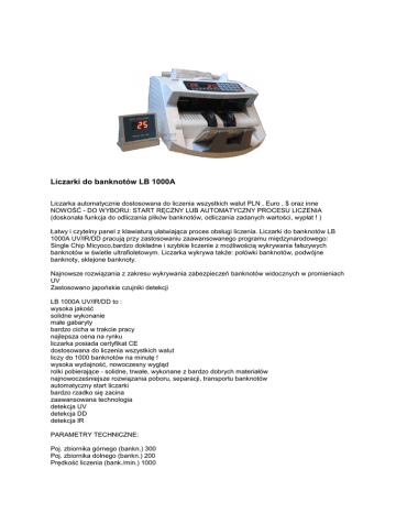 Liczarki do banknotów LB 1000A Liczarka automatycznie dostosowana do liczenia wszystkich walut PLN , Euro , $ oraz inne NOWOŚĆ - DO WYBORU: START RĘCZNY LUB AUTOMATYCZNY PROCESU LICZENIA (doskonała funkcja do odliczania plików banknotów, odliczania zadanych wartości, wypłat ! ) Łatwy i czytelny panel z klawiaturą ułatwiająca proces obsługi liczenia. Liczarki do banknotów LB 1000A UV/IR/DD pracują przy zastosowaniu zaawansowanego programu międzynarodowego: Single Chip Micyoco,bardzo dokładne i szybkie liczenie z możliwością wykrywania fałszywych banknotów w świetle ultrafioletowym. Liczarka wykrywa także: połówki banknotów, podwójne banknoty, sklejone banknoty. Najnowsze rozwiązania z zakresu wykrywania zabezpieczeń banknotów widocznych w promieniach UV Zastosowano japońskie czujniki detekcji LB 1000A UV/IR/DD to : wysoka jakość solidne wykonanie małe gabaryty bardzo cicha w trakcie pracy najlepsza cena na rynku liczarka posiada certyfikat CE dostosowana do liczenia wszystkich walut liczy do 1000 banknotów na minutę ! wysoka wydajność, nowoczesny wygląd rolki pobierające - solidne, trwałe, wykonane z bardzo dobrych materiałów najnowocześniejsze rozwiązania poboru, separacji, transportu banknotów automatyczny start liczarki bardzo rzadko się zacina zaawansowana technologia detekcja UV detekcja DD detekcja IR PARAMETRY TECHNICZNE: Poj. zbiornika górnego (bankn.) 300 Poj. zbiornika dolnego (bankn.) 200 Prędkość liczenia (bank./min.) 1000 Rozmiar banknotów: długość: 100~180 mm szerokość: 50~85 mm grubość: 0.075~0.15 mm Wymiary X / Y / Z (mm):292/246/178 Waga 7 kg Zasilanie 230V 50/60Hz. Zużycie energii 70W Wyświetlacz LED, kolor czerwony Bardzo dokładna i szybka liczarka która liczy z możliwością wykrywania fałszywych banknotów. Wykrywa także:połówki banknotów, podwójne banknoty, sklejone banknoty . Liczarka charakteryzuje się prostą obsługą, oraz bardzo cichą pracą. Doskonale liczy stare i nowe banknoty, płynna cicha praca . To najlepsza cena w Polsce, serwis na terenie całego kraju. Liczarka jest doskonale wykonana technicznie, bardzo dobra jakość materiałów powoduje że nie ma problemów serwisowych ! Instrukcja w języku polskim. Wszystkie liczarki są nowe w oryginalnym opakowaniu + zabezpieczone w styropianie na czas transportu. Dodatkowy zewnętrzny wyświetlacz do liczarki GRATIS!!! Liczarka jestłatwa w obsłudze i niewielkich rozmiarów. Zapewniamy wysoką niezawodność, dokładność oraz szybkość. Liczarka jest bardzo cicha w trakcie pracy. FUNKCJE: Czytelne klawisze i wyświetlacze. Wysoka dokładność liczenia i niezawodność. Łatwa konserwacja liczarki. Pojemność zasobnika: ok. 300 szt. banknotów. Pojemność odbiornika: ok. 200 szt. banknotów. Wydajność: 1000 banknotów /min. Automatyczny start liczarki. Odliczanie dowolnych plików. Wykrywa fałszywe banknoty w świetle Ultrafioletowym. DOSKONAŁAJAKOŚĆ WYKONANIA:24 MIESIĄCE GWARANCJI !!! ZASTOSOWANIE: BANK, KANTOR, SKLEP, HURTOWNIA