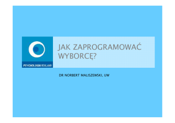 JAK ZAPROGRAMOWAĆ WYBORCĘ? DR NORBERT MALISZEWSKI, UW PREMIER, PREZYDENT, KŁAMCA Donald, kłamczuszku! Który z polityków najczęściej kłamie? sz ys cy w An dr ze jL Zb ep ig ni pe ew r Zi ob Ja ro ce k Ku rs ki D on al d Tu sk 20% 19,1% 18% 16,7% 16% 14% 12% 10% 8,7% 7,3% 8% 6% 4% 2,6% 1,7% 1,4% 1,0% 1,9% 2% 0% Maliszewski, N., Sachno, S., Sijka, A. (2008). Kłamię, więc jestem. Wprost, 31, s. 18-23 Badanie Pentor, 800 dorosłych Polaków, ankieta telefoniczna (lipiec, 2008) Kłamała PO, kłamało PiS Najbardziej kłamliwe obietnice wyborcze PiS i PO 20,5% wy budowanie 3 mln mieszkań (PiS 2005) 19,1% bezpłatny dostęp do opieki zdrowotnej i likwidacja NFZ (PO 2007) 16,6% tanie państwo (PiS 2005) 15,0% nowoczesna sieć autostrad (PO 2007) 7,2% rady kalne podniesienie płac dla budŜetówki (PO 2007) podatek liniowy z ulgą prorodzinną (PO 2007) 4,8% oczy szczenie Polski z układów (PiS 2005) 4,7% rewolucja moralna (PiS 2005) 0% 2,9% 5% 10% 15% 20% 25% Dobry iluzjonista, zły manipulator Tusk iluzjonista - używa białych kłamstw, obietnic bez pokrycia, przywiązuje ogromną wagę do formy i stylu Kaczyń ński manipulator - nie ukrywa intencji, bezwzględny 30 IDI (lipiec, 2008) Przyczyna: marketing pojmowany jako narzę ędzie manipulacji PROGRAMOWANIE WYSTĄPIENIA PROGRAMOWANIE WYBORCÓW 1. AUTOMATYCZNE WARUNKOWANIE (badanie jakoś ściowe) 2. UWAGA – KOŃ Ń TROJAŃ ŃSKI (badanie eksperymentalne) 3. MYŚ ŚLENIE I JĘ ĘZYK MIŁ ŁOŚ ŚCI (badanie jakoś ściowe) 4. EMOCJE (badanie eksperymentalne) 5. TOŻ ŻSAMOŚĆ ŚĆ (badanie eksperymentalne) 6. RACJONALNY WYBORCA (badanie jakoś ściowe) WNIOSKI 1. AUTOMATYCZNE WARUNKOWANIE Oczy Olejniczaka i klata … mało REFLEKSYJNY PROCES OCENY, ZGODNY Z JAWNYMI POSTAWAMI (domena HOMO POLITICUSA) Program, kompetencje, polityka *deklaracje w sondażach TAK (20% ???) Czy ktoś ma NIE (80% ???) motywację i moŜliwości Komunikat polityczny jego odbioru? BIERNY ODBIÓR, NIEŚWIADOME WARUNKOWANIE (domena HOMO AUTOMATICUSA) Symbole, emotikony, ję ęzyk ciałła, atrakcyjność ść *badania jakościowe, analiza regresji w badaniach wizerunkowych (umiejętność wzbudzania emocji bardziej związana z preferencją osoby niż kompetencja) PO z Muchą, PiS zapach z męskiej przebieralni Wzrok (max 10 punktów) PO – 8 pkt – uśmiechnięte emotikony, atrakcyjni politycy, z pozytywną mową ciała, zbilansowany pierwiastek damskomęski SLD – 5 pkt – młodzi przywódcy na tle bardzo tradycyjnej czerwieni, po liftingu na szyldzie „lewica” PiS – 4 pkt – siermięŜni wojowie w stonowanej niebieskiej kolorystyce PSL – 4 pkt – spokojna, męska zieleń poloneza z lat 80. Zapach (max 10 punktów) PO – 6 pkt – świeŜy, morski PiS – 2 pkt – stęchlizna starych pomieszczeń, męskiej przebieralni SLD – 2 pkt – tani dezodorant z kiosku, z nazwą podobną do markowych perfum PSL – 2 pkt – wiejski, z dyskretną nutą gnojówki SLD kwaskowaty smak, z odrobiną alkoholu Słuch (max 10 punktów) PO – 8 pkt – rockowe, dynamiczne dźwięki, na zmianę z leniwą balladą PiS – 4 pkt – muzyka religijna, czasem Kaczmarski SLD – 3 pkt – nostalgiczne przeboje z lat 70., pieśni śpiewane na wiecach PSL – 3 pkt – muzyka mechaniczna, ale nie dyskotekowa – raczej w rytmie traktora Dotyk (max 10 punktów) PO – 4 pkt – bardzo elastyczna forma, niczym plastelina SLD – 3 pkt – tani plastik PiS – 3 pkt – szorstki i chłodny materiał PSL – 3 pkt – pozornie miękka powierzchnia, która potem wciąga jak bagno Smak (max 10 punktów) PO – 5 pkt – bardzo słodki, czasem mdły SLD – 5 pkt – słodki, z odrobinką alkoholu PSL – 4 pkt – tłusty i przaśny, na siłę urozmaicany szczypiorkiem PiS – 3 pkt – cierpki i gorzki 2. UWAGA – KOŃ TROJAŃSKI Po co PO Palikot - lider sondaŜu polityków do zwolnienia? Techniki konia trojańskiego: 1)zwodzą uwagę wyborców (Fakty i akty; in vitro na bezpłodność rządu, Palikot z wibratorem); 2) rozbrajają kontrargumentację (np. „Myślę, Ŝe wypowiedzi na temat mojej amnezji są nieuprawnione. Niestety, nie zapamiętałem, kto jest ich autorem”, Reagan do Mondale); 3) wykorzystują „skąpca poznawczego” (np. autorytety). Podczas oceny wyborcy nie wykorzystują wszelkich informacji, które mają w pamięci, tylko uŜywają tych najbardziej dostępnych, stąd walka o uwagę mediów poprzez trojany. Dowcip jako broń w polityce, to nie Ŝart Polityk A cieszy się ogólnie dobrą opinią, zaś jego kompetencje „ekonomiczne” są niezadawalające. Polityka B : ogólne opinie o nim są negatywne, natomiast jest on kompetentny w kwestiach gospodarczych. Którego z polityków wybierasz do sejmowej Komisji ds. Finansów Publicznych? 3. MYŚLENIE I JĘZYK MIŁOŚCI śadne krzyki nas nie przekonają, Ŝe białe jest białe, a czarne jest czarne 1) Manipulacja przekazem na poziomie języka (IV RP vs miłość i zaufanie) 2) Wpływ na sposób myślenia o zdarzeniach poprzez budowanie korzystnych dla siebie narracji (Tusk – Frodo, Kaczyński – Władca Mordoru; PO - Titanic) 3) Oddziaływanie na procesy wnioskowania o cechach polityków (Tusk palił marihuanę, czy jest narkomanem?) Polityka polega na opowiadaniu ludziom dobrych historii Badanie jakościowe pt. bajki polityków Miłościwe panujący król Donald Serce był kojarzony m.in. z Janem Serce, amorkiem, słoneczkiem, Frodo, kaczorem Donaldem, Syzyfem, Prometeuszem, ale takŜe z Liskiem Chytruskiem, Piotrusiem Panem. Inni politycy rządu spalają się w cieniu słońca Waldemar Pawlak badani niemal nie dostrzegli przemiany, jakiej dokonał Pawlak ze sztywnego polityka (Polonez) w mądrego przywódcę z ciętym językiem (Toyota). Bronisław Komorowski nie opowiedział o sobie jakiejś sensownej historii. Radosław Sikorski jest niezwykle korzystnie postrzegany ze względu na dziennikarską przygodę w Afganistanie, inteligencję oraz prezencję (rycerz, sokół, James Bond, Bruce