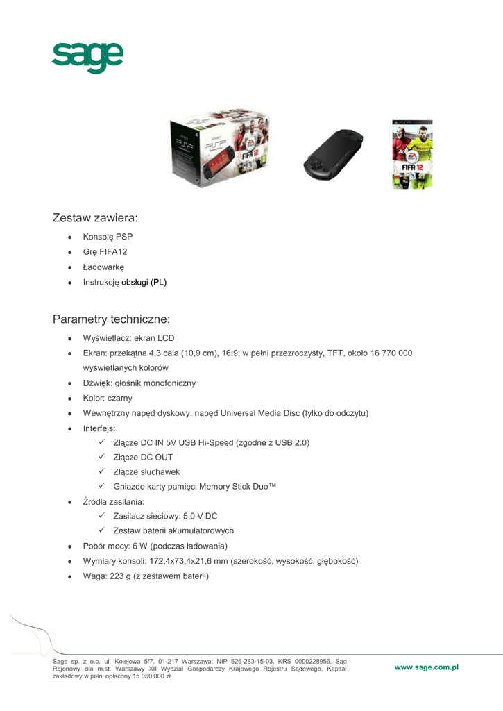 Zestaw zawiera: Konsolę PSP Grę FIFA12 Ładowarkę Instrukcję obsługi (PL) Parametry techniczne: Wyświetlacz: ekran LCD Ekran: przekątna 4,3 cala (10,9 cm), 16:9; w pełni przezroczysty, TFT, około 16 770 000 wyświetlanych kolorów Dźwięk: głośnik monofoniczny Kolor: czarny Wewnętrzny napęd dyskowy: napęd Universal Media Disc (tylko do odczytu) Interfejs: Złącze DC IN 5V USB Hi-Speed (zgodne z USB 2.0) Złącze DC OUT Złącze słuchawek Gniazdo karty pamięci Memory Stick Duo™ Źródła zasilania: Zasilacz sieciowy: 5,0 V DC Zestaw baterii akumulatorowych Pobór mocy: 6 W (podczas ładowania) Wymiary konsoli: 172,4x73,4x21,6 mm (szerokość, wysokość, głębokość) Waga: 223 g (z zestawem baterii) Sage sp. z o.o. ul. Kolejowa 5/7, 01-217 Warszawa; NIP 526-283-15-03, KRS 0000228956, Sąd Rejonowy dla m.st. Warszawy XII Wydział Gospodarczy Krajowego Rejestru Sądowego, Kapitał zakładowy w pełni opłacony 15 050 000 zł www.sage.com.pl