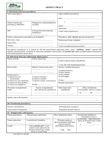 OFERTA PRACY I. Informacje dotyczące pracodawcy Nazwa pracodawcy Adres siedziby pracodawcy ………………………………………………………………........ Numer statystyczny pracodawcy (REGON) Podstawowy rodzaj działalności wg PKD ulica …………………………………..………………… - ….………………………...………… gmina ………………………………….……….………. telefon/fax……………………………………….……… NIP Forma prawna prowadzonej działalności …………………….. Osoba wskazana przez pracodawcę do kontaktów: e-mail /strona internetowa ……………………………… Nazwisko i imię ………….………………………………….. Preferowana forma kontaktu: Stanowisko …………………………………………………… ……………………………………………………...……. Telefon ………………...…………………………………….. Liczba zatrudnionych pracowników …….……………… Pracodawca jest / nie jest agencją zatrudnienia* Pracodawca oświadczył, że w okresie do 365 dni przed dniem zgłoszenia oferty pracy został/nie został * ukarany lub skazany prawomocnym wyrokiem za naruszenie przepisów prawa pracy lub jest/nie jest objęty postępowaniem dotyczącym naruszenia przepisów prawa pracy. II. Informacje dotyczące zgłoszonego miejsca pracy Nazwa zawodu Nazwa stanowiska ………………………………. ……………………………………. ………………………………. ……………………………………. Kod zawodu Miejsce wykonywania pracy ………………………………. ………………………………. Rodzaj umowy 1) umowa na czas nieokreślony; 2) umowa na czas określony; 3) umowa na okres próbny; 4) umowa na zastępstwo; 5) umowa zlecenie; 6) umowa o dzieło; 7) umowa o pracę tymczasową; Liczba wolnych miejsc zatrudnienia w tym: dla osób niepełnosprawnych System i rozkład czasu pracy 1) jednozmianowa; 2) dwie zmiany; 3) trzy zmiany; 4) ruch ciągły; 5) inny ……………………………………… Wymiar czasu pracy 8) inne…………………. Wysokość wynagrodzenia brutto System wynagradzania (np. miesięczny, godzinowy) …….…………………. ……………………………… ………………………………………………. Data rozpoczęcia Okres zatrudnienia zatrudnienia (w przypadku umowy o pracę) ……………………… od ……..…….do………… Ogólny zakres obowiązków............……………………………………………………………………………………………. ……………………………………………………………………………………………………………………………………… III. Oczekiwania pracodawcy Poziom wykształcenia …………………………..………….. Doświadczenie zawodowe ……………………………… Uprawnienia/Umiejętności …………….…………………..…. Znajomość języków obcych…………………………….. IV. Postępowanie z ofertą pracy Numer pracodawcy Data przyjęcia zgłoszenia ……………………. Numer zgłoszenia ……………………. ……………………………. Częstotliwość kontaktów ………………………………….. Uwagi Oferta jest/nie jest* w tym samym czasie zgłoszona do innego powiatowego urzędu pracy na terenie kraju. *niewłaściwe skreślić Okres aktualności oferty …………………………. Wyrażam zgodę na upowszechnianie informacji umożliwiających identyfikacje pracodawcy TAK NIE Oczekiwania dodatkowe: Pracodawca wnosi o przekazanie / nieprzekazanie* oferty do Powiatowego Urzędu Pracy w ………………….……. REALIZACJA Data wydania skierowania Imię i nazwisko osoby proponowanej Osoba kierowana jest z grupy NiepełnoPozostali sprawni Wynik skierowania TAKNIE Data zatrudnie nia Uwagi Odmowa przyjęcia oferty Imię i nazwisko pośrednika: ………………………………………………………… Kontakty/ustalenia: ………………………………………………………………………………………………… ………………………………………………………………………………………………… ………………………………………………………………………………………………… ………………………………………………………………………………………………… ………………………………………………………………………………………………… …………………………………………………………………………………………………
