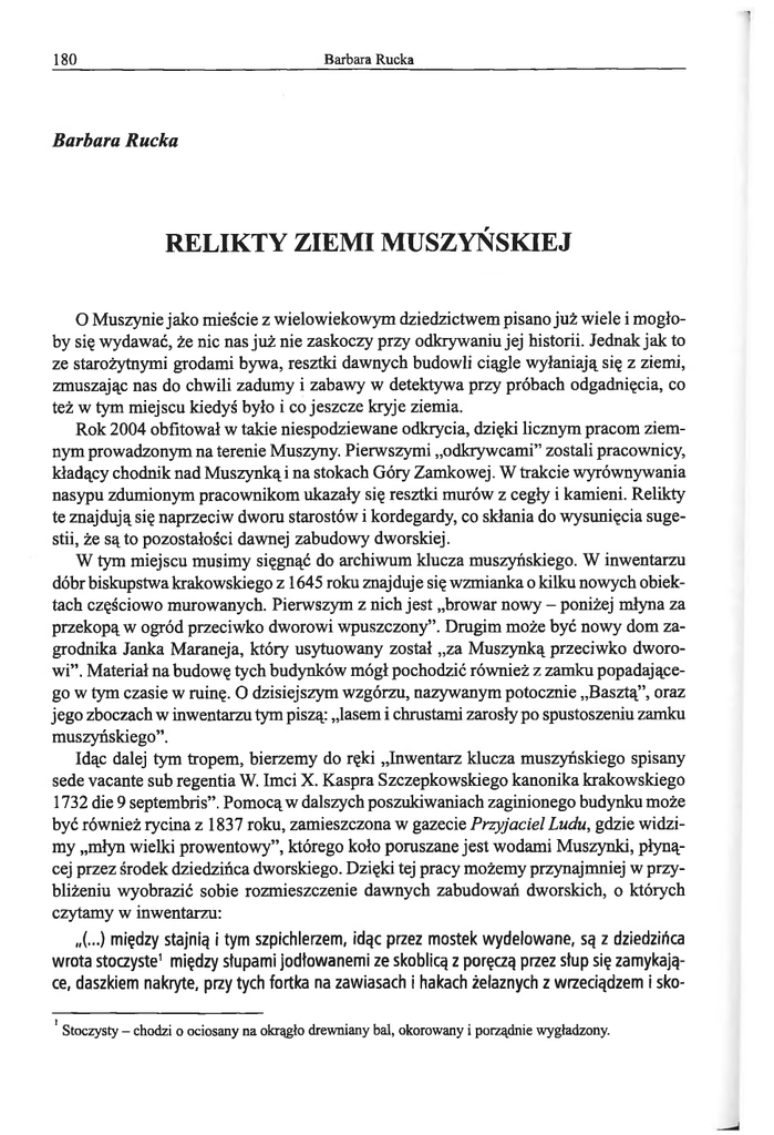 Barbara Ručka 180 Barbara Ručka RELIKTY ZIEMI MUSZYŃSKIEJ O Muszynie jako mieście z wielowiekowym dziedzictwem pisano już wiele i mogłoby się wydawać, że nic nas już nie zaskoczy przy odkrywaniu jej historii. Jednak jak to ze starożytnymi grodami bywa, resztki dawnych budowli ciągle wyłaniają się z ziemi, zmuszając nas do chwili zadumy i zabawy w detektywa przy próbach odgadnięcia, co też w tym miejscu kiedyś było i co jeszcze kryje ziemia. Rok 2004 obfitował w takie niespodziewane odkrycia, dzięki licznym pracom ziemnym prowadzonym na terenie Muszyny. Pierwszymi ״odkrywcami” zostali pracownicy, kładący chodnik nad Muszynkąi na stokach Góry Zamkowej. W trakcie wyrównywania nasypu zdumionym pracownikom ukazały się resztki murów z cegły i kamieni. Relikty te znajdują się naprzeciw dworu starostów i kordegardy, co skłania do wysunięcia sugestii, że są to pozostałości dawnej zabudowy dworskiej. W tym miejscu musimy sięgnąć do archiwum klucza muszyńskiego. W inwentarzu dóbr biskupstwa krakowskiego z 1645 roku znajduje się wzmianka o kilku nowych obiektach częściowo murowanych. Pierwszym z nich jest ״browar nowy - poniżej młyna za przekopą w ogród przeciwko dworowi wpuszczony”. Drugim może być nowy dom zagrodnika Janka Maraneja, który usytuowany został ״za Muszynką przeciwko dworowi”. Materiał na budowę tych budynków mógł pochodzić również z zamku popadającego w tym czasie w ruinę. O dzisiejszym wzgórzu, nazywanym potocznie ״Basztą”, oraz jego zboczach w inwentarzu tym piszą: ״lasem i chrustami zarosły po spustoszeniu zamku muszyńskiego”. Idąc dalej tym tropem, bierzemy do ręki ״Inwentarz klucza muszyńskiego spisany sede vacante sub regentia W. Imci X. Kaspra Szczepkowskiego kanonika krakowskiego 1732 die 9 septembris”. Pomocą w dalszych poszukiwaniach zaginionego budynku może być również rycina z 1837 roku, zamieszczona w gazecie Przyjaciel Ludu, gdzie widzimy ״młyn wielki prowentowy”, którego koło poruszane jest wodami Muszynki, płynącej przez środek dziedzińca dworskiego. Dzięki tej pracy możemy przynajmniej w przybliżeniu wyobrazić sobie rozmieszczenie dawnych zabudowań dworskich, o których czytamy w inwentarzu: )״. )״między stajnią i tym szpichlerzem, idąc przez mostek wydelowane, są z dziedzińca wrota stoczyste1 między słupami jodłowanemi ze skoblicą z poręczą przez słup się zamykające, daszkiem nakryte, przy tych fortka na zawiasach i hakach żelaznych z wrzeciądzem i sko1 Stoczysty - chodzi o ociosany na okrągło drewniany bal, okorowany i porządnie wygładzony. Relikty ziemi muszyńskiej 181 biem, kłótką się zamykające. Za temi wrotami jest mostek przez rzekę na młyn idącą, do drugich wrot wjeznych w dziedziniec przedbrowarny także stoczyste kuną przez poręcz zamykające się na biegunach, przy tych wrotach jest fortka na biegunach o czterech schodkach z obuch stron, od tych wrót szedszy w dziedziniec browarny po lewej stronie idąc jest browar do którego sieni wchodząc są drzwi na biegunach z klamką drewnianą, przy których schody na górę tarcicami zapierzone, drzwi do nich na zawiasach i hakach żelaznych z wrzeciądzem żelaznym i skoblem. Mimo te schody idąc w lewą rękę są drzwi do izby świętnej na zawiasach i hakach żelaznych z klamką i antabą i haczykiem żelaznym, w tej izbie jest okien trzy w drewno oprawne, piec kachlowy prosty na fundamencie murowanym, kominek murowany wywiedziony nad powałę do komina wielkiego nad dach wywiedzionego, w który i z podkotlin dym wychodzi, który komin jest w środku sieni, w tej izbie jest powała dobra. Podłogi nie masz, kadź wielka jedna dla zalewania na słody. Z tej izby do suszarnie drzwi na zawiasach i hakach żelaznych, z klamką i antabą żelazną, ta suszarnia od spodu murowana drzewem obwiedzona, czeluście dobre mająca i lassy [s] do tego należące, z tej suszarnie są drzwi na biegunach z klamką drewnianą Dalej w opisie znajduje się wzmianka o ״murowanej kotlinie”, w której jest wielki kocioł ״w achteli2 cztery do warzenia piwa, (...) kociołek niewielki dwoachtelowy do warzenia chmielu" oraz ״kadzi wielkich dwie piwnych, trzecia mniejsza wodna". Jednak i kolejny budynek, wymieniony w tym inwentarzu, mógłby być tym, którego poszukujemy. A oto i jego opis: (״...) Z tego browaru poszedszy przez dziedziniec jest budynek przy gorzelni, do którego sieni wchodząc są drzwi stoczyste na czterech zawiasach i hakach żelaznych zasięglikami [s] od dołu i od góry z klamką żelazną, z wrzeciądzem i skoblami, do tej sieni wszedszy po prawej ręce jest izba świętna dla rezydencji pisarza prowentowego, w której izbie jest okien dwie w drewno oprawne z okienkami wysuwanemi dwiema, pod którymi oknami jest ława do połowy. W tej izbie jest piec kachlowy stary, w ścianie przy nim kominek murowany, koło tego pieca ławki dwie, podłoga stara, powała prosta. Z tej izby drzwi do komnaty na zawiasach i hakach żelaznych, w której komnacie jest okienko jedno w ścianie wyrżnięte z essami [s] żelaznemi, podłoga i powała z tarcic. Wyszedszy z tej izby nazad do sieni w tyle pierwszej izby jest także izdebka, do której drzwi na zawiasach i hakach żelaznych z klamką i haczykiem, w tej izbie okna jako i w pierwszej we wszystkim podobne, piec obiedwie izby grzejący, swój kominek murowany podobny mająca z piecykiem piekarskim, z tej komora pierwszej we wszystkim podobna, podłoga i powała także. Wróciwszy się nazad do sieni jest komin murowany nad dach wywiedziony, do którego ze wszystkich kominów dym wchodzi (w pisarskiej izbie jest stół inwentarski mały czworograniasty), wychodząc z tej izby do sieni po prawej ręce są drzwi na tył do studni na zawiasach i hakach żelaznych z klamką żelazną, która studnia ocembrowana, wiadro na żurawiu żelaznymi obręczami jako w browarniej studni obite." 2 Dawniej ósma część beczki, miara ciec