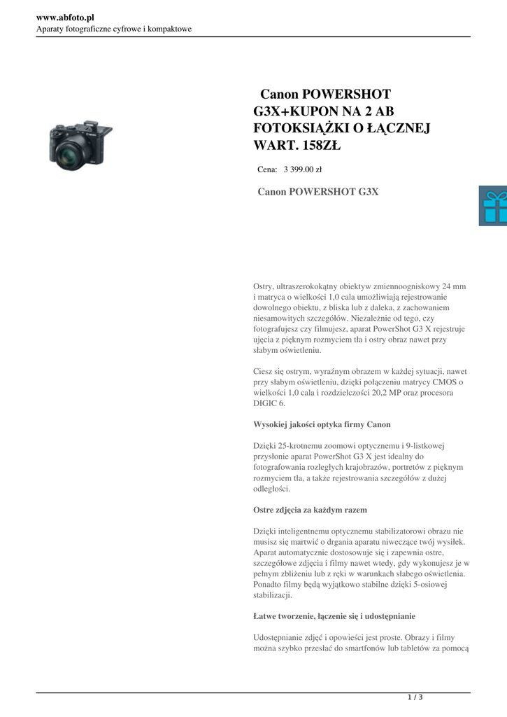 www.abfoto.pl Aparaty fotograficzne cyfrowe i kompaktowe Canon POWERSHOT G3X+KUPON NA 2 AB FOTOKSIĄŻKI O ŁĄCZNEJ WART. 158ZŁ Cena: 3 399.00 zł Canon POWERSHOT G3X Ostry, ultraszerokokątny obiektyw zmiennoogniskowy 24 mm i matryca o wielkości 1,0 cala umożliwiają rejestrowanie dowolnego obiektu, z bliska lub z daleka, z zachowaniem niesamowitych szczegółów. Niezależnie od tego, czy fotografujesz czy filmujesz, aparat PowerShot G3 X rejestruje ujęcia z pięknym rozmyciem tła i ostry obraz nawet przy słabym oświetleniu. Ciesz się ostrym, wyraźnym obrazem w każdej sytuacji, nawet przy słabym oświetleniu, dzięki połączeniu matrycy CMOS o wielkości 1,0 cala i rozdzielczości 20,2 MP oraz procesora DIGIC 6. Wysokiej jakości optyka firmy Canon Dzięki 25-krotnemu zoomowi optycznemu i 9-listkowej przysłonie aparat PowerShot G3 X jest idealny do fotografowania rozległych krajobrazów, portretów z pięknym rozmyciem tła, a także rejestrowania szczegółów z dużej odległości. Ostre zdjęcia za każdym razem Dzięki inteligentnemu optycznemu stabilizatorowi obrazu nie musisz się martwić o drgania aparatu niweczące twój wysiłek. Aparat automatycznie dostosowuje się i zapewnia ostre, szczegółowe zdjęcia i filmy nawet wtedy, gdy wykonujesz je w pełnym zbliżeniu lub z ręki w warunkach słabego oświetlenia. Ponadto filmy będą wyjątkowo stabilne dzięki 5-osiowej stabilizacji. Łatwe tworzenie, łączenie się i udostępnianie Udostępnianie zdjęć i opowieści jest proste. Obrazy i filmy można szybko przesłać do smartfonów lub tabletów za pomocą 1/3 www.abfoto.pl Aparaty fotograficzne cyfrowe i kompaktowe Wi-Fi i funkcji Dynamic NFC. Fotografujący może z łatwością znaleźć się w kadrze zdjęcia grupowego lub wykonywać zdjęcia dzikiej przyrody dzięki funkcji pełnego zdalnego sterowania ręcznego aparatem za pomocą smartfona lub tabletu. Kopie zapasowe nowych obrazów można tworzyć bezprzewodowo w dowolnym obszarze chmury za pomocą funkcji Image Sync. Ponadto można synchronizować obrazy z komputerem i smartfonem. Zaawansowane funkcje dla ambitnych filmowców Twórz niesamowite filmy Full HD z wybraną prędkością nagrywania i korzystaj z zaawansowanych funkcji, takich jak pełne sterowanie ręczne, wzmocnienie krawędzi w trybie MF i wyjście HDMI Live. Zaawansowany, 5-stopniowy dynamiczny stabilizator obrazu zapewnia stabilność nagrań zbliżoną do steadycamu, a uniwersalne złącza mikrofonu i słuchawek do nagrywania dźwięku pomagają tworzyć filmy z dźwiękiem o wysokiej jakości. Twórz płynne, realistyczne filmy Full HD z pełnym sterowaniem ręcznym i wybraną prędkością nagrywania (24p, 25p, 30p, 50p, 60p). Zaawansowany, 5-stopniowy dynamiczny stabilizator obrazu zapewnia stabilność nagrań zbliżoną do steadycamu. Uniwersalne opcje nagrywania dźwięku umożliwiają korzystanie z zewnętrznego mikrofonu i słuchawek do rejestrowania i monitorowania wysokiej jakości dźwięku stereo. Wzmocnienie krawędzi w trybie zapewni doskonałą ostrość obrazu, a znaczniki formatu obrazu ułatwią filmowanie w typowych formatach. Monitoruj efekty pracy podczas nagrywania za pomocą wyjścia HDMI Live. Zaawansowane ustawienia pomagają uwolnić kreatywność Duży, odchylany ekran dotykowy LED o wysokiej rozdzielczości (1,62 mln punktów) oraz duża liczba pokręteł i niestandardowych ustawień gwarantują kontrolę i pozwalają uwolnić kreatywność. Dotykowy AF umożliwia precyzyjną i płynną regulację ostrości w filmach, a pierścień sterowania na obiektywie zapewnia natychmiastowy dostęp do ważnych ustawień. Obsługa plików RAW, wbudowany filtr ND i tryb ekspozycji BULB zwiększają twórcze możliwości. Korzystaj z możliwości dostosowywania parametrów, takich jak konfigurowalny pierścień sterowania na obiektywie, który ułatwia korektę parametrów pracy, w tym subtelną korektę ostrości. 2/3 www.abfoto.pl Aparaty fotograficzne cyfrowe i kompaktowe Poszerz możliwości twórcze dzięki obsłudze plików RAW, wbudowanemu filtrowi ND i trybowi ekspozycji BULB, który umożliwia ręczną regulację ekspozycji. Profesjonalne zdjęcia w każdych warunkach Szybki autofokus i serie zdjęć z szybkością 5,9 kl./s pozwalają uchwycić więcej wydarzeń. Ponadto można podłączyć elektroniczny wizjer o wysokiej rozdzielczości, tak aby obsługa aparatu była zbliżona do tej znanej z lustrzanek cyfrowych. Rozwiń swoją kreatywność i steruj oświetleniem za pomocą lamp błyskowych Canon Speedlite i filtrów obiektywu. Uwiecznianie dynamicznych wydarzeń Możesz z łatwością fotografować dynamiczne wydarzenia dzięki funkcji serii zdjęć z szybkością 5,9 kl./s. Ponadto aparat będzie wykonywał zdjęcia z szybkością 5,9 kl./s aż do zapełnienia karty pamięci, dzięki czemu niczego nie przegapisz. Fotografuj w każdej pogodzie Szybki AF i serie zdjęć z szybkością 5,9 kl./s umożliwiają łatwe rejestrowanie dynamicznych wydarzeń, a odporna na kurz i krople obudowa pozwala kontynuować pracę w deszczu i w słońcu. Rozwiń swoją kreatywność Rozwiń swoją kreatywność dzięki szerokiej gamie opcjonalnych akcesoriów, takich jak elektroniczny wizjer o wysokiej rozdzielczości i lampy błyskowe EOS Speedlite. 3/3 Powered by TCPDF (www.tcpdf.org)