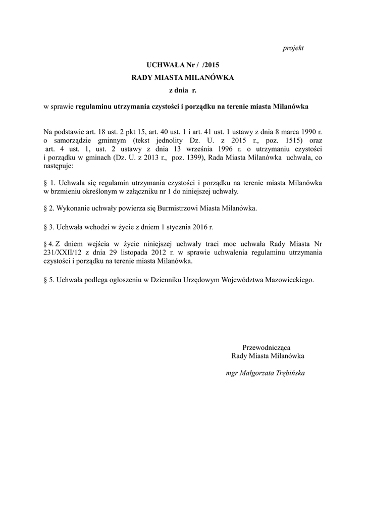 projekt UCHWAŁA Nr / /2015 RADY MIASTA MILANÓWKA z dnia r. w sprawie regulaminu utrzymania czystości i porządku na terenie miasta Milanówka Na podstawie art. 18 ust. 2 pkt 15, art. 40 ust. 1 i art. 41 ust. 1 ustawy z dnia 8 marca 1990 r. o samorządzie gminnym (tekst jednolity Dz. U. z 2015 r., poz. 1515) oraz art. 4 ust. 1, ust. 2 ustawy z dnia 13 września 1996 r. o utrzymaniu czystości i porządku w gminach (Dz. U. z 2013 r., poz. 1399), Rada Miasta Milanówka uchwala, co następuje: § 1. Uchwala się regulamin utrzymania czystości i porządku na terenie miasta Milanówka w brzmieniu określonym w załączniku nr 1 do niniejszej uchwały. § 2. Wykonanie uchwały powierza się Burmistrzowi Miasta Milanówka. § 3. Uchwała wchodzi w życie z dniem 1 stycznia 2016 r. § 4. Z dniem wejścia w życie niniejszej uchwały traci moc uchwała Rady Miasta Nr 231/XXII/12 z dnia 29 listopada 2012 r. w sprawie uchwalenia regulaminu utrzymania czystości i porządku na terenie miasta Milanówka. § 5. Uchwała podlega ogłoszeniu w Dzienniku Urzędowym Województwa Mazowieckiego. Przewodnicząca Rady Miasta Milanówka mgr Małgorzata Trębińska Załącznik do Uchwały Nr / /2015 Rady Miasta Milanówka z dnia r. Regulamin utrzymania czystości i porządku na terenie miasta Milanówka Rozdział 1 Postanowienia ogólne § 1. Regulamin określa szczegółowe zasady utrzymania czystości i porządku na terenie Miasta Milanówka dotyczące: 1) wymagań w zakresie utrzymania czystości i porządku na terenie nieruchomości obejmujących: a) prowadzenie selektywnego zbierania i odbierania lub przyjmowania przez punkty selektywnego zbierania odpadów komunalnych lub zapewnienie przyjmowania w inny sposób co najmniej takich odpadów jak: przeterminowane leki i chemikalia, zużyte baterie i akumulatory, zużyty sprzęt elektryczny i elektroniczny, meble i inne odpady wielkogabarytowe, zużyte opony, odpady zielone oraz odpady budowlane i rozbiórkowe stanowiące odpady komunalne, b) uprzątania błota, śniegu, lodu i innych zanieczyszczeń z części nieruchomości służących do użytku publicznego, c) mycia i napraw pojazdów samochodowych poza myjniami i warsztatami naprawczymi. 2) rodzaju i minimalnej pojemności pojemników przeznaczonych do zbierania odpadów komunalnych na terenie nieruchomości oraz na drogach publicznych, warunków rozmieszczania tych pojemników i ich utrzymania w odpowiednim stanie sanitarnym, porządkowym i technicznym, 3) częstotliwości i sposobu pozbywania się odpadów komunalnych i nieczystości ciekłych z terenów nieruchomości oraz z terenów przeznaczonych do użytku publicznego, 4) innych wymagań w zakresie utrzymania czystości i porządku wynikających z wojewódzkiego planu gospodarki odpadami, 5) obowiązków osób utrzymujących zwierzęta domowe, 6) wymagań utrzymywania zwierząt gospodarskich na terenach wyłączonych z produkcji rolniczej, 7) wyznaczania obszarów podlegających obowiązkowej deratyzacji i terminów jej przeprowadzania. Rozdział 2 Wymagania w zakresie utrzymania czystości i porządku na terenie nieruchomości § 2.1. Właściciele nieruchomości zapewniają utrzymanie czystości i porządku na terenie nieruchomości poprzez: 1) przekazywanie wytworzonych odpadów komunalnych uprawnionym podmiotom wpisanym do rejestru działalności regulowanej, 2) wykonywanie obowiązku, o którym mowa w pkt 1) właściciele nieruchomości zapewniają poprzez: a) złożenie deklaracji oraz wniesienie zadeklarowanej opłaty na konto Urzędu bądź w kasie Urzędu Miasta za gospodarowanie odpadami komunalnymi w przypadku nieruchomości zamieszkałych, b) zawarcie umowy z uprawnionym przedsiębiorcą w przypadku nieruchomości niezamieszkałych. 3) wyposażenie nieruchomości w pojemniki na zasadach opisanych w rozdziale 3 niniejszego Regulaminu, 4) wyznaczenie na terenie nieruchomości miejsca na pojemniki/worki do zbierania odpadów komunalnych, lokalizacja tych miejsc nie może powodować utrudnień dla mieszkańców, użytkowników dróg itp., 5) zbieranie odpadów komunalnych powstających na nieruchomości w pojemnikach lub workach do tego przeznaczonych w sposób określony w rozdziale 4, 6) jeżeli na terenie nieruchomości powstają odpady inne niż komunalne, tj. odpady pochodzące z działalności gospodarczej, w tym odpady rolnicze, medyczne, weterynaryjne, podlegają one obowiązkowi oddzielnego gromadzenia, odbioru i unieszkodliwiania według zasad i wymagań określonych odrębnymi przepisami. § 3. Każda nieruchomość, na której powstają odpady komunalne, jest miejscem prowadzenia selektywnego zbierania i odbierania odpadów komunalnych, w zakresie objętym niniejszym Regulaminem. § 4.1. W przypadku prowadzenia selektywnej zbiórki odpadów komunalnych właściciele nieruchomości zobowiązani są do selektywnego zbierania następujących frakcji odpadów komunalnych: 1) przeterminowanych leków; 2) chemikaliów; 3) zużytych baterii i akumulatorów; 4) zużytego sprzętu elektrycznego i elektronicznego; 5) mebli i innych odpadów wielkogabarytowych; 6) odpadów budowlanych i rozbiórkowych; 7) zużytych opon; 8) odpadów komunalnych ulegających biodegradacji, w tym odpadów opakowaniowych ulegających biodegradacji; 9) odpadów zielonych; 10) opakowań wielomateriałowych; 11) papieru i tektury; 12) tworzyw sztucznych; 13) metali; 14) szkła; 15) niesegregowanych (zmieszanych) odpadów komunalnych w tym popiołu. 2. Odpady, o których mowa w ust. 1 właściciele nieruchomości obowiązani są zbierać i gromadzić w terminie niezwłocznym od chwili powstania oraz pozbywać się w sposób oraz z częstotliwością określoną w rozdziale 4. § 5.1. Właściciele nieruchomości mają obowiązek uprzątnięcia śniegu, lodu, błota oraz innych zanieczyszczeń z chodników położonych wzdłuż nieruchomości, z zastrzeżeniem ust.2 2. Obowiązek, o którym mowa w ust. 1 nie dotyczy chodnika, na którym dopuszczony jest płatny
