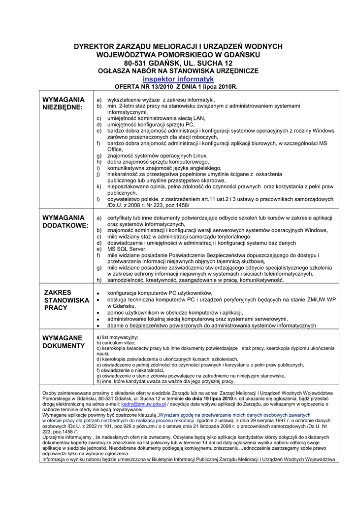 DYREKTOR ZARZĄDU MELIORACJI I URZĄDZEŃ WODNYCH WOJEWÓDZTWA POMORSKIEGO W GDAŃSKU 80-531 GDAŃSK, UL. SUCHA 12 OGŁASZA NABÓR NA STANOWISKA URZĘDNICZE inspektor informatyk OFERTA NR 13/2010 Z DNIA 1 lipca 2010R. WYMAGANIA NIEZBĘDNE: a) b) c) d) e) f) g) h) i) j) k) l) WYMAGANIA DODATKOWE: a) b) c) d) e) f) g) h) ZAKRES STANOWISKA PRACY WYMAGANE DOKUMENTY wykształcenie wyższe z zakresu informatyki, min. 2-letni staż pracy na stanowisku związanym z administrowaniem systemami informatycznymi, umiejętność administrowania siecią LAN, umiejętność konfiguracji sprzętu PC, bardzo dobra znajomość administracji i konfiguracji systemów operacyjnych z rodziny Windows zarówno przeznaczonych dla stacji roboczych, bardzo dobra znajomość administracji i konfiguracji aplikacji biurowych, w szczególności MS Office, znajomość systemów operacyjnych Linux, dobra znajomość sprzętu komputerowego, komunikatywna znajomość języka angielskiego, niekaralność za przestępstwa popełnione umyślnie ścigane z oskarżenia publicznego lub umyślne przestępstwo skarbowe, nieposzlakowana opinia, pełna zdolność do czynności prawnych oraz korzystania z pełni praw publicznych, obywatelstwo polskie, z zastrzeżeniem art.11 ust.2 i 3 ustawy o pracownikach samorządowych /Dz.U. z 2008 r. Nr.223, poz.1458/ certyfikaty lub inne dokumenty potwierdzające odbycie szkoleń lub kursów w zakresie aplikacji oraz systemów informatycznych, znajomość administracji i konfiguracji wersji serwerowych systemów operacyjnych Windows, mile widziany staż w administracji samorządu terytorialnego, doświadczenie i umiejętności w administracji i konfiguracji systemu baz danych MS SQL Server, mile widziane posiadanie Poświadczenia Bezpieczeństwa dopuszczającego do dostępu i przetwarzania informacji niejawnych objętych tajemnicą służbową, mile widziane posiadanie zaświadczenia stwierdzającego odbycie specjalistycznego szkolenia w zakresie ochrony informacji niejawnych w systemach i sieciach teleinformatycznych, samodzielność, kreatywność, zaangażowanie w pracę, komunikatywność. konfiguracja komputerów PC użytkowników, obsługa techniczna komputerów PC i urządzeń peryferyjnych będących na stanie ZMiUW WP w Gdańsku, pomoc użytkownikom w obsłudze komputerów i aplikacji, administrowanie lokalną siecią komputerową oraz systemami serwerowymi, dbanie o bezpieczeństwo powierzonych do administrowania systemów informatycznych a) list motywacyjny; b) curiculum vitae; c) kserokopia świadectw pracy lub inne dokumenty potwierdzające staż pracy, kserokopia dyplomu ukończenia nauki, d) kserokopia zaświadczenia o ukończonych kursach, szkoleniach, e) oświadczenie o pełnej zdolności do czynności prawnych i korzystaniu z pełni praw publicznych, f) oświadczenie o niekaralności, g) oświadczenie o stanie zdrowia pozwalające na zatrudnienie na niniejszym stanowisku, h) inne, które kandydat uważa za ważne dla jego przyszłej pracy. Osoby zainteresowane prosimy o składanie ofert w siedzibie Zarządu lub na adres: Zarząd Melioracji i Urządzeń Wodnych Województwa Pomorskiego w Gdańsku, 80-531 Gdańsk, ul. Sucha 12 w terminie do dnia 19 lipca 2010 r. od ukazania się ogłoszenia, bądź przesłać drogą elektroniczną na adres e-mail: [email protected] / decyduje data wpływu aplikacji do Zarządu, po wskazanym w ogłoszeniu o naborze terminie oferty nie będą rozpatrywane/ Wymagane aplikacje powinny być opatrzone klauzulą „Wyrażam zgodę na przetwarzanie moich danych osobowych zawartych w ofercie pracy dla potrzeb niezbędnych do realizacji procesu rekrutacji zgodnie z ustawą z dnia 29 sierpnia 1997 r. o ochronie danych osobowych /Dz.U. z 2002 nr 101, poz.926 z późn.zm./ o z ustawą dnia 21 listopada 2008 r. o pracownikach samorządowych /Dz.U. Nr 223, poz.1458 /”. Uprzejmie informujemy , że nadesłanych ofert nie zwracamy. Odsyłane będą tylko aplikacje kandydatów którzy dołączyli do składanych dokumentów kopertę zwrotną ze znaczkiem na list polecony lub w terminie 14 dni od daty ogłoszenia wyniku naboru odbiorą swoje aplikacje w siedzibie jednostki. Nieodebrane dokumenty podlegają komisyjnemu zniszczeniu. Jednocześnie zastrzegamy sobie prawo odpowiedzi tylko na wybrane ogłoszenia. Informacja o wyniku naboru będzie umieszczona w Biuletynie Informacji Publicznej Zarządu Melioracji i Urządzeń Wodnych Województwa Pomorskiego w Gdańsku (http://bip.zmiuw.gda.pl) oraz na tablicy ogłoszeń w siedzibie Zarządu.