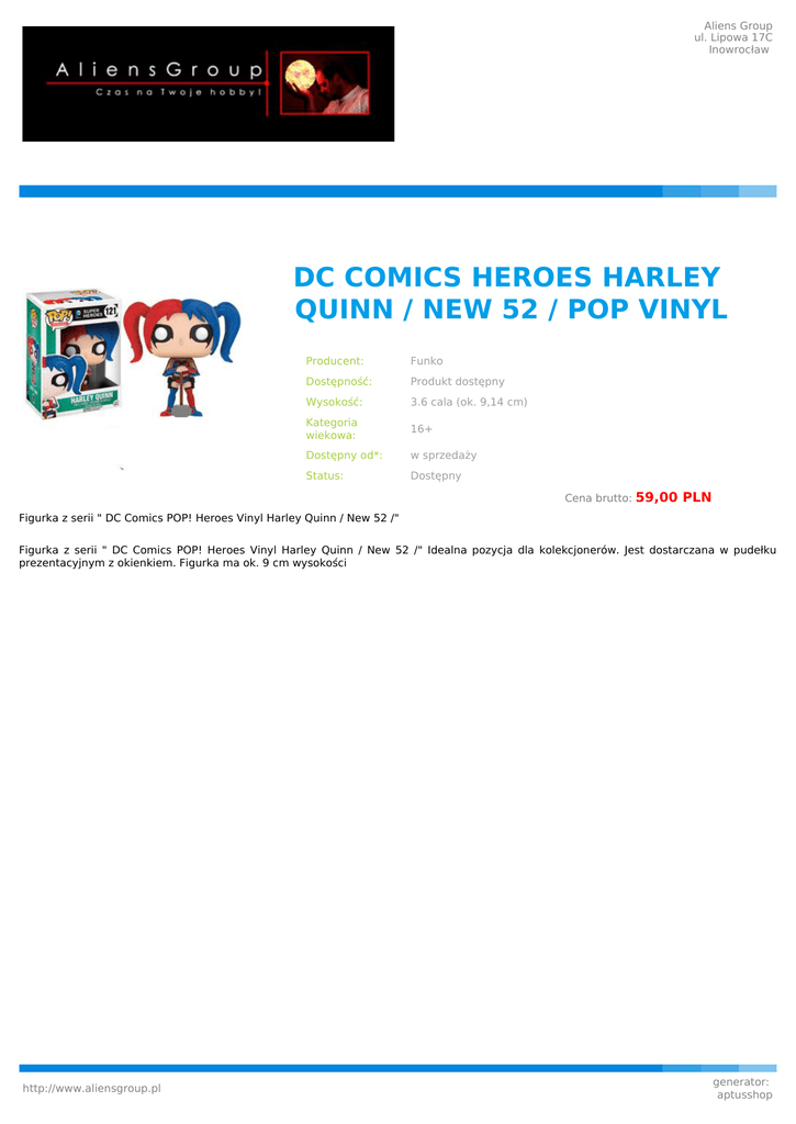 Aliens Group ul. Lipowa 17C Inowrocław DC COMICS HEROES HARLEY QUINN / NEW 52 / POP VINYL Producent: Funko Dostępność: Produkt dostępny Wysokość: 3.6 cala (ok. 9,14 cm) Kategoria wiekowa: 16+ Dostępny od*: w sprzedaży Status: Dostępny Cena brutto: 59,00 PLN Figurka z serii " DC Comics POP! Heroes Vinyl Harley Quinn / New 52 /" Figurka z serii " DC Comics POP! Heroes Vinyl Harley Quinn / New 52 /" Idealna pozycja dla kolekcjonerów. Jest dostarczana w pudełku prezentacyjnym z okienkiem. Figurka ma ok. 9 cm wysokości http://www.aliensgroup.pl generator: aptusshop