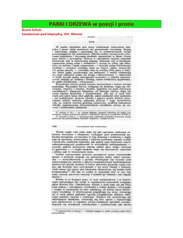 PARKI I DRZEWA w poezji i prozie Bruno Schulc Sanatorium pod klepsydrą. XVI Wiosna Bruna Schulc Opowiadania. Wybór esejów i listów. ZN imienia Ossolińskich. Kraków 2000 Włodzimierz Scisłowski Zbiór wierszy dla dzieci Dzień Drzewa Leopold Staff. Szum drzew S. Mrowiński lustracja książki J.Witkoń ilustracja wiersza Antoni Łange Dąb. Jerzy Wiśniewki, Bohdan Kiełczewski .Kulturotwórcza rola lasu.WARim.Cieszkowskiego.Poznań2004 Łotewski poeta-myśliciel Fricis Bard, przetłumaczył Stanisław Czerniak. Drzewo życia. Jarosław Marek Rymkiewicz Znak niejasny, baśń półżywa. PIW, Warszawa 1999 Moi przyjaciele tu to są wróbelki I przyjazny jest im żywioł wszelki …… Jeden strach i sny nasze jedne O wróbelki przyjaciele moje biedne …… Czarny ślimak i rudy rudzik O istnienie jak ono się trudzi …” Leopold Staff Pochwał piękna istnienia. „…… Żywim rój ptaków, co budzi Z snu nas z rannym powiewem, Ucząc nas iść między ludzi Z dobrą nowiną i śpiewem. …..” Wiersze Leopolda Staffa.WSziP, Warszawa 1987 Leopold Staff Wysokie drzewa. O, cóż jest piękniejszego niż wysokie drzewa, W brązie zachodu kute wieczornym promieniem, Nad wodą, co się pawich barw blaskiem rozlewa, Pogłębiona odbitych konarów sklepieniem. …. Z wolna wszystko umilka, zapada w krą głusza I zmierzch ciemnością smukłe korony drzewa, Z których widmami rośnie wyzwolona dusza… O, cóż jest piękniejszego niż wysokie drzewa. Wiersze Leopolda Staffa. WsziP. Warszawa 1987 JM Rymkiewicz Ogród w Milanówku Idą dokądś ślimaki – mają cel lub nie. Czarne i purpurowe jak w okropnym śnie Śni mi się jarzębina jeśli coś się śni Same się otwierają niewidzialne drzwi ….” Czesław Miłosz Do leszczyny. … Kochałem twoją korę, brązową z białym nalotem, Koloru najzupełniej leszczynowego. Radują mnie te, co przetrwały, dęby i jesiony, Aby ty ucieszyłaś mnie najbardziej, Jak zawsze czarodziejska, z perłami twoich orzechów, Z pokolenia wiewiórek , które w tobie tańczyły….” Cz.Miłosz „to”