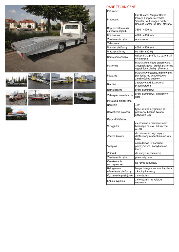 DANE TECHNICZNE Podwozie Producent Fiat Ducato, Peugeot Boxer, Citroen Jumper, Mercedes Sprinter, Volkswagen Crafter, Renault Master lub Opel Movano Dopuszczalna masa całkowita pojazdu 3500 - 4000 kg Rozstaw osi 4000 - 4300 mm Zawieszenie tylne resorowane Zabudowa Wymiar platformy 4000 - 4300 mm Waga platformy ok. 430- 630 kg Rama pomocnicza wykonana z profilu C , spawana i cynkowana Platforma blacha aluminiowa otworowana, antypoślizgowa, środek platformy wypełniony blachą ryflowaną Podjazdy blacha otworowana, montowane pomiędzy lub w podłodze w zależności od budowy Błotniki z tworzywa ABS, z osłoną przeciwbłotną Rama boczna profil aluminiowy Zabezpieczenie boczne profil aluminiowy, składany w górę Instalacja elektryczna Napięcie 12V Oświetlenie pojazdu tylne światła oryginalne od podwozia, boczne światła obrysowe LED Opcje dodatkowe Wciągarka elektryczna z mechanizmem bocznego posuwu lub ręczna AL-KO Zaczep kulowy do holowania przyczepy z dostoswanym naciskiem na kulę haka Skrzynka narzędziowa , z zamkiem pojedynczym , zamykana na klucz Zbiornik do wody z mydelniczką Zawieszenie tylne pneumatyczne Oznakowanie ostrzegawcze na ramie zabudowy Halogenowe oświetlenie platformy lampa halogenowa uruchamiana z kabiny kierowcy Ogrzewanie postojowe z montażem Kabina sypialna z montażem , w kolorze nadwozia