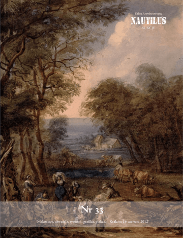 Salon Antykwaryczny AUKCJE Nr 33 Malarstwo, akwarela, rysunek, grafika, plakat. Kraków, 16 czerwca 2012 Salon Antykwaryczny AUKCJE AUKCJA NR 33 Malarstwo, akwarela, rysunek, grafika, plakat WYSTAWA PRZEDAUKCYJNA 11 - 15 VI 2012 Salon Antykwaryczny Nautilus, ul. Pijarska 5/2a, Kraków AUKCJA Sobota, 16 VI 2011, godzina 1200 Sala Rycerska, Restauracja „Miód i Wino”, ul. Sławkowska 32, Kraków Salon Antykwaryczny Michał Maksymiuk, Maciej Żywolewski ul. Pijarska 5/2a 31-015 Kraków tel.: + 48 12 422 91 60 fax: + 48 12 432 94 40 kom.: 0048 695899895 e-mail: [email protected] www.antique.com.pl; www.artlist.pl; www.nautilus-art.pl BANK PEKAO S.A. III O/ KRAKÓW Nr konta: 46124022941111000037089120 OPRACOWANIE KATALOGU: Michał Maksymiuk, Roman Marcinek, Maciej Żywolewski Aleksandra Madej, Agnieszka Mazoń SKŁAD: Aleksandra Madej, Maciej Żywolewski ZDJĘCIA: Agnieszka Mazoń, Maciej Żywolewski DRUK: Pierwsza strona okładki: Zabiełło Henryk, poz. 51. (fragment) Czwarta strona okładki: Wyczółkowski Leon, poz. 7. COPYRIGHT: © Nautilus Salon Antykwaryczny 2012 Katalog aukcyjny, wszelkie zawarte w nim opisy, zdjęcia i biogramy, podlegają ochronie na podstawie ustawy o prawie autorskim i prawach pokrewnych. Jakiekolwiek kopiowanie, reprodukowanie i rozpowszechnianie katalogu w całości lub części bez uprzedniej zgody Salonu Antykwarycznego NAUTILUS stanowi naruszenie praw majątkowych zagrożone odpowiedzialnością cywilną i karną. poz. 16 Zawartość katalogu I. II. III. IV. V. VI. Malarstwo, akwarela poz. Rysunek poz. Grafika dawna poz. Grafika XX wieku poz. Plakat poz. Indeks 1-76 77-106 107-141 142-270 262-284 s. 58 Reprodukcje wszystkich prac można zobaczyć na stronie internetowej www.artlist.pl W ramach prac jednego artysty w katalogu została zachowana chronologiczna kolejność dzieł Malarstwo, akwarela 6| 1. Pieniążek Józef Sandomierz. Kaplica przy kościele św. Jakuba, 1925 Tusz lawowany, karton; wym.: 49,2 x 35,5 cm; sygn. p.d.: Józef Pieniążek / Sandomierz 1925. Cena wyw.: 2500 2. Rembowski Jan Mała góralka, ok. 1910 Pastel, karton; wym. w świetle pp: 58 x 42,5 cm; sygn. p.d.: J.R / Zakopane. Cena wyw.: 2000 3. Sozański Michał Bawarczyk palący fajkę, 1910 Akwarela, karton autorsko naklejony na tekturę; wym.: 29 x 22,5 cm; sygn. p.g.: M. Sozański 1910. Cena wyw.: 1000 4. Weiss Irena „Aneri” Pejzaż górski, 1960 Olej, tektura; wym.: 65,5 x 50,5 cm; sygn. p.d.: aneri. Lit.: „Irena i Wojciech Weiss”, katalog wystawy, Łaziska Dolne 2011, poz. 62. Cena wyw.: 7800 5. Pieniążek Józef Panorama Sandomierza z Bramą Opatowską, 1925 Tusz lawowany, karton; wym.: 49,2 x 31,5 cm; sygn. p.d.: Józef Pieniążek / Sandomierz 1925. Widok od strony ogrodów SS. Bernardynek, z lewej kościół Św. Ducha. Cena wyw.: 2500 | Malarstwo, akwarela | Rysunek | Grafika dawna | Grafika XX wieku | Plakat | Indeks | 6. Pieniążek Józef Kapitularz opactwa w Koprzywnicy, 1925 Tusz lawowany, karton; wym.: 35,5 x 49,7 cm; sygn. p.d.: Józef Pieniążek / Koprzywnica 1925. W centrum lapidarium słynny zwornik z heraldycznym orłem, wiązany z osobą Kazimierza Sprawiedliwego. Cena wyw.: 2500 7. Wyczółkowski Leon Kwiaty. Ranek, 1928 Akwarela, kredka, ołówek, karton; wym. w świetle pp: 68,5 x 48,5 cm; sygn. l.d.: LWyczół / 1928 r. Na odwrocie naklejka wystawowa z warszawskiej Zachęty (1933) z opisem pracy. Cena wyw.: 26 500 |7 Aukcja nr 33 8. Zakrzewski Władysław Kwiaciarki na Rynku w Krakowie, koniec lat 20. XX w. Olej, płótno; wym.: 54 x 69 cm; sygn. l.d.: Zakrzewski. Cena wyw.: 4000 9. Czajkowski Stanisław Sad, koniec lat 20. XX w. Olej, tektura; wym.: 26,7 x 33,2 cm; sygn. p.d.: CZAJKOWSKI. Cena wyw.: 3800 10. Setkowicz Adam Gęsi, lata 20. XX w. Olej, tektura; wym.: 34,7 x 40,3 cm; sygn. l.d.: A. Setkowicz. Cena wyw.: 3800 11. Borysowski Stanisław Pejzaż z torami kolejowymi, przed 1939 Olej, płótno; wym.: 62 x 70 cm; sygn. p.d.: Borysowski. Cena wyw.: 12 000 8| 13. Weiss Wojciech Wenecja. Widok na kościół Santa Maria Della Salute, ok. 1932 Olej, płótno; wym.: 50,5 x 64 cm; sygn. p.d. monogramem wiązanym: WW. Na odwrocie stempel z numerem. Lit.: „Wojciecha Weissa krajobrazy Wenecji”, Kraków 2012, s. 130; „Irena i Wojciech Weiss”, katalog wystawy, Łaziska Dolne 2011, poz. 93. Cena wyw.: 39 000 | Malarstwo, akwarela | Rysunek | Grafika dawna | Grafika XX wieku | Plakat | Indeks | 12. Kossak Jerzy Polowanie par force, 1923 Olej, tektura; wym.: 40,5 x 61 cm; sygn. l.d.: Jerzy Kossak 1923. Cena wyw.: 12 000 14. Kossak Jerzy Nad Bałtykiem [Patrol ułański], 1942 Olej, tektura; wym.: 35 x 50 cm; sygn. l.d.: Jerzy Kossak / 1942. Praca po konserwacji. Cena wyw.: 8500 |9 Aukcja nr 33 15. Hofman Vlastimil Wizja – Polonia, 1914 Olej, tektura autorsko naklejona na deskę; wym.: 48,6 x 67,4 cm; sygn. l.g.: Vl Hofmann ‘914; na odwrocie naklejka z Salonu Wiosennego TPSP w Krakowie w 1914 roku oraz owalna pieczęć magazynu przyborów malarskich R. Aleksandrowicza w Krakowie. Najwcześniejsza znana wersja Polonii autorstwa Hofmana – kolejne pochodzą z roku 1915 oraz 1916. Obraz powstał jeszcze przed wybuchem I Wojny Światowej – w innych znanych pracach, powstałych już w trakcie wojny, autoportret artysty został zastąpiony postacią żołnierza. Cena wyw.: 55 000 10 | 17. Gleich Leon Lwów. Cerkiew św. Jura od strony Przedmieścia Gródeckiego, 1924 Olej, papier autorsko naklejony na płótno i karton; wym.: 24 x 34 cm; sygn., tyt. i dat.: Widok na Jur/L.Gleich (ołówkiem) 924. Lit.: SAP, t. II, s. 356. Cena wyw.: 3200 | Malarstwo, akwarela | Rysunek | Grafika dawna | Grafika XX wieku | Plakat | Indeks | 16. Wyczółkowski Leon Kwiaty w wazonie Akwarela, papier autorsko naklejony na tekturę; wym.: 20,5 x 29,5 cm; sygn. oł. p.d.: LWyczół. Kompozycja zbliżona jest do akwareli Kwiaty w doniczkach z 1931 roku (reprodukowanej w katalogu „Leon Wyczółkowski 1852-1936. W 150. rocznicę urodzin artysty”, Kraków 2003, poz. 