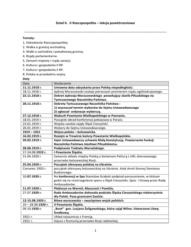 Dział II. II Rzeczpospolita – lekcja powtórzeniowa _________________________________________________________________________________ Tematy: 1. Odrodzenie Rzeczypospolitej. 2. Walka o granicę wschodnią. 3. Walki o zachodnia i południową granicę. 4. Rządy parlamentarne. 5. Zamach majowy i rządy sanacji. 6. Kultura i gospodarka II RP. 7. Kultura i gospodarka Ii RP. 8. Polska w przededniu wojny. Daty Data Wydarzenie 11.11.1918 r. Umowna data odzyskania przez Polskę niepodległości. 18.11.1918 r. Jędrzej Moraczewski zostaje pierwszym premierem rządu ogólnokrajowego. 22.11.1918 r. Dekret Jędrzeja Moraczewskiego powołujący Józefa Piłsudskiego na Tymczasowego Naczelnika Państwa. 28.11.1918 r. Dekrety Tymczasowego Naczelnika Państwa : 1) wyznaczał termin wyborów do Sejmu Ustawodawczego 2) ogłaszał ordynacje wyborczą. 27.12.1918 r. Wybuch Powstania Wielkopolskiego w Poznaniu. 18.01.1919 r. Początek obrad konferencji pokojowej w Paryżu 23.01.1919 r. Wojska czeskie zajęły Śląsk Cieszyński. 26.01.1919 r. Wybory do Sejmu Ustawodawczego. 1919 – 1921 Wojna polsko – bolszewicka. 16.02.1919 r. Rozejm w Trewirze kończy Powstanie Wielkopolskie. 20.02.1919 r. Sejm Ustawodawczy uchwala Małą Konstytucję. Powierzenie funkcji Naczelnika Państwa Józefowi Piłsudskiemu. 28.06.1919 r. Podpisanie Traktatu Wersalskiego. 17-24.08.1919 r. I Powstanie Śląskie. 21.04.1920 r. Zawarcie układu między Polską a Semenem Petlurą z URL skierowanego przeciwko bolszewickiej Rosji. 25.04.1920 r. Początek ofensywy polskiej na Ukrainie. Czerwiec 1920 r. początek ofensywy bolszewickiej na Ukrainie. Atak Armii Konnej Siemiona Budionnego. 10.07.1920 r. Na konferencji w Spa Stanisław Grabski podpisał porozumienie, w którym godzi się na rozstrzygniecie sporu o Śląsk Cieszyński, Spisz i Orawę przez Radę Ambasadorów. 11.07.1920 r. Plebiscyt na Warmii, Mazurach i Powiślu. 27.07.1920 r. Rada Ambasadorów dokonała podziału Śląska Cieszyńskiego niekorzystnie dla Polski. Poza granicami Zaolzie. 12-15.08.1920 r. Bitwa warszawska – zwycięstwo wojsk polskich. 19 – 28.08.1920 r. II Powstanie Śląskie. 09.10.1920 r. „Bunt” gen. Lucjana Żeligowskiego, który zajął Wilno. Utworzono Litwę Środkową. 1921 r. Układ sojuszniczy z Francją. 1921 r. Sojusz z Rumunią przeciwko Rosji radzieckiej. 1 17.03.1921 r. Uchwalenie przez Sejm Ustawodawczy konstytucji marcowej. Polska republiką o ustroju demokracji parlamentarnej. 18.03.1921 r. Traktat pokojowy z Rosja bolszewicką w Rydze (tzw. traktat ryski). 20.03.1921 r. Plebiscyt na Górnym Śląsku. 3.05. – 5.08.1921 r. III Powstanie Śląskie. Październik 1921 r. Rada Ambasadorów podejmuje decyzje o podziale Górnego Śląska. 09.12.1922 r. Wybory prezydenckie. Pierwszym prezydentem II RP Gabriel Narutowicz. 16.12.1922 r. Eligiusz Niewiadomski zamordował Prezydenta RP Gabriela Narutowicza. 20.12.1922 r. Wybory prezydenckie. Drugim Prezydentem II RP zostaje Stanisław Wojciechowski. Listopad 1923 r. Krwawo stłumione powstanie robotników w Krakowie. Upadek rządu Chjeno – Piasta. Listopad 1923 – Rządy pozaparlamentarnego rządu Władysława Grabskiego. 1925 r. 1924 r. Reforma walutowa. Wprowadzono złoty polski. 1925 r. Reforma rolna Władysława Grabskiego. 1925 r. Zawarcie przez rząd Grabskiego konkordatu z Watykanem. 1925 r. Wybuch wojny celnej z Niemcami 12-14.05.1926 r. Przewrót majowy. 01.06.1926 r. Trzecim Prezydentem RP zostaje Ignacy Mościcki. 02.08.1926 r. Nowela sierpniowa. Umocnienie władzy wykonawczej. 1927 r. Powstanie BBWR 1929 - 1935 Wielki kryzys ekonomiczny na ziemiach polskich. Listopad 1930 r. Wybory brzeskie. 1932 r. Polska i ZSRR podpisały pakt o nieagresji. 1934 r. Podpisano polsko – niemiecką deklaracje o niestosowaniu przemocy. 23.04.1935 r. Uchwalenie konstytucji kwietniowej. 12.05.1935 r. Śmierć Jozefa Piłsudskiego. 1936 r. Rozpoczęto budowę COP. 29-30.09.1938 r. Konferencja w Monachium 02.10.1938 r. Wojska polskie zajmują Zaolzie. 21.03.1939 r. III Rzesza wysunęła kategoryczne żądania w stosunku do Polski. 28.04.1939 r. III Rzesza wypowiedziała Polsce pakt o nieagresji. 23.08.1939 r. Układ Ribbentrop – Mołotow, układ o nieagresji między ZSRR a III Rzeszą, do którego dołączono tajne protokoły o podziale stref wpływów w przypadku wojny. 25.08.1939 r. Podpisanie polsko – brytyjskiego układu o wzajemnej pomocy w przypadku agresji niemieckiej. 2. Postacie Postać Roman Dmowski Jędrzej Moraczewski Józef Piłsudski Opis Polityk i jeden z założycieli Narodowej Demokracji. Główny ideolog endecji. Członek Komitetu Narodowego Polskiego w Paryżu. Reprezentował Polskę podczas konferencji pokojowej w Paryżu. Polityk PPS. Pierwszy premier II RP. Wydał dekrety socjalne. Powołał Jozefa Piłsudskiego na stanowisko Tymczasowego Naczelnika Państwa. Marszałek Polski. Twórca Legionów Polskich podczas I wojny światowej. Tymczasowy Naczelnik Państwa, a od lutego 1919 r. 2 Ignacy Daszyński Wincenty Witos Wojciech Korfanty Ignacy Jan Paderewski Semen Petlura Władysław Grabski Siemion Budionny Michaił Tuchaczewski Feliks Dzierżyński Julian Marchlewski Lucjan Żeligowski Stanisław Taczak Józef Dowbor Muśnicki Kazimierz Bartel Ignacy Mościcki Walery Sławek Edward Rydz Śmigły Józef Beck Eugeniusz Kwiatkowski Stanisław Wojciechowski Gabriel Narutowicz Naczelnik Państwa. Przeprowadził zamach majowy przejmując władzę w 1926 r. Jeden z przywódców PPS. Stał na czele Tymczasowego Rządu Ludowego Republiki Polskiej, który powstał w Lublinie 6/7.11.1918 r. Przywódca PSL – Piast. Stał na czele Polskiej Komisji Likwidacyjnej w Krakowie. Premier polski w1923 i 1926 r. gdy stał na czele Chjeno – Piasta/ Przywódca Polskiego Stronnictwa Chrześcijańskiej Demokracji. Przed odzyskaniem niepodległości stał na czele Naczelnej Rady Ludowej w Poznaniu. Stał na czele powstań śląskich. Wielki polski pianista i kompozytor. Mąż stanu. Członek KN