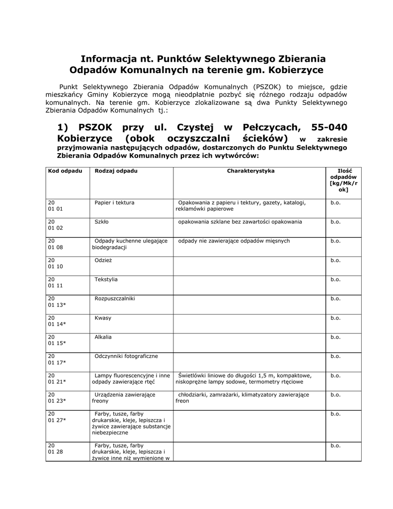 Informacja nt. Punktów Selektywnego Zbierania Odpadów Komunalnych na terenie gm. Kobierzyce Punkt Selektywnego Zbierania Odpadów Komunalnych (PSZOK) to miejsce, gdzie mieszkańcy Gminy Kobierzyce mogą nieodpłatnie pozbyć się różnego rodzaju odpadów komunalnych. Na terenie gm. Kobierzyce zlokalizowane są dwa Punkty Selektywnego Zbierania Odpadów Komunalnych tj.: 1) PSZOK Kobierzyce przy ul. Czystej w (obok oczyszczalni Pełczycach, 55-040 ścieków) w zakresie przyjmowania następujących odpadów, dostarczonych do Punktu Selektywnego Zbierania Odpadów Komunalnych przez ich wytwórców: Kod odpadu Rodzaj odpadu 20 01 01 Papier i tektura 20 01 02 Szkło 20 01 08 Odpady kuchenne ulegające biodegradacji Charakterystyka Ilość odpadów [kg/Mk/r ok] Opakowania z papieru i tektury, gazety, katalogi, reklamówki papierowe b.o. opakowania szklane bez zawartości opakowania b.o. odpady nie zawierające odpadów mięsnych b.o. 20 01 10 Odzież b.o. 20 01 11 Tekstylia b.o. 20 01 13* Rozpuszczalniki b.o. 20 01 14* Kwasy b.o. 20 01 15* Alkalia b.o. 20 01 17* Odczynniki fotograficzne b.o. 20 01 21* Lampy fluorescencyjne i inne odpady zawierające rtęć Świetlówki liniowe do długości 1,5 m, kompaktowe, niskoprężne lampy sodowe, termometry rtęciowe b.o. 20 01 23* Urządzenia zawierające freony chłodziarki, zamrażarki, klimatyzatory zawierające freon b.o. 20 01 27* Farby, tusze, farby drukarskie, kleje, lepiszcza i żywice zawierające substancje niebezpieczne b.o. 20 01 28 Farby, tusze, farby drukarskie, kleje, lepiszcza i żywice inne niż wymienione w b.o. 20 01 27 20 01 32 Leki inne niż wymienione w 20 01 31 20 01 33* Baterie i akumulatory łącznie z bateriami i akumulatorami wymienionymi w 16 06 01, 16 06 02 lub 16 06 03 oraz niesortowane baterie i akumulatory zawierające te baterie b.o. 20 01 34 Baterie i akumulatory inne niż wymienione w 20 0133 b.o. 20 01 35* Zużyte urządzenia elektryczne i elektroniczne inne niż wymienione w 20 01 21 i 20 01 23 zawierające niebezpieczne składniki monitory, telewizory, laptopy, notebooki, kalkulatory, kieszonkowe konsole do gier, urządzenia elektryczne z wyświetlaczem LCD lub plazmowym b.o. 20 01 36 Zużyte urządzenia elektryczne i elektroniczne inne niż wymienione w 20 01 21, 20 01 23 i 20 01 35 pralki, piekarniki, suszarki do ubrań, zmywarki, mikrofalówki, sprzęt audio, kamery, aparaty fotograficzne, telefony komórkowe, telefony stacjonarne, maszyny do szycia, opiekacze, tostery, komputery, drukarki, maszyny do pisania, wentylatory elektryczne, grzejniki elektryczne, termostaty, chłodziarki, zamrażarki, klimatyzatory nie zawierające freonu, odkurzacze, żelazka, inne urządzenia kuchenne, inne urządzenia elektryczne niezawierające substancji niebezpiecznych b.o. 20 01 38 Drewno inne niż wymienione w 20 01 37 20 01 39 Tworzywa sztuczne 20 01 40 Metale 20 02 01 Odpady ulegające biodegradacji z ogrodów i parków 20 03 07 Wielkogabarytowe - meble 20 03 07 Wielkogabarytowe z metalu 16 01 03 Opony 16 80 01 Magnetyczne i optyczne nośniki informacji 13 02 08* Inne oleje silnikowe, przekładniowe i smarowe 15 01 10* Opakowania zawierające pozostałości substancji Wszystkie leki, z wyjątkiem leków cytotoksycznych i cytostatycznych drewno nie zawierające substancje niebezpieczne tworzywa sztuczne nie zanieczyszczone, nie zawierające ceramiki, szkła, metalu, gumy b.o. b.o. b.o. b.o. części roślin z ogrodów i parków meble, meble tapicerowane, okna, wanny, brodziki z tworzyw sztucznych grzejniki, felgi, wanny żeliwne opony samochodowe o średnicy nie przekraczającej 56 cm płytki CD, DVD oleje hydrauliczne, przekładniowe, smarowe mineralne i syntetyczne opakowania po substancjach niebezpiecznych b.o. b.o. b.o. b.o. b.o. b.o. b.o. niebezpiecznych lub nimi zanieczyszczone (np. środkami ochrony roślin I i II klasy toksycznościbardzo toksyczne i toksyczne) 15 01 11* Opakowania z metali zawierające niebezpieczne porowate elementy wzmocnienia konstrukcyjnego (np. azbest), włącznie z pustymi pojemnikami ciśnieniowymi 08 03 18 Odpadowy toner drukarski inny niż wymieniony w 08 03 17 17 03 80 17 06 04 Odpadowa papa Materiały izolacyjne inne niż wymienione w 17 06 01 i 17 06 03 opakowania ciśnieniowe po substancjach niebezpiecznych b.o. b.o. papa budowlana pochodzenia komunalnego b.o. styropian izolacyjny pochodzenia komunalnego b.o. b.o. - bez ograniczeń REGULAMIN KORZYSTANIA Z PUNKTU SELEKTYWNEGO ZBIERANIA ODPADÓW KOMUNALNYCH zlokalizowanego w Pełczycach, przy ul. Czystej (obok oczyszczalni ścieków) W Punkcie Selektywnego Zbierania Odpadów Komunalnych (PSZOK) przyjmowane są odpady komunalne oraz inne odpady z gospodarstw domowych z przeznaczeniem do unieszkodliwiania lub odzysku. I. Zasady ogólne: 1. Przyjęcia odpadów, dostarczonych przez mieszkańca lub właściciela nieruchomości, dokonuje upoważniony pracownik obsługujący PSZOK. 2. Przyjęcia dokonuje się po sprawdzeniu zawartości dostarczonych odpadów, ich zgodności z wykazem przyjmowanych aktualnie odpadów, ich czystości, składu, zabezpieczenia, itp. 3. Korzystający z PSZOK zobowiązani są do bezwzględnego przestrzegania regulaminu i poleceń pracownika Punktu. II. Ustalenia szczegółowe: 1. W PSZOK-u przyjmowane są odpady w środę w godzinach od 9.00 do 18.00 i w soboty od 9.00 do 18.00. 2. W PSZOK-u przyjmowane są odpady komunalne tylko od mieszkańców gminy Kobierzyce. 3. Odpady dostarczone do PSZOK-u muszą być posegregowane. 4. Dostarczone odpady nie mogą być zmieszane i zanieczyszczone innymi odpadami. 5. Odpady niebezpieczne płynne powinny znajdować się w oryginalnych opakowaniach producenta. Opakowania powinny posiadać etykiety i nie powinny być uszkodzone. 6. Do PSZOK-u przyjmowane są wyłącznie odpady wymienione w Załączniku nr 1 do uchwały w sprawie określenia szczegółowego sposobu i zakresu świadczenia usług w zakresie odbierania odpadów komunalnych od właścicieli nieruchomości i zagospodar
