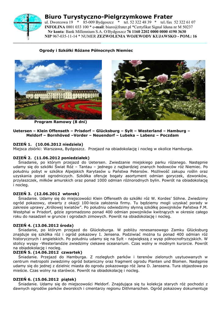 Biuro Turystyczno-Pielgrzymkowe Frater ul. Dworcowa 19 * 85-009 Bydgoszcz * tel. 52 322 48 39 * tel./fax 52 322 61 07 INFOLINA 0801 033 100 * e-mail: [email protected] *Certyfikat Signal Iduna nr M 50237 Nr konta: Bank Millennium S.A. O/Bydgoszcz 76 1160 2202 0000 0000 4190 3630 NIP 967-035-11-14 * NUMER ZEZWOLENIA WOJEWODY KUJAWSKO - POM.: 16 _______________________________________________________________________________________________ Ogrody i Szkółki RóŜane Północnych Niemiec Program Ramowy (8 dni) Uetersen – Klein Offenseth – Prisdorf – Glücksburg – Sylt – Westerland – Hamburg – Meldorf – Bornhöved –Vorder – Neuendorf – Lubeka – Labenz – Poczdam DZIEŃ 1. (10.06.2012 niedziela) Miejsca zbiórki: Warszawa, Bydgoszcz. Przejazd na obiadokolację i nocleg w okolice Hamburga. DZIEŃ 2. (11.06.2012 poniedziałek) Śniadanie, po którym przejazd do Uetersen. Zwiedzanie miejskiego parku róŜanego. Następnie udamy się do szkółki Świat RóŜ – Tantau – jednego z najbardziej znanych hodowców róŜ Niemiec. Po południu pobyt w szkółce Alpejskich Rarytasów u Państwa Petersów. MoŜliwość zakupu roślin oraz uzyskania porad ogrodniczych. Szkółka oferuje bogaty asortyment odmian goryczek, dzwonków, przylaszczek, miłków amurskich oraz ponad 1000 odmian róŜnorodnych bylin. Powrót na obiadokolację i nocleg. DZIEŃ 3. (12.06.2012 wtorek) Śniadanie. Udamy się do miejscowości Klein Offenseth do szkółki róŜ W. Kordes’ Söhne. Zwiedzimy ogród pokazowy, otwarty z okazji 100-lecia załoŜenia firmy. Tu będziemy mogli uzyskać porady w zakresie uprawy „Królowej kwiatów”. Po południu odwiedzimy słynną szkółkę powojników Państwa F.M. Westphal w Prisdorf, gdzie zgromadzono ponad 400 odmian powojników kwitnących w okresie całego roku do nasadzeń w gruncie i ogrodach zimowych. Powrót na obiadokolację i nocleg. DZIEŃ 4. (13.06.2012 środa) Śniadanie, po którym przejazd do Glücksburga. W pobliŜu renesansowego Zamku Glücksburg znajduje się szkółka róŜ i ogród pokazowy I. Jensena. Podziwiać moŜna tu ponad 400 odmian róŜ historycznych i angielskich. Po południu udamy się na Sylt - największą z wysp północnofryzyjskich. W stolicy wyspy -Westerlandzie zwiedzimy ciekawe oceanarium. Czas wolny w modnym kurorcie. Powrót na obiadokolację i nocleg. DZIEŃ 5. (14.06.2012 czwartek) Śniadanie. Przejazd do Hamburga. Z rozległych parków i terenów zielonych usytuowanych w centrum metropolii zwiedzimy ogród botaniczny oraz fragment ogrodu Planten und Blomen. Następnie udamy się do jednej z dzielnic miasta do ogrodu pokazowego róŜ Jana D. Janssena. Tura objazdowa po mieście. Czas wolny na starówce. Powrót na obiadokolację i nocleg. DZIEŃ 6. (15.06.2012 piątek) Śniadanie. Udamy się do miejscowości Meldorf. Znajdująca się tu kolekcja starych róŜ pochodzi z dawnych ogrodów parków dworskich i cmentarzy regionu Dithmarschen. Ogród pokazowy dokumentuje Biuro Turystyczno-Pielgrzymkowe Frater ul. Dworcowa 19 * 85-009 Bydgoszcz * tel. 52 322 48 39 * tel./fax 52 322 61 07 INFOLINA 0801 033 100 * e-mail: [email protected] *Certyfikat Signal Iduna nr M 50237 Nr konta: Bank Millennium S.A. O/Bydgoszcz 76 1160 2202 0000 0000 4190 3630 NIP 967-035-11-14 * NUMER ZEZWOLENIA WOJEWODY KUJAWSKO - POM.: 16 _______________________________________________________________________________________________ 400-letnią tradycję ogrodnictwa tego regionu. Z kolei zwiedzimy szkółkę z bogatą kolekcją bylin w miejscowości Bornhöved. Spacer po ogrodzie bylinowym oraz ogrodach tematycznych: Tajemniczy Ogród, Zielony Ogród, Leśny Ogród. Po południu udamy się do jednej z bardziej renomowanych szkółek starych róŜ i ogrodu pokazowego w Vorder - Neuendorf koło Itzehoe. Powrót na obiadokolację i nocleg. DZIEŃ 7. (16.06.2012 sobota) Śniadanie. Przejazd do Lubeki - „Królowej Hanzy”. Spacer po starówce - słynna Brama Holsztyńska, Kościół św. Marii, Dom Budenbrooków. Zwiedzimy atrakcyjne Muzeum Marcepana. Czas wolny. Po południu udamy się w okolice Labenz. Zwiedzimy park róŜany stowarzyszenia Lostbeauties zrzeszającego miłośników i kolekcjonerów starych róŜ. Następnie zobaczymy ogród róŜany Pfade und Wege Klary i Heinza Meins z bogatą kolekcją róŜ historycznych, współczesnych i ramblerów. Powrót na obiadokolację i nocleg. DZIEŃ 8. (17.06.2012 niedziela) Śniadanie. Przejazd do Poczdamu. Udamy się do kolebki stylu ogrodowego będącego pierwowzorem współczesnego ogrodu niemieckiego - Karla Foerstera. Wypracował on oryginalne podejście do obsadzeń, które wpłynęło na pokolenia ogrodników na całym świecie. Dzięki entuzjazmowi i samozaparciu Marianne Foerster będziemy mogli zakosztować wizji jej przodka, podziwiając ogród prawie takim, jakim był za jego Ŝycia. Szereg roślin znajdujących się w ogrodzie będziemy mogli zakupić w pobliskiej szkółce. Obiad poŜegnalny na terenie kraju. Dalszy przejazd powrotny. Zakończenie wycieczki. Termin: 10.- 17.06.2012 Cena: 1980zł Zapewniamy: - przejazd luksusowym autokarem wyposaŜonym w cafe bar, klimatyzację, DVD, WC - 7 noclegów w hotelach***, pokoje 2-3 osobowe z łazienkami - 7 śniadań, 7 obiadokolacji, 1 obiad - opiekę i informację turystyczną pilota - ubezpieczenie KL + Assistance wraz z KL chorób przewlekłych do 10 000 Euro i NNW do 2000 Euro Uwagi: - dokument niezbędny do wyjazdu: paszport lub dowód osobisty - program jest ramowy i moŜe ulec drobnym zmianom - na bilety wstępu do zwiedzanych obiektów i inne wydatki programowe naleŜy przeznaczyć kwotę ok.70 EURO