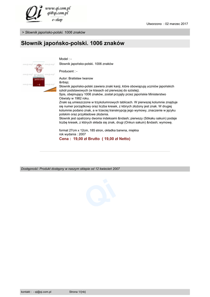 Utworzono : 02 marzec 2017 > Słownik japońsko-polski. 1006 znaków Słownik japońsko-polski. 1006 znaków Model : Słownik japońsko-polski. 1006 znaków Producent : Autor: Bratisław Iwanow Słownik japońsko-polski zawiera znaki kanji, które obowiązują uczniów japońskich szkół podstawowych (w klasach od pierwszej do szóstej). Spis, obejmujący 1006 znaków, został przyjęty przez japońskie Ministerstwo Oświaty w 1982 roku. Znaki są umieszczone w trzykolumnowych tablicach. W pierwszej kolumnie znajduje się numer porządkowy oraz liczba kresek, z których złożony jest znak. W drugiej kolumnie podano znak, a w trzeciej transkrypcję jego wymowy, znaczenie w języku polskim oraz przykładowe złożenia. Słownik jest opatrzony dwoma indeksami – pierwszy (Sōkaku sakuin) podaje liczbę kresek, z których składa się znak, drugi (Onkun sakuin) – wymowę. format 27cm x 12cm, 185 stron, okładka barwna, miękka rok wydania : 2007 Cena : 19,00 zł Brutto ( 19,00 zł Netto) Dostępność: Produkt dostępny w naszym sklepie od 12 kwiecień 2007 i Q kontakt : - [email protected] Strona 1/{nb}