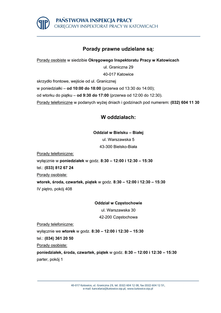 Porady prawne udzielane są: Porady osobiste w siedzibie Okręgowego Inspektoratu Pracy w Katowicach ul. Graniczna 29 40-017 Katowice skrzydło frontowe, wejście od ul. Granicznej w poniedziałki – od 10:00 do 18:00 (przerwa od 13:30 do 14:00); od wtorku do piątku – od 9:30 do 17:00 (przerwa od 12:00 do 12:30). Porady telefoniczne w podanych wyżej dniach i godzinach pod numerem: (032) 604 11 30 W oddziałach: Oddział w Bielsku – Białej ul. Warszawska 5 43-300 Bielsko-Biała Porady telefoniczne: wyłącznie w poniedziałek w godz. 8:30 – 12:00 i 12:30 – 15:30 tel.: (033) 812 67 24 Porady osobiste: wtorek, środa, czwartek, piątek w godz. 8:30 – 12:00 i 12:30 – 15:30 IV piętro, pokój 408 Oddział w Częstochowie ul. Warszawska 30 42-200 Częstochowa Porady telefoniczne: wyłącznie we wtorek w godz. 8:30 – 12:00 i 12:30 – 15:30 tel.: (034) 361 20 50 Porady osobiste: poniedziałek, środa, czwartek, piątek w godz. 8:30 – 12:00 i 12:30 – 15:30 parter, pokój 1 Oddział w Gliwicach ul. Mitręgi 2 44-100 Gliwice Porady telefoniczne: wyłącznie w środę w godz. 8:30 – 12:00 i 12:30 – 15:30 tel.: (032) 332 45 01 Porady osobiste: poniedziałek, wtorek, czwartek, piątek w godz. 8:30 – 12:00 i 12:30 – 15:30 parter, pokój 1 Oddział w Rybniku ul. Jadwigi i Feliksa Białych 7 44-200 Rybnik Porady telefoniczne: wyłącznie w czwartek w godz. 8:30 – 12:00 i 12:30 – 15:30 tel.: (032) 423 03 33 Porady osobiste: poniedziałek, wtorek, środa, piątek w godz. 8:30 – 12:00 i 12:30 – 15:30 I piętro, pokój 105 Oddział w Zawierciu ul. Okólna 10 42-400 Zawiercie Porady telefoniczne: wyłącznie w piątek w godz. 8:30 – 12:00 i 12:30 – 15:30 tel.: (032) 672 14 54 Porady osobiste: poniedziałek, wtorek, środa, czwartek w godz. 8:30 – 12:00 i 12:30 – 15:30