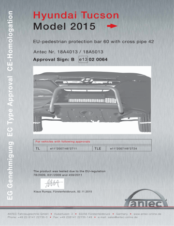EG Genehmigung EC Type Approval CE-Homologation Hyundai Tucson Model 2015 EU-pedestrian protection bar 60 with cross pipe 42 Antec Nr. 18A4013 / 18A5013 Approval Sign: B e13 02 0064 For vehicles with following approvals TL e11*2007/46*2711 TLE e11*2007/46*2724 The product was tested due to the EU-regulation 78/2009, 631/2009 and 459/2011 Klaus Rumpp, Fürstenfeldbruck, 02.11.2015 ANTEC Fahrzeugtechnik GmbH • Hubertusstr. 2 • 82256 Fürstenfeldbruck • Germany • www.antec-online.de Phone: +49 (0) 8141 22735-0 • Fax: +49 (0)8141 22735-149 • e-mail: [email protected] GRAND-DUCHÉ DE LUXEMBOURG SOCIÉTÉ NATIONALE DE CERTIFICATION ET D'HOMOLOGATION Ministère du Développement durable et des Infrastructures s.à r.l. Registre de Commerce: B 27180 Département des Transports L-5201 Sandweiler L-2938 Luxembourg Référence: e13*78/2009*631/2009B*0064*07 Annexes: - Rapport Technique - Fiche de Renseignements du constructeur Sandweiler, le 13 novembre 2015 FICHE DE RECEPTION CE PAR TYPE EC TYPE-APPROVAL CERTIFICATE Communication concernant: Communication concerning the: - la réception CE par type (1) EC type-approval (1) - l'extension de la réception CE par type (1) extension of EC type-approval (1) - le refus de la réception CE par type (1) refusal of EC type-approval (1) - le retrait de la réception CE par type (1) withdrawal of EC type-approval (1) d'un type de système de protection frontale à fournir comme entité technique distincte en application du règlement (CE) Nº 78/2009 du Parlement européen et du Conseil, tel que mis en œuvre par le règlement (CE) N° 631/2009 modifié en dernier lieu par le règlement (CE) Nº 631/2009 (2). of a type of frontal protection system to be supplied as a separate technical unit with regard to Regulation (EC) N° 78/2009 of the European Parliament and of the Council of 14 January 2009 as implemented by Regulation (EC) N° 631/2009 last amended by Regulation (EC) N° 631/2009 (2). Numéro de réception CE par type: e13*78/2009*631/2009B*0064*07 EC type-approval number: Motif de l'extension: - vehicle model added (18A). Reason for extension: SECTION I SECTION I 0.1. Marque (raison sociale du constructeur): Make (trade name of manufacturer): 0.2. Type: Type: ANTEC Fahrzeugtechnik GmbH B-Line Description(s) commerciale(s) générale(s): General commercial description(s): 0.3. Moyens d'identification du type, s'il est indiqué sur le système de protection frontale (3): Means of identification of type if marked on the frontal protection system (3): 0.3.1. see item 0.2 of manufacturer's information document Emplacement de ce marquage: Location of that marking: on manufacturer’s plate see item 0.7. Page 1 of 5 e13*78/2009*631/2009B*0064*07 0.5. Nom et adresse du constructeur: ANTEC Fahrzeugtechnik GmbH Im Brühl 78 D-74348 Lauffen a.N. Name and address of manufacturer: 0.7. Emplacement et mode d’apposition de la marque de réception CE: Location and method of the affixing of the EC approval mark: 0.8. see item 0.7. of manufacturer’s information document ACT METAL PLASTIK OTOMOTIV SAN. VE TIC. LTD. STI. Organize Sanayi Bolgesi Ataturk Mah. 8. SOK. No:9 Cerkezkoy-Tekirdag-Turkey Nom(s) et adresse(s) du ou des ateliers de montage: Name(s) and address(es) of assembly plant(s): ANTEC Fahrzeugtechnik GmbH Im Brühl 78 D-74348 Lauffen a.N. 0.9. Nom et adresse du mandataire du constructeur (le cas échéant): Name and address of the manufacturer’s representative (if any): not applicable SECTION II SECTION II 1. 2. Informations complémentaires: Additional information: see Addendum Autorité déléguée: Société Nationale de Certification et d'Homologation L-5201 Sandweiler Assigned authority: Service technique chargé d'effectuer les essais: Technical service responsible for carrying out the tests: 3. Date du procès-verbal d'essai: Date of test report: 4. Numéro du procès-verbal d'essai: Number of test report: 5. Remarques (le cas échéant): Remarks (if any): Luxcontrol SA B.P. 349 L-4004 Esch-sur-Alzette 11.11.2015 LCA 51 0566 003 15 see Addendum Page 2 of 5 e13*78/2009*631/2009B*0064*07 6. Lieu: Sandweiler Place: 7. Date: 13 novembre 2015 Date: 8. Signature: Signature: Pour le Département des Transports Pour la SNCH Marco FELTES Inspecteur Principal 1er en rang Claude LIESCH Directeur Annexes: - Information package; - Test report. Attachments: (see index to type-approval report) __________________ Biffer la mention inutile. (1) (2) (3) Delete where not applicable. Veuillez insérer le numéro du règlement modificatif. Insert number of amending Regulation. Si le moyen d'identification du type contient des caractères n’intéressant pas la description des types de véhicule, de composant ou d’entité technique couverts par la présente fiche, ces caractères doivent être remplacés par le symbole "?" dans la documentation (exemple ABC??123??). If the means of identification of type contains characters not relevant to describe the vehicle, component or separate technical unit types covered by this information, such characters shall be represented in the documentation by the symbol "?" (e.g. ABC??123??). Page 3 of 5 e13*78/2009*631/2009B*0064*07 Addendum Addendum à la fiche de réception CE par type N° e13*78/2009*631/2009B*0064*07 relative à la réception par type d’un type de système de protection frontale à fournir comme entité technique distincte en application du règlement n° 78/2009 to EC type-approval certificate N° e13*78/2009*631/2009B*0064*07 concerning the type-approval of a type of frontal protection system to be supplied as a separate technical unit with regard to Regulation (EC) N° 78/2009 1. Informations complémentaires Additional information 1.1. Méthode de fixation: see manufacturer’s information document Method of attachment: 1.2. Instructions d'assemblage et de montage: Assembly and mounting instructions: 1.3. Liste des véhicules sur lesquels le système de protection frontale peut être monté,