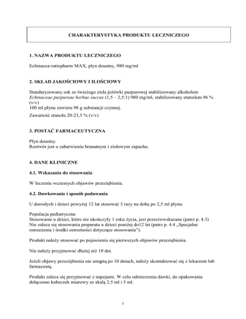 CHARAKTERYSTYKA PRODUKTU LECZNICZEGO 1. NAZWA PRODUKTU LECZNICZEGO Echinacea-ratiopharm MAX, płyn doustny, 980 mg/ml 2. SKŁAD JAKOŚCIOWY I ILOŚCIOWY Standaryzowany sok ze świeżego ziela jeżówki purpurowej stabilizowany alkoholem Echinaceae purpureae herbae succus (1,5 – 2,5:1) 980 mg/ml, stabilizowany etanolem 96 % (v/v) 100 ml płynu zawiera 98 g substancji czynnej. Zawartość etanolu 20-23,5 % (v/v) 3. POSTAĆ FARMACEUTYCZNA Płyn doustny. Roztwór jest o zabarwieniu brunatnym i ziołowym zapachu. 4. DANE KLINICZNE 4.1. Wskazania do stosowania W leczeniu wczesnych objawów przeziębienia. 4.2. Dawkowanie i sposób podawania U dorosłych i dzieci powyżej 12 lat stosować 3 razy na dobę po 2,5 ml płynu. Populacja pediatryczna Stosowanie u dzieci, które nie ukończyły 1 roku życia, jest przeciwwskazane (patrz p. 4.3) Nie zaleca się stosowania preparatu u dzieci poniżej do12 lat (patrz p. 4.4 „Specjalne ostrzeżenia i środki ostrożności dotyczące stosowania”). Produkt należy stosować po pojawieniu się pierwszych objawów przeziębienia. Nie należy przyjmować dłużej niż 10 dni. Jeżeli objawy przeziębienia nie ustąpią po 10 dniach, należy skontaktować się z lekarzem lub farmaceutą. Produkt zaleca się przyjmować z napojami. W celu odmierzenia dawki, do opakowania dołączono kubeczek miarowy ze skalą 2,5 ml i 5 ml. 1 4.3. Przeciwwskazania Uczulenie na substancję czynną lub substancje pomocnicze produktu leczniczego. Nadwrażliwość na rośliny z rodziny złożonych (Asteracae = Compositae). Ze względu na działanie immunostymulujące soku z liści jeżówki purpurowej nie należy stosować produktu w przypadku występowania: • postępujących chorób układowych (np. gruźlica, sarkoidoza); • schorzeń autoimmunologicznych tkanki łącznej (kolagenoza, stwardnienie rozsiane); • upośledzonej odporności (AIDS/HIV); • immunosupresji (np. po przeszczepie narządów lub kości, chemioterapii), • chorób powiązanych ze zmianami w ilości i/lub jakości leukocytów (np. białaczka); • przewlekłych chorób wirusowych; • u dzieci, które nie ukończyły 1 roku życia. 4.4. Specjalne ostrzeżenia i środki ostrożności dotyczące stosowania Preparat zawiera 22% objętości alkoholu. 2,5 ml płynu odpowiada 0,43 g alkoholu. Z tego względu preparat nie powinien być stosowany u osób ze schorzeniami wątroby, chorobą alkoholową, padaczką, uszkodzeniami mózgu, chorobą umysłową. Ze względu na brak wystarczających badań dotyczących bezpieczeństwa i skuteczności stosowania preparatów roślinnych sporządzonych z jeżówki purpurowej u dzieci poniżej 12 lat, nie należy stosować produktu w tej grupie wiekowej. Istnieje ryzyko reakcji anafilaktycznej u pacjentów z chorobą atopową. Pacjenci z chorobą atopową skóry powinni skonsultować się z lekarzem przed zastosowaniem leku. Nie zaleca się stosowania preparatu u osób z upośledzoną odpowiedzią immunologiczną. Ze względu na zawartość alkoholu badania antydopingowe przeprowadzone u osób stosujących produkt leczniczy Echinacea-ratiuopharm MAX, płyn mogą dać wynik pozytywny. Lek dostępny jest także w postaci tabletek, które nie zawierają etanolu. Pacjent został poinformowany, że w przypadku pojawienia się gorączki, względnie przy utrzymywaniu się dolegliwości powyżej 10 dni, powinien skontaktować się z lekarzem oraz jeżeli w wyniku reakcji alergicznej wystąpi duszność, należy niezwłocznie zgłosić się do lekarza. 4.5. Interakcje z innymi produktami leczniczymi i inne rodzaje interakcji Zawarty w produkcie leczniczym etanol może modyfikować działanie terapeutyczne innych leków. Odnotowano wpływ produktów pozyskiwanych z korzenia jeżówki purpurowej na cytochrom P450 (izoenzym CYP3A lub CYPIA2). Działanie (wzmocnienie lub osłabienie) może ulec zmianie podczas jednoczesnego stosowania z produktami leczniczymi, których eliminacja uzależniona jest od aktywności izoenzymu cytochromu P450, CYP3A lub CYPIA2. Znaczenie kliniczne preparatów pozyskiwanych z liści jeżówki purpurowej nie jest jasne. 2 4.6. Wpływ na ciążę i laktację Dostępne badania (kilkaset przebadanych kobiet ciężarnych) nie wykazały niekorzystnego wpływu Echinaceae purpureae na przebieg ciąży oraz zdrowie płodu/noworodka. Brak danych dotyczących wpływu produktu na system odpornościowy noworodka. Brak innych istotnych danych epidemiologicznych. Brak danych dotyczących przenikania leku do mleka ludzkiego. Nie zaleca się stosowania preparatu w okresie ciąży i karmienia piersią ze względu na brak wystarczających danych potwierdzających bezpieczeństwo stosowania preparatu w tym okresie, chyba, że lekarz zadecyduje inaczej. 4.7. Wpływ na zdolność prowadzenia pojazdów i obsługiwania maszyn Nie badano. Ze względu na zawartość etanolu, preparat może osłabiać sprawność psychofizyczną, zdolność prowadzenia pojazdów mechanicznych i obsługiwania urządzeń mechanicznych w ruchu. 4.8. Działania niepożądane Częstość występowania działań niepożądanych określono w następujący sposób: Bardzo często (≥ 1/10), często (≥ 1/100 ale < 1/10), niezbyt często (≥ 1/1000 ale < 1/100), rzadko (≥ 1/10 000 ale < 1/1000), bardzo rzadko (< 1/10 000), częstość nieznana (częstość nie może zostać określona na podstawie dostępnych danych). Zaburzenia żołądka i jelit Nieznana: objawy żołądkowo-jelitowe takie jak: nudności, wymioty, biegunka Zaburzenia układu immunologicznego Nieznana: reakcje nadwrażliwości takie jak: wysypka skórna, obrzęk skóry, świąd, pokrzywka, zespół Stevensa-Johnsona, obrzęk naczynioruchowy, duszność, zawroty głowy i niedociśnienie, skurcz oskrzeli, astma, wstrząs anafilaktyczny). U pacjentów z atopową chorobą skóry jeżówka może spowodować reakcje alergiczne związane z chorobą autoimmunologiczną. Zgłaszano powiązanie z autoimmunologicznymi chorobami takimi jak rozsi
