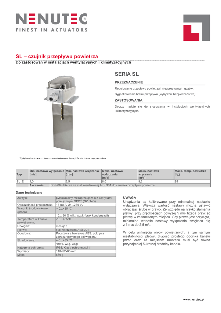 SL – czujnik przepływu powietrza Do zastosowań w instalacjach wentylacyjnych i klimatyzacyjnych SERIA SL PRZEZNACZENIE Regulowanie przepływu powietrza i nieagresywnych gazów. Sygnalizowanie braku przepływu (wyłącznik bezpieczeństwa). ZASTOSOWANIA Dobrze nadaje się do stosowania w instalacjach wentylacyjnych i klimatyzacyjnych. Wygląd urządzenia może odbiegać od przedstawionego na ilustracji. Dane techniczne mogą ulec zmianie. Typ SL1E Min. nastawa wyłączania Min. nastawa włączania [m/s] [m/s] Maks. nastawa Maks. nastawa wyłączania włączania [m/s] [m/s] 2,5 8,0 9,2 DBZ-08 - Płetwa ze stali nierdzewnej AISI 301 do czujnika przepływu powietrza Maks. temp. powietrza [°C] 1,0 Akcesoria: 85 Dane techniczne Zestyki: pyłoszczelny mikroprzełącznik z zestykami przełącznymi SPDT (NZ / NO) Obciążalność przełącznika: 15 (8) A, 24...250 VAC Warunki środowiskowe -40...+85 C (praca): 10... 90 % wilg. wzgl. (brak kondensacji) Temperatura w kanale -10...+85°C powietrznym, Dźwignia: mosiądz Płetwa: stal nierdzewna AISI 301 Obudowa: Podstawa z tworzywa ABS, pokrywa z przezroczystego poliwęglanu -40...+85 °C Składowanie: < 95% wilg. wzgl. Kategoria ochronna: IP65, Klasa ochronności 1 Wymiary: 140x62x65 mm Masa: 630 g UWAGA Urządzenia są kalibrowane przy minimalnej nastawie wyłączania. Większą wartość nastawy można ustawić obracając śrubę w prawo. Ze względu na ryzyko złamania płetwy, przy prędkościach powyżej 5 m/s trzeba przyciąć płetwę w zaznaczonym miejscu. Gdy płetwa jest przycięta, minimalna wartość nastawy wyłączania zwiększa się z 1 m/s do 2,5 m/s. W celu uniknięcia wirów powietrznych, a tym samym niestabilności płetwy, długość prostego odcinka kanału przed oraz za miejscem montażu musi być równa przynajmniej 5-krotnej średnicy kanału. www.nenutec.pl SL – czujnik przepływu powietrza Do zastosowań w instalacjach wentylacyjnych i klimatyzacyjnych POŁĄCZENIA ELEKTRYCZNE Podłączyć zaciski czerwony i biały (Rys. 1). Zaciski czerwony-biały zostają rozwarte, gdy natężenie przepływu zmaleje poniżej zadanej wartości. Przy braku przepływu zostają zwarte zaciski czerwony-niebieski, które mogą być używane do sygnalizowania lub jako zestyk alarmowy. Rys. 1 Stan przełącznika przy przepływie WYMIARY [mm] Ze względu na stałe doskonalenie naszych produktów, dane techniczne mogą ulec zmianie bez uprzedzenia. Nenutec Polska 00-213 Warszawa ul. Bonifraterska 14 tel.: +48-(0)-504-050225 [email protected] www.nenutec.pl
