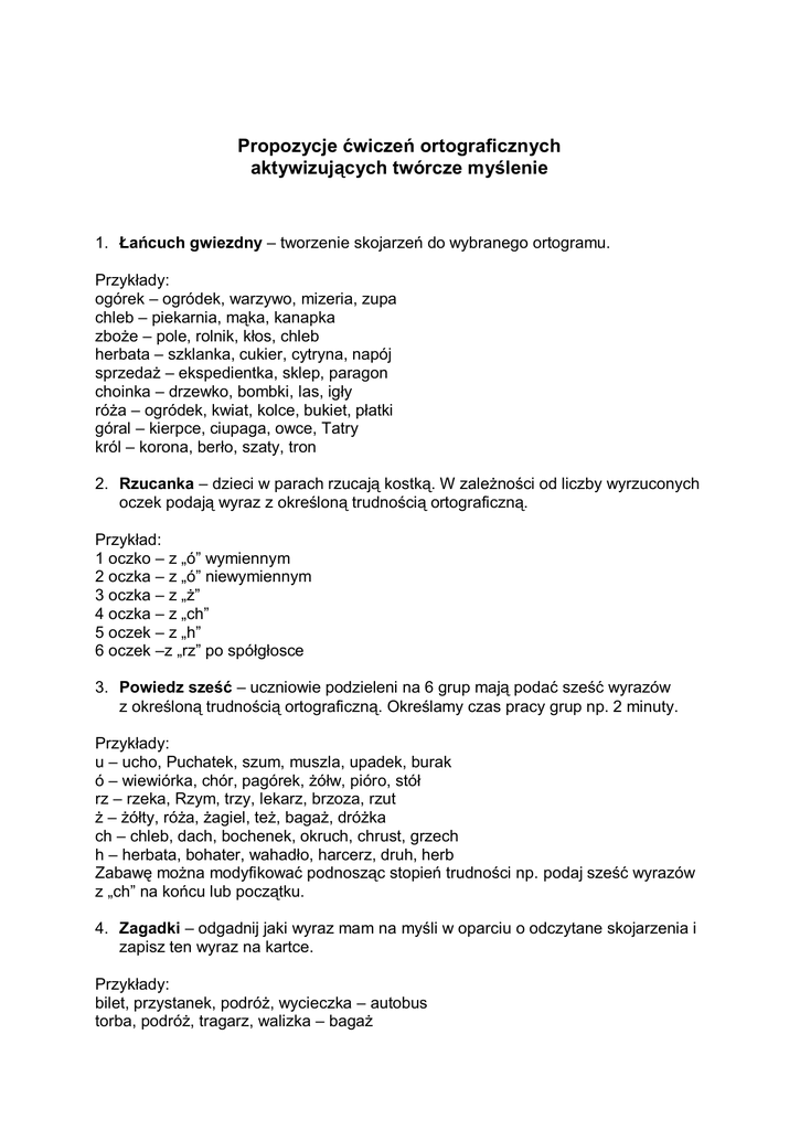 Propozycje ćwiczeń ortograficznych aktywizujących twórcze myślenie 1. Łańcuch gwiezdny – tworzenie skojarzeń do wybranego ortogramu. Przykłady: ogórek – ogródek, warzywo, mizeria, zupa chleb – piekarnia, mąka, kanapka zboże – pole, rolnik, kłos, chleb herbata – szklanka, cukier, cytryna, napój sprzedaż – ekspedientka, sklep, paragon choinka – drzewko, bombki, las, igły róża – ogródek, kwiat, kolce, bukiet, płatki góral – kierpce, ciupaga, owce, Tatry król – korona, berło, szaty, tron 2. Rzucanka – dzieci w parach rzucają kostką. W zależności od liczby wyrzuconych oczek podają wyraz z określoną trudnością ortograficzną. Przykład: 1 oczko – z „ó” wymiennym 2 oczka – z „ó” niewymiennym 3 oczka – z „ż” 4 oczka – z „ch” 5 oczek – z „h” 6 oczek –z „rz” po spółgłosce 3. Powiedz sześć – uczniowie podzieleni na 6 grup mają podać sześć wyrazów z określoną trudnością ortograficzną. Określamy czas pracy grup np. 2 minuty. Przykłady: u – ucho, Puchatek, szum, muszla, upadek, burak ó – wiewiórka, chór, pagórek, żółw, pióro, stół rz – rzeka, Rzym, trzy, lekarz, brzoza, rzut ż – żółty, róża, żagiel, też, bagaż, dróżka ch – chleb, dach, bochenek, okruch, chrust, grzech h – herbata, bohater, wahadło, harcerz, druh, herb Zabawę można modyfikować podnosząc stopień trudności np. podaj sześć wyrazów z „ch” na końcu lub początku. 4. Zagadki – odgadnij jaki wyraz mam na myśli w oparciu o odczytane skojarzenia i zapisz ten wyraz na kartce. Przykłady: bilet, przystanek, podróż, wycieczka – autobus torba, podróż, tragarz, walizka – bagaż zimno, wiatr, mróz – chłód deszcz, grad, śnieg, niebo – chmura pokój, lampka, komputer, lekcje – biurko wrzawa, zgiełk, przerwa, harmider – hałas zjawa, upiór, zmora – duch las, kolce, zwierzę – jeż las, koszyk, kapelusz, nóżka – grzyb lodówka, piekarnik, stół, posiłek - kuchnia porządki, szmatka, meble, alergia – kurz gabinet, słuchawki, recepta – lekarz pszczoły, ul, słoik, plaster – miód bucik, kózka, kolano, stopa – nóżka grządki, kwiaty, warzywa, grabie – ogródek oprawki, szkła wzrok - okulary cyfra, bałwanek, wyjątek – ósemka worek, mąka, chleb, zawód – piekarz ogień, dym, woda strażak - pożar las, rzeka, rośliny, zwierzęta - przyroda zboże, zupa, Chiny - ryż piłka, kosz, punkt – rzut blat, obrus, obiad, krzesła – stół słuch, torba, kolczyk – ucho żołędzie, dziupla, kitka – wiewiórka czary, różdżka, Kopciuszek - wróżka ziarno, żyto, pszenica, kukurydza - zboże las, ZOO, podwórko – zwierzęta żyrandol, światło, lampka – żarówka mundur, karabin, wojsko - żołnierz cętki, szyja, Afryka – żyrafa 5. Kodowanie – układanie zdań lub wyrażeń do podanego kodu. Przykłady: Kod H rz u Hubert rzeźbi ucho. Hela rzuca ufoludkiem. Halinka rządzi uczniami. Kod Ż u ch Żaneta ulepiła chlewik. Żanna umyła chomika. Żona upiekła chleb. Kod U ch rz Ula chodzi żwawo. Upiór chowa żmiję. Uszatek chrupie żyto. Kod H ż ż Henryk żuje żyletkę. Honorata żywi żabę. Hania żałuje żubra. 6. Swobodny tekst – uczniowie redagują tekst z użyciem jak największej liczby wyrazów z podaną trudnością ortograficzną np. „h’. Przykład: Hiena Helenka huśtała się na hamaku. Hipopotam Hubert zazdrościł jej. Postanowił zbudować huśtawkę. Od tej pory huśtał się, popijając herbatkę i zjadając herbatniki. Huśtawka pracowała jak wahadło. Rymowanki ortograficzne Marzena marzy może pojadę nad morze, a może ryby złowię w jeziorze, może kraj wzdłuż i wszerz przemierzę, albo może zaśpiewam w operze. Krótka rózga, kłótnia, córka Zbój, powrósło, ogół, skórka. Włókno, włóczka, wróżby różne, Żółw tchórzliwy, wróbel - próżniak. Oprócz czółna - żółtko, wiórek, Wójt, równina, chór przepiórek. Próchno, próba, późno, włóka? Zapamiętaj, łatwa sztuka! Wróżka wróży: Czy mróz duży, Czy śnieg prószy, Czy zmarzną uszy! Król Karol kupił królowej Karolinie korale koloru koralowego. Samo "h" Kłopotliwe samo "h" Dość szczególną skłonność ma: Lubi "hałaśliwe" słowa: Huk, harmider, hałasować. Pisząc "historyjka błaha", Nigdy, Haniu, się nie wahaj! Przez "h" pisz, pamiętaj o tym, "hałaśliwy wrzask hołoty". Huśtać lubisz się? Wiedz o tym, że "h" ma Hak, huśtawka oraz hamak. Nie trać humoru! Co to za harmider? Ten huk, ten hałas? To wróg czyha na nasz honor! Wkładaj hełm! Bierz halabardę! Hańba wrogom! Dalej, dalej, jak huragan! Wszyscy szturmem! Hura! Hura! Hej! Hop! - Uciekła ohydna horda! Ocalony honor hufca? - Nie ma jak dobry humor przy herbacie! Nie wierzy Jerzy, że tam, gdzie wieże, leżą trzy jeże. Ksiądz Jerzy nie wierzy, że w Iłży na wieży jest gniazdo nietoperzy. 1. Rozwiąż zagadki. (4 p) Rosną sobie w sadzie albo koło drogi Wojtek nie uważał więc poparzył nogi ..................................................................... Okrąglutki i wspaniały A barszcz z niego doskonały Wykonane nim rysunki ścierasz za pomocą gumki .................................................................... Płynie po niebie, znasz ją i wiesz, że gdy jest ciemna, może być deszcz .................................................................... .................................................................... 2. Przeczytaj uważnie opowiadanie, odgadnij brakujące litery. Wpisz je w miejsce kropek. (9 p) Cho... do ogr...dka. Będziemy kopać g...ądki. Ty posa... kwiatki, ja posadzę wa...ywa. Przynie... łopatę i kone...kę z kom...rki. Pom...ż mi nieść! – woła Janek. 3. Odgadnij hasło z tabelki. Pomogą ci cyfry. (2p) D R Ż 2 8 5 10 13 3 C Z W Y 7 N R A E O Y 6 12 4 11 1 9 .............................................................................................................