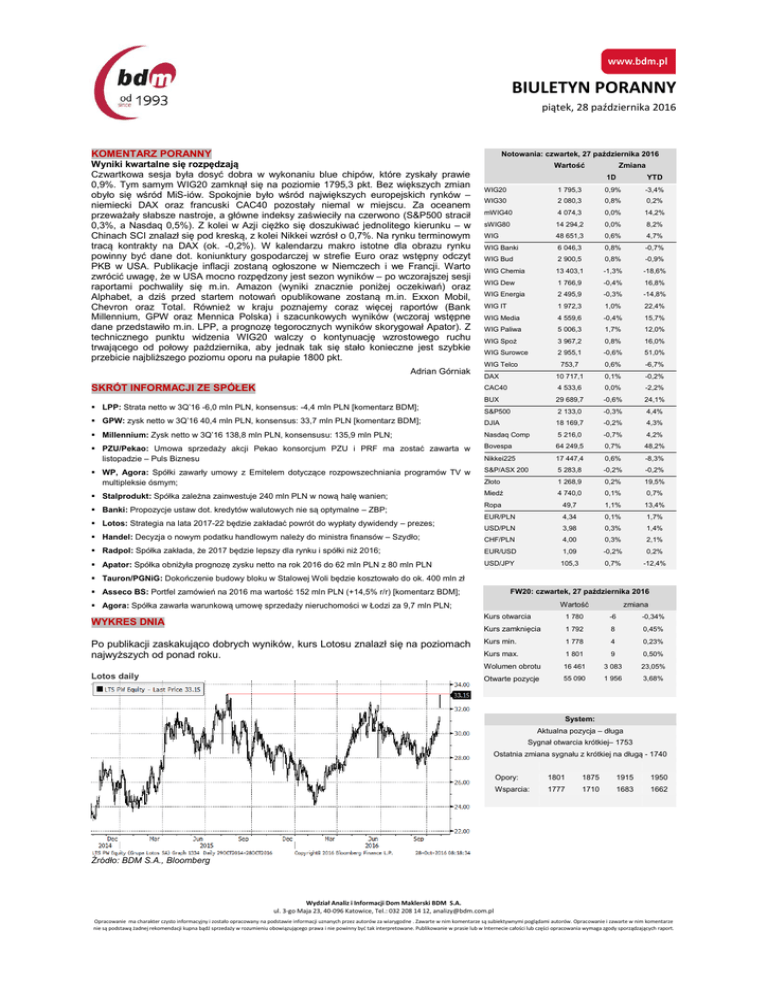 BIULETYN PORANNY piątek, 28 października 2016 KOMENTARZ PORANNY Notowania: czwartek, 27 października 2016 Wyniki kwartalne się rozpędzają Czwartkowa sesja była dosyć dobra w wykonaniu blue chipów, które zyskały prawie 0,9%. Tym samym WIG20 zamknął się na poziomie 1795,3 pkt. Bez większych zmian obyło się wśród MiS-iów. Spokojnie było wśród największych europejskich rynków – niemiecki DAX oraz francuski CAC40 pozostały niemal w miejscu. Za oceanem przeważały słabsze nastroje, a główne indeksy zaświeciły na czerwono (S&P500 stracił 0,3%, a Nasdaq 0,5%). Z kolei w Azji ciężko się doszukiwać jednolitego kierunku – w Chinach SCI znalazł się pod kreską, z kolei Nikkei wzrósł o 0,7%. Na rynku terminowym tracą kontrakty na DAX (ok. -0,2%). W kalendarzu makro istotne dla obrazu rynku powinny być dane dot. koniunktury gospodarczej w strefie Euro oraz wstępny odczyt PKB w USA. Publikacje inflacji zostaną ogłoszone w Niemczech i we Francji. Warto zwrócić uwagę, że w USA mocno rozpędzony jest sezon wyników – po wczorajszej sesji raportami pochwaliły się m.in. Amazon (wyniki znacznie poniżej oczekiwań) oraz Alphabet, a dziś przed startem notowań opublikowane zostaną m.in. Exxon Mobil, Chevron oraz Total. Również w kraju poznajemy coraz więcej raportów (Bank Millennium, GPW oraz Mennica Polska) i szacunkowych wyników (wczoraj wstępne dane przedstawiło m.in. LPP, a prognozę tegorocznych wyników skorygował Apator). Z technicznego punktu widzenia WIG20 walczy o kontynuację wzrostowego ruchu trwającego od połowy października, aby jednak tak się stało konieczne jest szybkie przebicie najbliższego poziomu oporu na pułapie 1800 pkt. Adrian Górniak SKRÓT INFORMACJI ZE SPÓŁEK LPP: Strata netto w 3Q’16 -6,0 mln PLN, konsensus: -4,4 mln PLN [komentarz BDM]; Wartość Zmiana 1D YTD -3,4% WIG20 1 795,3 0,9% WIG30 2 080,3 0,8% 0,2% mWIG40 4 074,3 0,0% 14,2% sWIG80 14 294,2 0,0% 8,2% WIG 48 651,3 0,6% 4,7% WIG Banki 6 046,3 0,8% -0,7% WIG Bud 2 900,5 0,8% -0,9% WIG Chemia 13 403,1 -1,3% -18,6% WIG Dew 1 766,9 -0,4% 16,8% WIG Energia 2 495,9 -0,3% -14,8% WIG IT 1 972,3 1,0% 22,4% WIG Media 4 559,6 -0,4% 15,7% WIG Paliwa 5 006,3 1,7% 12,0% WIG Spoż 3 967,2 0,8% 16,0% WIG Surowce 2 955,1 -0,6% 51,0% 753,7 0,6% -6,7% DAX 10 717,1 0,1% -0,2% CAC40 4 533,6 0,0% -2,2% BUX 29 689,7 -0,6% 24,1% WIG Telco S&P500 2 133,0 -0,3% 4,4% GPW: zysk netto w 3Q’16 40,4 mln PLN, konsensus: 33,7 mln PLN [komentarz BDM]; DJIA 18 169,7 -0,2% 4,3% Millennium: Zysk netto w 3Q’16 138,8 mln PLN, konsensusu: 135,9 mln PLN; Nasdaq Comp 5 216,0 -0,7% 4,2% PZU/Pekao: Umowa sprzedaży akcji Pekao konsorcjum PZU i PRF ma zostać zawarta w listopadzie – Puls Biznesu Bovespa 64 249,5 0,7% 48,2% Nikkei225 17 447,4 0,6% -8,3% WP, Agora: Spółki zawarły umowy z Emitelem dotyczące rozpowszechniania programów TV w multipleksie ósmym; S&P/ASX 200 5 283,8 -0,2% -0,2% Złoto 1 268,9 0,2% 19,5% Stalprodukt: Spółka zależna zainwestuje 240 mln PLN w nową halę wanien; Miedź 4 740,0 0,1% 0,7% Banki: Propozycje ustaw dot. kredytów walutowych nie są optymalne – ZBP; Ropa 49,7 1,1% 13,4% EUR/PLN 4,34 0,1% 1,7% USD/PLN 3,98 0,3% 1,4% Handel: Decyzja o nowym podatku handlowym należy do ministra finansów – Szydło; CHF/PLN 4,00 0,3% 2,1% Radpol: Spółka zakłada, że 2017 będzie lepszy dla rynku i spółki niż 2016; EUR/USD 1,09 -0,2% 0,2% Apator: Spółka obniżyła prognozę zysku netto na rok 2016 do 62 mln PLN z 80 mln PLN USD/JPY 105,3 0,7% -12,4% Lotos: Strategia na lata 2017-22 będzie zakładać powrót do wypłaty dywidendy – prezes; Tauron/PGNiG: Dokończenie budowy bloku w Stalowej Woli będzie kosztowało do ok. 400 mln zł Asseco BS: Portfel zamówień na 2016 ma wartość 152 mln PLN (+14,5% r/r) [komentarz BDM]; FW20: czwartek, 27 października 2016 Wartość Agora: Spółka zawarła warunkową umowę sprzedaży nieruchomości w Łodzi za 9,7 mln PLN; WYKRES DNIA Po publikacji zaskakująco dobrych wyników, kurs Lotosu znalazł się na poziomach najwyższych od ponad roku. Lotos daily zmiana Kurs otwarcia 1 780 -6 -0,34% Kurs zamknięcia 1 792 8 0,45% Kurs min. 1 778 4 0,23% Kurs max. 1 801 9 0,50% Wolumen obrotu 16 461 3 083 23,05% Otwarte pozycje 55 090 1 956 3,68% System: Aktualna pozycja – długa Sygnał otwarcia krótkiej– 1753 Ostatnia zmiana sygnału z krótkiej na długą - 1740 Opory: 1801 1875 1915 1950 Wsparcia: 1777 1710 1683 1662 Źródło: BDM S.A., Bloomberg Wydział Analiz i Informacji Dom Maklerski BDM S.A. ul. 3-go Maja 23, 40-096 Katowice, Tel.: 032 208 14 12, [email protected] Opracowanie ma charakter czysto informacyjny i zostało opracowany na podstawie informacji uznanych przez autorów za wiarygodne . Zawarte w nim komentarze są subiektywnymi poglądami autorów. Opracowanie i zawarte w nim komentarze nie są podstawą żadnej rekomendacji kupna bądź sprzedaży w rozumieniu obowiązującego prawa i nie powinny być tak interpretowane. Publikowanie w prasie lub w Internecie całości lub części opracowania wymaga zgody sporządzających raport. BIULETYN PORANNY piątek, 28 października 2016 GPW – PODSUMOWANIE Indeksy GPW FW20 (1,780.00, 1,801.00, 1,778.00, 1,792.00, +8.00000) 1900 1850 Open Low High Close WIG20 1 780,8 1 779,7 1 798,4 1 795,3 0,9% 700 WIG30 2 063,3 2 061,4 2 081,1 2 080,3 0,8% 800 MWIG40 4 069,6 14 244,2 14 304,3 4 074,3 0,0% 216 SWIG80 14 297,4 4 051,6 4 077,6 14 294,2 0,0% 25 WIG-PL 49 349,0 49 325,4 49 421,7 49 421,7 0,6% 951 WIG 48 384,7 48 347,4 48 651,5 48 651,3 0,6% 958 WIG20 1800 1750 1700 1650 2 9 May 16 23 30 6 June 13 20 27 4 July 11 18 25 1 8 August 16 22 29 5 12 19 September 26 3 10 October 17 24 31 7 November WIG20 (1,780.78, 1,798.42, 1,779.74, 1,795.33, +15.6000) 1900 1850 Zmiana Obrót Indeks Alior Cena 47,88 Mkt Cap zmi ana 1D YTD 6 189 -1,1% -11,7% Asseco PL 52,55 4 362 1,0% -7,5% BZ WBK 315,85 31 343 0,9% 11,2% CCC 198,00 7 747 1,5% 42,9% Cyfrowy P. 24,65 15 765 -0,