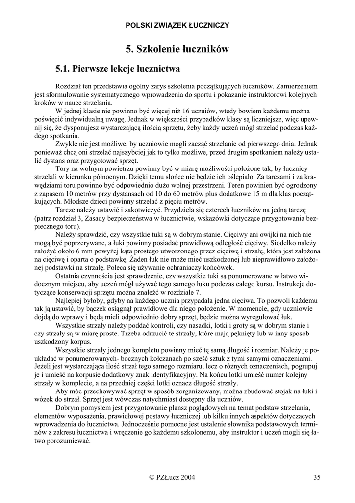 POLSKI ZWIĄZEK ŁUCZNICZY 5. Szkolenie łuczników 5.1. Pierwsze lekcje łucznictwa Rozdział ten przedstawia ogólny zarys szkolenia początkujących łuczników. Zamierzeniem jest sformułowanie systematycznego wprowadzenia do sportu i pokazanie instruktorowi kolejnych kroków w nauce strzelania. W jednej klasie nie powinno być więcej niż 16 uczniów, wtedy bowiem każdemu można poświęcić indywidualną uwagę. Jednak w większości przypadków klasy są liczniejsze, więc upewnij się, że dysponujesz wystarczającą ilością sprzętu, żeby każdy uczeń mógł strzelać podczas każdego spotkania. Zwykle nie jest możliwe, by uczniowie mogli zacząć strzelanie od pierwszego dnia. Jednak ponieważ chcą oni strzelać najszybciej jak to tylko możliwe, przed drugim spotkaniem należy ustalić dystans oraz przygotować sprzęt. Tory na wolnym powietrzu powinny być w miarę możliwości położone tak, by łucznicy strzelali w kierunku północnym. Dzięki temu słońce nie będzie ich oślepiało. Za tarczami i za krawędziami toru powinno być odpowiednio dużo wolnej przestrzeni. Teren powinien być ogrodzony z zapasem 10 metrów przy dystansach od 10 do 60 metrów plus dodatkowe 15 m dla klas początkujących. Młodsze dzieci powinny strzelać z pięciu metrów. Tarcze należy ustawić i zakotwiczyć. Przydziela się czterech łuczników na jedną tarczę (patrz rozdział 3, Zasady bezpieczeństwa w łucznictwie, wskazówki dotyczące przygotowania bezpiecznego toru). Należy sprawdzić, czy wszystkie tuki są w dobrym stanie. Cięciwy ani owijki na nich nie mogą być poprzerywane, a łuki powinny posiadać prawidłową odległość cięciwy. Siodełko należy założyć około 6 mm powyżej kąta prostego utworzonego przez cięciwę i strzałę, która jest założona na cięciwę i oparta o podstawkę. Żaden łuk nie może mieć uszkodzonej lub nieprawidłowo założonej podstawki na strzałę. Poleca się używanie ochraniaczy końcówek. Ostatnią czynnością jest sprawdzenie, czy wszystkie tuki są ponumerowane w łatwo widocznym miejscu, aby uczeń mógł używać tego samego łuku podczas całego kursu. Instrukcje dotyczące konserwacji sprzętu można znaleźć w rozdziale 7. Najlepiej byłoby, gdyby na każdego ucznia przypadała jedna cięciwa. To pozwoli każdemu tak ją ustawić, by bączek osiągnął prawidłowe dla niego położenie. W momencie, gdy uczniowie dojdą do wprawy i będą mieli odpowiednio dobry sprzęt, będzie można wyregulować łuk. Wszystkie strzały należy poddać kontroli, czy nasadki, lotki i groty są w dobrym stanie i czy strzały są w miarę proste. Trzeba odrzucić te strzały, które mają pęknięty lub w inny sposób uszkodzony korpus. Wszystkie strzały jednego kompletu powinny mieć tę samą długość i rozmiar. Należy je poukładać w ponumerowanych- bocznych kołczanach po sześć sztuk z tymi samymi oznaczeniami. Jeżeli jest wystarczająca ilość strzał tego samego rozmiaru, lecz o różnych oznaczeniach, pogrupuj je i umieść na korpusie dodatkowy znak identyfikacyjny. Na końcu lotki umieść numer kolejny strzały w komplecie, a na przedniej części lotki oznacz długość strzały. Aby móc przechowywać sprzęt w sposób zorganizowany, można zbudować stojak na łuki i wózek do strzał. Sprzęt jest wówczas natychmiast dostępny dla uczniów. Dobrym pomysłem jest przygotowanie plansz poglądowych na temat podstaw strzelania, elementów wyposażenia, prawidłowej postawy łuczniczej lub kilku innych aspektów dotyczących wprowadzenia do łucznictwa. Jednocześnie pomocne jest ustalenie słownika podstawowych terminów z zakresu łucznictwa i wręczenie go każdemu szkolonemu, aby instruktor i uczeń mogli się łatwo porozumiewać. © PZŁucz 2004 35 POLSKI ZWIĄZEK ŁUCZNICZY Pewne warsztatowe wskazówki dla instruktorów powinny być przez nich zapamiętane i wprowadzone w życie. Przypominamy je poniżej. 1. Okazuj entuzjazm i zainteresowanie swoją dyscypliną sportu – nie przesadzaj z tym, lecz niech klasa widzi, że to czego uczysz, sprawia ci przyjemność. 2. Korzystaj z materiałów poglądowych (plansze, plakaty) – pomagają one uczniom zrozumieć i zapamiętać to czego ich uczysz. 3. Instruując mów głośno i wyraźnie – jeżeli uczniowie cię słyszą, mogą niechętnie prosić o powtórzenie. 4. Ucząc na otwartej przestrzeni upewnij się, że uczniowie nie są zwróceni twarzą pod słońce oraz, że nie są rozpraszani przez odrywające uwagę zjawiska, jak gra w piłkę, ruch uliczny itp. 5. Przy prowadzeniu strzelania używaj zawsze gwizdka. Wyćwicz gwizdanie, aż będziesz umiał wydobyć krótkie, zdecydowane sygnały. 6. Bądź dyplomatyczny przekonując uczniów do nauki strzelania przy wykorzystaniu celownika, niskiej kotwicy i formy klasycznej. 7. Jeżeli klasa jest duża i łuków wystarcza tylko dla połowy uczniów, stwórz drugą linię dla lektury, demonstracji i naśladownictwa. Pierwsza linia może używać łuków do naśladownictwa (i później do strzelania), inni mogą słuchać i „trenować” swoich partnerów. Kiedy pierwsza linia skończy, zamienią się miejscami. 8. Obejmij swą uwagą wszystkich uczniów w klasie. Chodź wzdłuż linii, podczas gdy oni strzelają, żeby uczniowie potrzebujący pomocy swobodniej mogli o nią poprosić. 9. Zawsze idź do tarcz razem z klasą, nalegaj by każdy (wliczając ciebie) pomagał szukać zgubionych strzał. 10. Ze względów bezpieczeństwa najlepiej nie pozwalać uczniom wracać na linię (i do sprzętu) dopóki ciebie tam nie ma. 11. Udzielaj pochwał indywidualnie i/lub całej klasie, gdy coś zostanie wykonane prawidłowo. Uważaj na objawy zniechęcenia i uczyń każdy wysiłek, aby pomóc i upewnić tych, którzy mają problemy. 12. Zwracaj uwagę na objawy bólu – uczeń może niechętnie mówić, że cięciwa uderza go przy zwolnieniu w niechronioną część ciała. Ci, którzy mają z tym problemy, 