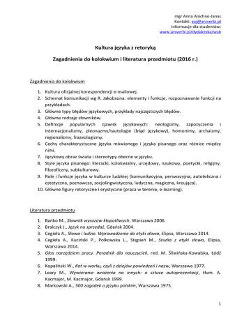 mgr Anna Alochno-Janas Kontakt: [email protected] Informacje dla studentów: www.arsverbi.pl/dydaktyka/wsb Kultura języka z retoryką Zagadnienia do kolokwium i literatura przedmiotu (2016 r.) Zagadnienia do kolokwium 1. Kultura oficjalnej korespondencji e-mailowej. 2. Schemat komunikacji wg R. Jakobsona: elementy i funkcje, rozpoznawanie funkcji na przykładach. 3. Główne typy błędów językowych, przykłady najczęstszych błędów. 4. Główne rodzaje słowników. 5. Definicje popularnych zjawisk językowych: neologizmy, zapożyczenia i internacjonalizmy, pleonazmy/tautologie (błąd językowy), homonimy, archaizmy, regionalizmy, frazeologizmy. 6. Cechy charakterystyczne języka mówionego i języka pisanego oraz różnice między nimi. 7. Językowy obraz świata i stereotypy obecne w języku. 8. Style języka pisanego: literacki, kolokwialny, urzędowy, naukowy, poetycki, religijny, filozoficzny, subkulturowy. 9. Role i funkcje języka w kulturze ludzkiej (komunikacyjna, perswazyjna, autoteliczna i estetyczna, poznawcza, socjolingwistyczna, ludyczna, magiczna, kreująca). 10. Główne figury retoryczne i erystyczne (praca w terenie, e-learning). Literatura przedmiotu 1. 2. 3. 4. 5. 6. 7. 8. Bańko M., Słownik wyrazów kłopotliwych, Warszawa 2006. Bralczyk J., Język na sprzedaż, Gdańsk 2004. Cegieła A., Słowa i ludzie. Wprowadzenie do etyki słowa, Elipsa, Warszawa 2014. Cegieła A., Kuciński P., Polkowska L., Stępień M., Studia z etyki słowa, Elipsa, Warszawa 2014. Głos narzędziem pracy. Poradnik dla nauczycieli, red. M. Śliwińska-Kowalska, Łódź 1999. Kopaliński W., Kot w worku, czyli z dziejów powiedzeń i nazw, Warszawa 1977. Leary M., Wywieranie wrażenia na innych: o sztuce autoprezentacji, tłum. A. Kacmajor, M. Kacmajor, Gdańsk 1999. Markowski A., 500 zagadek o języku polskim, Warszawa 1975. 1 mgr Anna Alochno-Janas Kontakt: [email protected] Informacje dla studentów: www.arsverbi.pl/dydaktyka/wsb 9. Markowski A., Kultura języka polskiego: teoria, zagadnienia leksykalne, Warszawa 2005. 10. Miodek J., Kultura języka w teorii i praktyce, Wrocław 1983. 11. Pisarek W., Podstawy retoryki dziennikarskiej, [w:] Dziennikarstwo i świat mediów, red. Z. Bauer, E. Chudziński, Kraków 2010. 12. Podstawy stylistyki i retoryki, PWN, Warszawa 2008. 13. Queneau R., Ćwiczenia stylistyczne, tłum. J. Gondowicz, Izabelin 2005. 14. Schopenhauer Artur, Erystyka, czyli sztuka prowadzenia sporów, Warszawa 1986. 15. Sinielnikoff R., Prechitko E., Wzory listów polskich, Wiedza Powszechna, Warszawa 1993. 16. Urbańczyk S., Słowniki i encyklopedie – ich rodzaje i użyteczność, Kraków – Katowice 1991. 17. Ustawa z dnia 7 października 1999 r. o języku polskim (tekst jednolity). 18. Wielki słownik poprawnej polszczyzny, red. A. Markowski, Warszawa 2004. Zadanie na ocenę celującą: Zreferować ustnie cztery wciąż aktualne mechanizmy perswazyjne opisane w poniższym artykule: Barańczak S., Czytelnik ubezwłasnowolniony. Perswazja w masowej kulturze literackiej PRL, Paryż 1983. (rozdział II: Słowo – perswazja – kultura masowa) 2