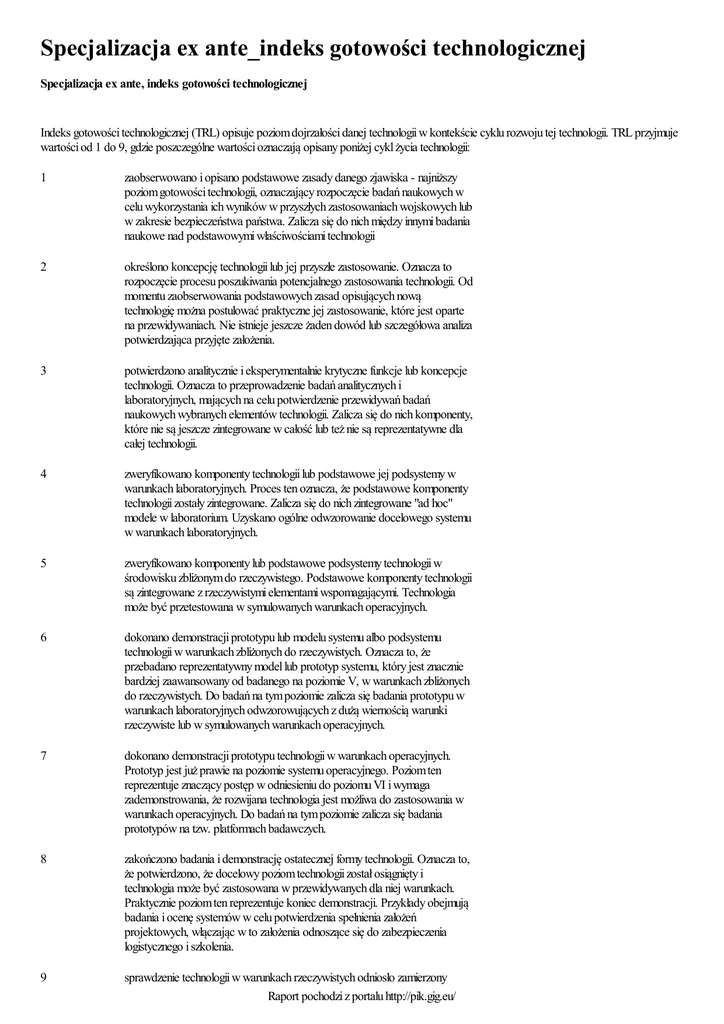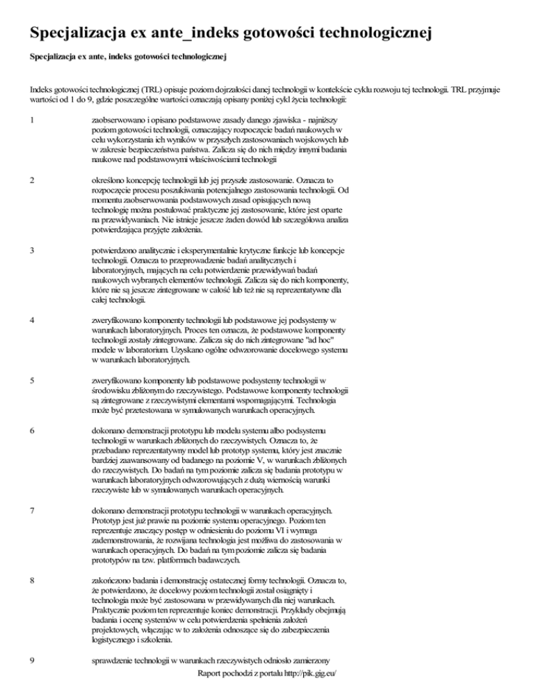 Specjalizacja ex ante_indeks gotowości technologicznej Specjalizacja ex ante, indeks gotowości technologicznej Indeks gotowości technologicznej (TRL) opisuje poziom dojrzałości danej technologii w kontekście cyklu rozwoju tej technologii. TRL przyjmuje wartości od 1 do 9, gdzie poszczególne wartości oznaczają opisany poniżej cykl życia technologii: 1 zaobserwowano i opisano podstawowe zasady danego zjawiska - najniższy poziom gotowości technologii, oznaczający rozpoczęcie badań naukowych w celu wykorzystania ich wyników w przyszłych zastosowaniach wojskowych lub w zakresie bezpieczeństwa państwa. Zalicza się do nich między innymi badania naukowe nad podstawowymi właściwościami technologii 2 określono koncepcję technologii lub jej przyszłe zastosowanie. Oznacza to rozpoczęcie procesu poszukiwania potencjalnego zastosowania technologii. Od momentu zaobserwowania podstawowych zasad opisujących nową technologię można postulować praktyczne jej zastosowanie, które jest oparte na przewidywaniach. Nie istnieje jeszcze żaden dowód lub szczegółowa analiza potwierdzająca przyjęte założenia. 3 potwierdzono analitycznie i eksperymentalnie krytyczne funkcje lub koncepcje technologii. Oznacza to przeprowadzenie badań analitycznych i laboratoryjnych, mających na celu potwierdzenie przewidywań badań naukowych wybranych elementów technologii. Zalicza się do nich komponenty, które nie są jeszcze zintegrowane w całość lub też nie są reprezentatywne dla całej technologii. 4 zweryfikowano komponenty technologii lub podstawowe jej podsystemy w warunkach laboratoryjnych. Proces ten oznacza, że podstawowe komponenty technologii zostały zintegrowane. Zalicza się do nich zintegrowane "ad hoc" modele w laboratorium. Uzyskano ogólne odwzorowanie docelowego systemu w warunkach laboratoryjnych. 5 zweryfikowano komponenty lub podstawowe podsystemy technologii w środowisku zbliżonym do rzeczywistego. Podstawowe komponenty technologii są zintegrowane z rzeczywistymi elementami wspomagającymi. Technologia może być przetestowana w symulowanych warunkach operacyjnych. 6 dokonano demonstracji prototypu lub modelu systemu albo podsystemu technologii w warunkach zbliżonych do rzeczywistych. Oznacza to, że przebadano reprezentatywny model lub prototyp systemu, który jest znacznie bardziej zaawansowany od badanego na poziomie V, w warunkach zbliżonych do rzeczywistych. Do badań na tym poziomie zalicza się badania prototypu w warunkach laboratoryjnych odwzorowujących z dużą wiernością warunki rzeczywiste lub w symulowanych warunkach operacyjnych. 7 dokonano demonstracji prototypu technologii w warunkach operacyjnych. Prototyp jest już prawie na poziomie systemu operacyjnego. Poziom ten reprezentuje znaczący postęp w odniesieniu do poziomu VI i wymaga zademonstrowania, że rozwijana technologia jest możliwa do zastosowania w warunkach operacyjnych. Do badań na tym poziomie zalicza się badania prototypów na tzw. platformach badawczych. 8 zakończono badania i demonstrację ostatecznej formy technologii. Oznacza to, że potwierdzono, że docelowy poziom technologii został osiągnięty i technologia może być zastosowana w przewidywanych dla niej warunkach. Praktycznie poziom ten reprezentuje koniec demonstracji. Przykłady obejmują badania i ocenę systemów w celu potwierdzenia spełnienia założeń projektowych, włączając w to założenia odnoszące się do zabezpieczenia logistycznego i szkolenia. 9 sprawdzenie technologii w warunkach rzeczywistych odniosło zamierzony Raport pochodzi z portalu http://pik.gig.eu/ efekt. Wskazuje to, że demonstrowana technologia jest już w ostatecznej formie i może zostać zaimplementowana w docelowym systemie. Między innymi dotyczy to wykorzystania opracowanych systemów w warunkach rzeczywistych. Raport pochodzi z portalu http://pik.gig.eu/