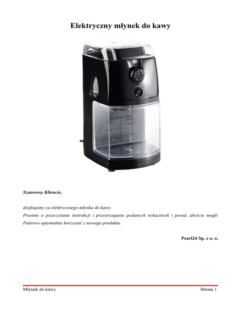 Elektryczny młynek do kawy Szanowny Kliencie, dziękujemy za elektrycznego młynka do kawy. Prosimy o przeczytanie instrukcji i przestrzeganie podanych wskazówek i porad, abyście mogli Państwo optymalnie korzystać z nowego produktu. Pearl24 Sp. z o. o. Młynek do kawy Strona 1 Zawartość zestawu: • Młynek • Instrukcja obsługi. Przed pierwszym użyciem • Ustaw urządzenie na stabilnej, suchej i równej powierzchni. Upewnij się, że znajduje się w miejscu niedostępnym dla małych dzieci. • Usuń wszystkie materiały opakowania z urządzenia. • Oczyść urządzenie z zewnątrz wilgotną szmatką. Osusz urządzenie i pojemnik miękką ściereczką. • Oczyść pokrywę i pojemnik zbiorczy ciepłą wodą z mydłem. Następnie wypłucz oba elementy czystą wodą i wysusz je dokładnie. • Nie należy zanurzać całego urządzenia w wodzie i innych płynach. Młynek do kawy Strona 2 Mielenie kawy 1. Podłącz przewód zasilający do gniazdka elektrycznego. 2. Zdejmij pokrywę pojemnika do napełniania i wypełnij ziarnami kawy (maks. 120 g). 3. Umieść pokrywę z powrotem na urządzeniu. 4. Ustaw odpowiednie mielenie na boku młynka do kawy. Istnieją cztery główne ustawienia od grubego (Coarse) do cienkiego (Fine). Ustawienie Mielenie 0 Bardzo grube 1-2 Grube 3-4 Średnie 5-6 Drobne 7-8 Bardzo drobne Upewnij się, że pojemnik zbiorczy jest zamontowany prawidłowo. Ustaw odpowiednie mielenie. Możesz wybrać 2-12 filiżanek. Naciśnij przycisk ON/OFF (start / stop), aby włączyć młynek do kawy. Młynek do kawy zostanie automatycznie wyłączony po zmieleniu kawy. W każdej chwili możesz zatrzymać proces mielenia, naciskając przycisk ON/OFF. WSKAZÓWKA Jeśli regulator mielenia jest ustawiony na OFF, młynek nie włącza się po naciśnięciu ON / OFF. Młynek do kawy Strona 3 Czyszczenie • Przed czyszczeniem urządzenia należy odłączyć kabel zasilający. • Oczyść obudowę wilgotną szmatką. Nigdy nie należy zanurzać urządzenia w wodzie i innych płynach. • Oczyść pokrywę i pojemnik zbiorczy ciepłą wodą z mydłem. Następnie wypłucz oba elementy czystą wodą i wysusz je dokładnie. • Nigdy nie należy używać agresywnych środków czyszczących, środków w aerozolu i szorstkich zmywaków. • Zdejmij pokrywę młynka wewnątrz pojemnika do napełniania obracając i ciągnąc pokrywę zgodnie z ruchem wskazówek zegara w kierunku UNLOCK. Oczyść młynek i spód pokrywy za pomocą pędzla. Załóż pokrywę z powrotem na młynku i obróć w lewo, aby zabezpieczyć. Młynek do kawy Strona 4 Bezpieczeństwo • Niniejsza instrukcja ma na celu zapoznanie Państwa z zasadami prawidłowego korzystania z produktu. Zaleca się przechowywanie instrukcji w łatwo dostępnym miejscu, aby w razie potrzeby mogli Państwo zweryfikować informacje. • Wszelkie modyfikacje produktu obniżają poziom jego bezpieczeństwa. UWAGA! Istnieje ryzyko obrażeń! • Nie należy rozkładać ani naprawiać urządzenia samodzielnie! • Zaleca się ostrożne obchodzenie się z produktem. Produkt może ulec uszkodzeniu w wyniku uderzenia, wstrząsów lub upadku nawet z niewielkiej wysokości. • Produkt należy trzymać z dala od wilgoci i wysokiej temperatury. • Produkt należy przechowywać w miejscu niedostępnym dla dzieci. • Urządzenie nie jest przeznaczone do mycia w zmywarce. • Wszelkie prawa do wprowadzania zmian technicznych oraz eliminacji błędów są zastrzeżone. Ważne wskazówki dotyczące utylizacji Urządzenia elektrycznego nie zalicza się do odpadów gospodarstwa domowego. W celu właściwej utylizacji urządzenia należy skontaktować się z organizacją odpowiedzialną za zbiórkę elektroodpadów w wybranej miejscowości. Deklaracja zgodności PEARL.GmbH oświadcza, że produkt NC-3608 jest zgodny z wymogami dyrektywy dotyczącej bezpieczeństwa produktu 2001/95/EG, dyrektywy niskonapięciowej 2006/95/EG i dyrektywy RoHS 2011/65/EU. Młynek do kawy Strona 5