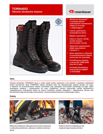 TORNADO Obuwie strażackie bojowe ® Membrana Sympatex z wysokiej jakości wyściełaniem warstwowym (odporna na wodę i „oddychająca”) Czarna, garbowana, wodoodporna skóra Miękkie wyściełanie Łatwy w użyciu i trwały system łączący sznurowadła i suwak Optymalne dopasowanie dzięki sznurówkom ® z Nomex -u Szwy wykonane z odpornej na promieniowanie cieplne, czerwonej nici szewskiej Certyfikowane zgodnie z normą EN 15090:2006 F2A HI3 CI SRA Posiadają Świadectwo Dopuszczenia CNBOP nr 0376/2008 Opis Obuwie strażackie TORNADO łączy w sobie zalety butów wiązanych oraz łatwość i szybkość zakładania butów wsuwanych. Buty TORNADO należy zawiązać tylko raz (dopasowując stopień docisku do nogi), a odporne na promieniowanie cieplne sznurówki oraz specjalne mocowania zachowają od tego czasu wymagane napięcie i dopasowanie do nogi. Dodatkowo, bardzo wytrzymały zamek błyskawiczny (zabezpieczony zewnętrzną listwą ze skóry) umożliwia szybkie wkładanie i zdejmowanie obuwia bez konieczności jego ponownego sznurowania / rozsznurowania podczas codziennego użytku. Zalety Nitrylowa podeszwa zabezpieczona przed przebiciem, z poduszką powietrzną i stalowym noskiem pokrytym gumą Srebrne element odblaskowe dla zwiększonego bezpieczeństwa TORNADO Obuwie strażackie bojowe wyściełana strefa nogi i krawędzi odporne na promieniowanie cieplne poliamidowe mocowania sznurowadeł z wyściełanym, bocznym wzmocnieniem skórzana pętla z tekstylnym wzmocnieniem opaska odblaskowa mocowanie zamka błyskawicznego na zewnętrznej stronie języka odporne na promieniowanie cieplne paski odblaskowe 3M odporne na promieniowanie cieplne poliamidowe mocowania sznurowadeł z wyściełanym, bocznym wzmocnieniem wyściełana i zabezpieczona strefa kostki zabezpieczająca przegub wkładka w okolicy pięty metalowy pręt dla odchyleń w polu elektrycznym gumowy nosek regulująca wilgotność wymienna wkładka stalowy nosek antybakteryjna wkładka skórzana, regulująca wilgotność nitrylowa podeszwa zabezpieczona przed przebiciem, z poduszką powietrzną, bocznie wysunięte krawędzie wkładka uszczelniająca stalowa wkładka śródstopia Dane techniczne Masa ok. 2.800 g (para, rozmiar 42) Wysokość buta ok. 260 mm (bez podeszwy, rozmiar 42) Szerokość 10 (standard) i 12 (opcja) Dostępne rozmiary 37 do 49 (standard) oraz 36, 50 i 51 (opcja) Materiał Czarna, garbowana, wodoodporna, hydrofobowa skóra Membrana Sympatex z wysokiej jakości wyściełaniem warstwowym (odporna na wodę i „oddychająca”) Pielęgnacja obuwia (środki rekomendowane przez producenta) 1. Środek czyszczący Woly Protector 3x3. 300 ml aerozol. 2. Zestaw do pielęgnacji Nikwax. Zestaw składa się z żelu czyszczącego (125 ml), wosku (125 ml, neutralny) i szczotki. 3. Środek czyszczący Solitaire Brillant. Tubka 75 ml. ® Kontakt Rosenbauer International AG Paschinger Straße 90 4060 Leonding, Austria Tel.: +43 732 6794-0 Fax: +43 732 6794-91 www.rosenbauer.com Tekst i ilustracje nie są wiążące. Zdjęcia i rysunki mogą ukazywać opcjonalne wyposażenie, dostępne wyłącznie za dodatkową opłatą. Rosenbauer rezerwuje sobie prawo do zmian w powyższej specyfikacji i wymiarów bez wcześniejszego powiadomienia. BIURO HANDLOWE: ul. Konarskiego 50 05-092 Łomianki tel./fax. (022) 751-68-95 [email protected] www.steo.com.pl