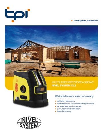 MULTILASER KRZY¯OWO-OSIOWY NIVEL SYSTEM CL2 Wielozadaniowy laser budowlany dok³adny i niezawodny laser krzy¿owy + 5 punktów laserowych (3 osie) do pracy wewn¹trz i na zewn¹trz jasne, czerwone świat³o lasera intuicyjna obs³uga Dane techniczne CL2 Laser czerwony, >1mV (klasa II) Wi¹zka laserowa pionowa, pozioma, krzy¿ Punkty laserowe 5 (lewo-prawo, góra-dó³, do ty³u) Dok³adnośæ ± 2 mm / 10 m Wyświetlane wi¹zki k¹t wyświetlania Dok³adnośæ i niezawodnośæ Wyraźna wi¹zka lasera gwarantuje komfortow¹ pracê w ka¿dych warunkach, sprzêt umo¿liwia pracê z dok³adności¹ ±2 mm/10 m. 90° / ±60" Zakres pracy Jeszcze wiêkszy zasiêg 15m (50m z czujnikiem laserowym) Zakres samopoziomowania Funkcja pulsacyjna pozwala pracowaæ z czujnikiem laserowym na zewn¹trz budynków w du¿ych odleg³ościach. ± 4° 4,5 V (3 baterie AA - typu paluszek) Zasilanie Wszechstronnośæ i wielozadaniowośæ Klasa odporności Wi¹zki lasera (pionowa i pozioma) mog¹ byæ wyświetlane oddzielnie lub wszystkie razem (np. w postaci krzy¿a), dodatkowo laser wskazuje 5 punktów laserowych IP54 Zakres temperatur pracy (góra-dó³, prawo-lewo, do ty³u), dziêki czemu wyznaczone s¹ 3 osie. -10°C do +45°C Wymiary Intuicyjna obs³uga Jedno-przyciskowe sterowanie – w³¹cz i mierz! 112 x 113 x 63 [mm] Waga Szybkie poziomowanie 0.55 kg Mocowanie (śruba) 1/4" (5/8” – adapter) Wbudowany kompensator magnetyczny szybko poziomuje laser. 12 miesiêcy (+ 12 miesiêcy - po bezp³atnej rejestracji zakupu produktu na www) Gwarancja Precyzyjne wyświetlanie wi¹zki Wysokiej jakości optyka generuje linie laserowe, które s¹ widoczne nawet w nas³onecznionych pomieszczeniach. W zestawie NIVEL SYSTEM CL2 Laser krzy¿owo-osiowy CL2 1 szt. Laser krzy¿owo-osiowy Nivel System CL2 to instrument, zastêpuj¹cy w wiêkszości Adapter magnetyczny 1 kpl. pracach budowlanych poziomicê. Pozwala wyznaczaæ na ścianie poziome Tarczka laserowa 1 szt. Okulary laserowe 1 szt. Baterie 1 kpl. Kufer transportowy 1 szt. i pionowe linie / punkty odniesienia, które s³u¿¹ do wieszania mebli na jednakowej wysokości, rozmieszczania gniazdek i w³¹czników elektrycznych na takim samym poziomie, ustawiania zabudowy kartonowo-gipsowej w pionie, a tak¿e przenoszenia w linii prostej punktów z pod³ogi na sufit. Jednoczesne wyświetlenie wi¹zek pionowej i poziomej umo¿liwia określanie k¹ta prostego, które jest przydatne w pracach glazurniczych. Dodatkowo laser wyświetla 5 punktów laserowych, NIVEL SYSTEM – SPRZÊT DLA WYMAGAJ¥CYCH wyznaczaj¹cych 3 osie. Zablokowanie kompensatora sprawia, ¿e instrument mo¿na pochylaæ i korzystaæ z linii skośnych. Standardowo w zestawie dostarczany Nivel System jest jest adapter magnetyczna do szybkiego podwieszania lasera na ścianie (lub wprowadzon¹ na polski rynek przez TPI Sp. z o.o. w 2003 r. Produkty skierowane s¹ do szerokiego elemencie konstrukcji) oraz do zamocowania lasera na statywie. Wzmocnione, krêgu odbiorców, dla których jednym z podstawowych kryteriów wyboru jest przystêpna cena gumowe elementy obudowy laserów, chroni¹ przed uszkodzeniami w skutek z jednoczesn¹ gwarancj¹ odpowiedniej jakości, co zapewnia mo¿liwośæ wykorzystania w wielu uderzeñ i otaræ. zastosowaniach profesjonalnego zestawu pomiarowego kosztem ni¿szym ni¿ dotychczas. Instrumenty Nivel System mark¹ instrumentów wyró¿niaj¹ siê w³asnym pomiarowych dla bran¿y oryginalnym budowlanej i geodezyjnej wzornictwem i kolorystyk¹ co sprawia, ¿e rozpoznanie tej ciesz¹cej siê zaufaniem marki jest proste i jednoznaczne. To pewnośæ bezpiecznej Specyfikacja mo¿e zostaæ zmieniona bez powiadomienia. Wszystkie prawa zastrze¿one 05/13. Dokument nie stanowi oferty handlowej w rozumieniu art. 66, § 1 Kodeksu Cywilnego. i komfortowej pracy w wielu typowych zastosowaniach. Dziêki sieci punktów serwisowych rozmieszczonych na terenie ca³ego kraju, ka¿dy u¿ytkownik ma ³atwy dostêp do profesjonalnego serwisu.