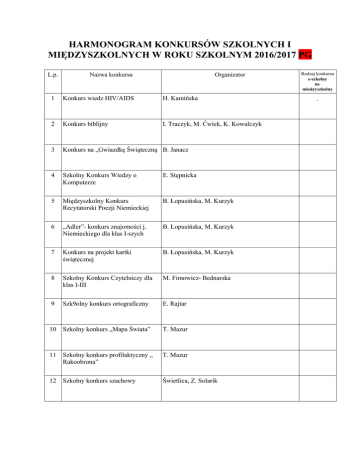 HARMONOGRAM KONKURSÓW SZKOLNYCH I MIĘDZYSZKOLNYCH W ROKU SZKOLNYM 2016/2017 PG L.p. Nazwa konkursu Organizator 1 Konkurs wiedz HIV/AIDS H. Kamińska 2 Konkurs biblijny I. Traczyk, M. Ćwiek, K. Kowalczyk 3 Konkurs na „Gwiazdkę Świąteczną B. Janacz 4 Szkolny Konkurs Wiedzy o Komputerze E. Stępnicka 5 Międzyszkolny Konkurs Recytatorski Poezji Niemieckiej B. Łopusińska, M. Kurzyk 6 „Adler”- konkurs znajomości j. Niemieckiego dla klas I-szych B. Łopusińska, M. Kurzyk 7 Konkurs na projekt kartki świątecznej B. Łopusińska, M. Kurzyk 8 Szkolny Konkurs Czytelniczy dla klas I-III M. Fimowicz- Bednarska 9 Szk9olny konkurs ortograficzny E. Rajtar 10 Szkolny konkurs „Mapa Świata” T. Mazur 11 Szkolny konkurs profilaktyczny „ Rakoobrona” T. Mazur 12 Szkolny konkurs szachowy Świetlica, Z. Solarik Rodzaj konkursu s-szkolny mmiedzyszkolny . 13 Szkolny konkurs fizyczny E.Stepień 14 Matematyczne potyczki z patronem A.Dygudaj, B. Wójcik 15 Matematyczny Kangur A.Dygudaj, B.Wójcik, P.Żak 16 Pangea- konkurs matematyczny A. Dygudaj, P.Żak, B. Wójcik 17 Matematyczne preteksty A. Dygudaj 18 Turniej dla klas III A. Dygudaj, B.Wójcik, E. Stepień gimnazjum+konkurs na najlepszego matematyka klas trzecich
