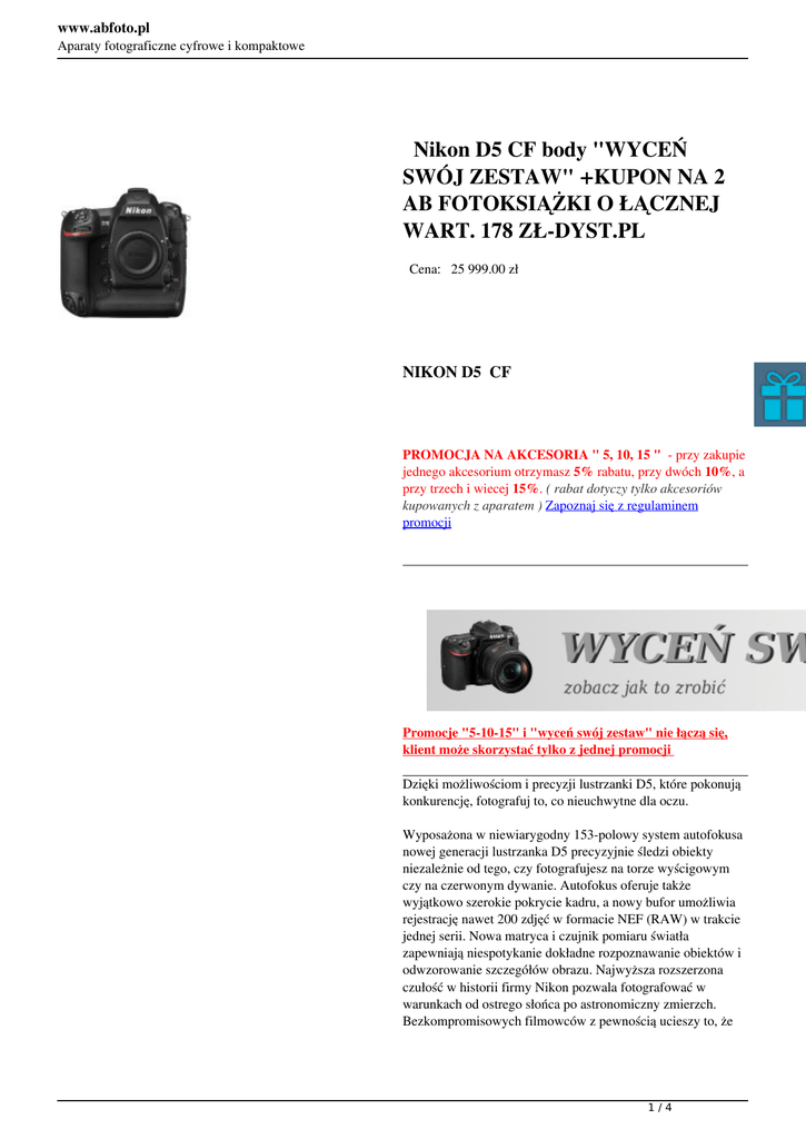 www.abfoto.pl Aparaty fotograficzne cyfrowe i kompaktowe Nikon D5 CF body "WYCEŃ SWÓJ ZESTAW" +KUPON NA 2 AB FOTOKSIĄŻKI O ŁĄCZNEJ WART. 178 ZŁ-DYST.PL Cena: 25 999.00 zł NIKON D5 CF PROMOCJA NA AKCESORIA " 5, 10, 15 " - przy zakupie jednego akcesorium otrzymasz 5% rabatu, przy dwóch 10%, a przy trzech i wiecej 15%. ( rabat dotyczy tylko akcesoriów kupowanych z aparatem ) Zapoznaj się z regulaminem promocji Promocje "5-10-15" i "wyceń swój zestaw" nie łączą się, klient może skorzystać tylko z jednej promocji Dzięki możliwościom i precyzji lustrzanki D5, które pokonują konkurencję, fotografuj to, co nieuchwytne dla oczu. Wyposażona w niewiarygodny 153-polowy system autofokusa nowej generacji lustrzanka D5 precyzyjnie śledzi obiekty niezależnie od tego, czy fotografujesz na torze wyścigowym czy na czerwonym dywanie. Autofokus oferuje także wyjątkowo szerokie pokrycie kadru, a nowy bufor umożliwia rejestrację nawet 200 zdjęć w formacie NEF (RAW) w trakcie jednej serii. Nowa matryca i czujnik pomiaru światła zapewniają niespotykanie dokładne rozpoznawanie obiektów i odwzorowanie szczegółów obrazu. Najwyższa rozszerzona czułość w historii firmy Nikon pozwala fotografować w warunkach od ostrego słońca po astronomiczny zmierzch. Bezkompromisowych filmowców z pewnością ucieszy to, że 1/4 www.abfoto.pl Aparaty fotograficzne cyfrowe i kompaktowe funkcja nagrywania filmów D-Movie pozwala na rejestrowanie aparatem materiału w rozdzielczości 4K/UHD. Pozostań w czołówce dzięki 153-polowemu autofokusowi nowej generacji i buforowi mieszczącemu 200 zdjęć w formacie NEF (RAW) Pokonaj konkurencję dzięki nowemu, fenomenalnemu autofokusowi firmy Nikon. Niewiarygodna liczba 153 pól AF i 99 pól krzyżowych sprawia, że lustrzanka D5 oferuje wyjątkowo szerokie pokrycie. Niezależnie od tego, czy fotografujesz na torze wyścigowym, czy na czerwonym dywanie, możesz zarejestrować praktycznie każdą sytuację. Małe, szybko poruszające się obiekty można śledzić z niedostępną wcześniej precyzją. Obiekty na krawędzi kadru są łatwo wykrywane, a fotografowanie w kadrze pionowym zostało znacznie udoskonalone. Czułość autofokusa już od -4 EV (ISO 100, 20°C) zapewnia nadzwyczajne działanie w słabym świetle i poprawia wydajność wszystkich trybów autofokusa. W trybie Ciągły AF można konfigurować pokrycie kadru przez pola AF w liczbie 153, 72 i 25. Wszystkie 153 pola AF działają z obiektywami AF NIKKOR z otworem względnym f/5,6 i jaśniejszymi, a 15 centralnych pól AF działa z obiektywami o otworze względnym f/8. Bufor aparatu o wysokiej pojemności: pozwala zarejestrować nawet 200 zdjęć w formacie NEF (RAW) lub dużych zdjęć JPEG w jednej szybkiej serii – to wystarczy, aby sfotografować cały finał sprintu na 100 m bez zdejmowania palca ze spustu migawki. Pokonaj konkurencję dzięki zwycięskiej kombinacji mocy i precyzji Fenomenalne możliwości lustrzanki D5 to wszystko, czego potrzeba do rejestrowania mistrzowskich zdjęć. Dzięki nowemu układowi ASIC przeznaczonemu specjalnie do obsługi autofokusa maksimum mocy obliczeniowej jest zawsze kierowane do systemu AF. Bez względu na szybkość akcji aparat nigdy nie jest słabym ogniwem. Fotografuj z szybkością do 12 kl./s z funkcją śledzenia AE/AF lub nawet 14 kl./s z podniesionym lustrem. Znacznie udoskonalono funkcję śledzenia AF i widoczność w wizjerze na potrzeby fotografii sportowej lub dowolnych sytuacji, w których fotografowane poruszające się obiekty nagle zmieniają kierunek ruchu. Szybsze sekwencyjne mechanizmy migawki i lustra znacznie skracają czas przesłonięcia wizjera podczas szybkich serii. W celu uzyskania najwyższej precyzji należy zamocować na korpusie aparatu D5 profesjonalny obiektyw NIKKOR wyposażony w tryb redukcji drgań SPORT, taki jak AF-S NIKKOR 600mm f/4E lub AF-S NIKKOR 500mm f/4E. Tryb redukcji drgań SPORT zapewnia także stabilny obraz w wizjerze podczas śledzenia szybkiego ruchu. Połącz lustrzankę D5 z jednym z tych obiektywów, aby rejestrować szybko i nieprzewidywalnie poruszające się obiekty z niezrównaną 2/4 www.abfoto.pl Aparaty fotograficzne cyfrowe i kompaktowe płynnością. Wyjdź przed szereg z nowym czujnikiem pomiaru światła i matrycą Nieskrępowana moc obrazowania lustrzanki D5 to wyzwalające doświadczenie. Nowa matryca CMOS formatu FX o rozdzielczości 20,8 megapiksela oraz czujnik pomiaru ekspozycji RGB o rozdzielczości 180 tys. pikseli zapewniają niespotykanie dokładne rozpoznawanie obiektów i odwzorowanie szczegółów obrazu. Tym aparatem można fotografować nawet najbardziej dynamiczne sporty halowe. Przejścia tonalne na zdjęciach są bogatsze i dokładniejsze. Model D5 wyposażono także w monitor LCD o przekątnej 8 cm (3,2 cala) i rozdzielczości 2360 tys. punktów, który oferuje obsługę dotykiem w trybie przeglądania. Poziom reakcji porównywalny ze smartfonami powoduje, że na tym ekranie o wysokiej rozdzielczości można szybko i łatwo sprawdzać oraz wybierać kluczowe zdjęcia. Fotografując w trybie podglądu na żywo, można dotykiem zmieniać pola AF lub przywoływać wstępnie ustawione dane punktowego balansu bieli dla wybranego obszaru w kadrze. W celu zapewnienia jeszcze większej kontroli program Picture Control 2.0 ułatwia definiowanie parametrów zarówno podczas fotografowania, jak i filmowania. Ustawienie Równomierne zapewnia maksymalny zakres dynamiki i ułatwia późniejszą obróbkę, a ustawienie Przejrzystość pozwala precyzyjnie dobrać poziom szczegółowości. Od ostrego słońca po astronomiczny zmierzch – fotografuj nawet to, czego nie dostrzeże oko Lustrzanka D5 zwiększa możliwości fotografowania w słabym świetle z maksymalnie otwartą przysłoną. Dzięki standardowemu zakresowi czułości ISO od 100 do 102400 i najwyższej rozszerzonej czułości w historii firmy Nikon możesz przekraczać granice. Nowy procesor przetwarz