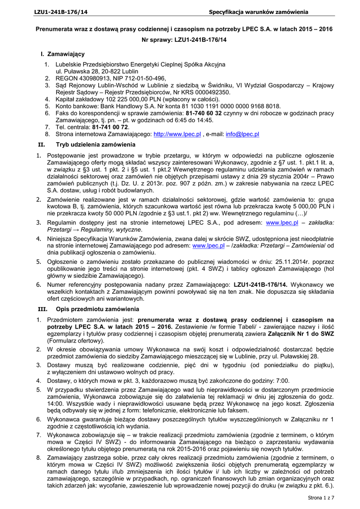 LZU1-241B-176/14 Specyfikacja warunków zamówienia Prenumerata wraz z dostawą prasy codziennej i czasopism na potrzeby LPEC S.A. w latach 2015 – 2016 Nr sprawy: LZU1-241B-176/14 I. Zamawiający 1. 2. 3. 4. 5. 6. 7. 8. II. Lubelskie Przedsiębiorstwo Energetyki Cieplnej Spółka Akcyjna ul. Puławska 28, 20-822 Lublin REGON 430980913, NIP 712-01-50-496, Sąd Rejonowy Lublin-Wschód w Lublinie z siedzibą w Świdniku, VI Wydział Gospodarczy – Krajowy Rejestr Sądowy – Rejestr Przedsiębiorców, Nr KRS 0000492350. Kapitał zakładowy 102 225 000,00 PLN (wpłacony w całości). Konto bankowe: Bank Handlowy S.A. Nr konta 81 1030 1191 0000 0000 9168 8018. Faks do korespondencji w sprawie zamówienia: 81-740 60 32 czynny w dni robocze w godzinach pracy Zamawiającego, tj. pn. – pt. w godzinach od 6:45 do 14:45. Tel. centrala: 81-741 00 72. Strona internetowa Zamawiającego: http://www.lpec.pl , e-mail: [email protected] Tryb udzielenia zamówienia 1. Postępowanie jest prowadzone w trybie przetargu, w którym w odpowiedzi na publiczne ogłoszenie Zamawiającego oferty mogą składać wszyscy zainteresowani Wykonawcy, zgodnie z §7 ust. 1. pkt.1 lit. a, w związku z §3 ust. 1 pkt. 2 i §5 ust. 1 pkt.2 Wewnętrznego regulaminu udzielania zamówień w ramach działalności sektorowej oraz zamówień nie objętych przepisami ustawy z dnia 29 stycznia 2004r – Prawo zamówień publicznych (t.j. Dz. U. z 2013r. poz. 907 z późn. zm.) w zakresie nabywania na rzecz LPEC S.A. dostaw, usług i robót budowlanych. 2. Zamówienie realizowane jest w ramach działalności sektorowej, gdzie wartość zamówienia to: grupa kwotowa B, tj. zamówienia, których szacunkowa wartość jest równa lub przekracza kwotę 5 000,00 PLN i nie przekracza kwoty 50 000 PLN /zgodnie z §3 ust.1. pkt 2) ww. Wewnętrznego regulaminu (…)/ 3. Regulamin dostępny jest na stronie internetowej LPEC S.A., pod adresem: www.lpec.pl – zakładka: Przetargi → Regulaminy, wytyczne. 4. Niniejsza Specyfikacja Warunków Zamówienia, zwana dalej w skrócie SWZ, udostępniona jest nieodpłatnie na stronie internetowej Zamawiającego pod adresem: www.lpec.pl – /zakładka: Przetargi – Zamówienia/ od dnia publikacji ogłoszenia o zamówieniu. 5. Ogłoszenie o zamówieniu zostało przekazane do publicznej wiadomości w dniu: 25.11.2014r. poprzez opublikowanie jego treści na stronie internetowej (pkt. 4 SWZ) i tablicy ogłoszeń Zamawiającego (hol główny w siedzibie Zamawiającego). 6. Numer referencyjny postępowania nadany przez Zamawiającego: LZU1-241B-176/14. Wykonawcy we wszelkich kontaktach z Zamawiającym powinni powoływać się na ten znak. Nie dopuszcza się składania ofert częściowych ani wariantowych. III. Opis przedmiotu zamówienia 1. Przedmiotem zamówienia jest: prenumerata wraz z dostawą prasy codziennej i czasopism na potrzeby LPEC S.A. w latach 2015 – 2016. Zestawienie /w formie Tabeli/ - zawierające nazwy i ilość egzemplarzy i tytułów prasy codziennej i czasopism objętej prenumeratą zawiera Załącznik Nr 1 do SWZ (Formularz ofertowy). 2. W okresie obowiązywania umowy Wykonawca na swój koszt i odpowiedzialność dostarczać będzie przedmiot zamówienia do siedziby Zamawiającego mieszczącej się w Lublinie, przy ul. Puławskiej 28. 3. Dostawy muszą być realizowane codziennie, pięć dni w tygodniu (od poniedziałku do piątku), z wyłączeniem dni ustawowo wolnych od pracy. 4. Dostawy, o których mowa w pkt. 3, każdorazowo muszą być zakończone do godziny: 7:00. 5. W przypadku stwierdzenia przez Zamawiającego wad lub nieprawidłowości w dostarczonym przedmiocie zamówienia, Wykonawca zobowiązuje się do załatwienia tej reklamacji w dniu jej zgłoszenia do godz. 14:00. Wszystkie wady i nieprawidłowości usuwane będą przez Wykonawcę na jego koszt. Zgłoszenia będą odbywały się w jednej z form: telefonicznie, elektronicznie lub faksem. 6. Wykonawca gwarantuje bieżące dostawy poszczególnych tytułów wyszczególnionych w Załączniku nr 1 zgodnie z częstotliwością ich wydania. 7. Wykonawca zobowiązuje się – w trakcie realizacji przedmiotu zamówienia (zgodnie z terminem, o którym mowa w Części IV SWZ) - do informowania Zamawiającego na bieżąco o zaprzestaniu wydawania określonego tytułu objętego prenumeratą na rok 2015-2016 oraz pojawieniu się nowych tytułów. 8. Zamawiający zastrzega sobie, przez cały okres realizacji przedmiotu zamówienia (zgodnie z terminem, o którym mowa w Części IV SWZ) możliwość zwiększenia ilości objętych prenumeratą egzemplarzy w ramach danego tytułu i/lub zmniejszenia ich ilości tytułów i/ lub ich liczby w zależności od potrzeb zamawiającego, szczególnie w przypadkach, np. ograniczeń finansowych lub zmian organizacyjnych oraz takich zdarzeń jak: wycofanie, zawieszenie lub wprowadzenie nowej pozycji do druku (w związku z pkt. 6.). Strona 1 z 7 LZU1-241B-176/14 9. 10. 11. 12. 13. IV. Specyfikacja warunków zamówienia Zmiana prenumeraty w tym trybie dokonywana będzie poprzez pisemne zawiadomienie stron i nie będzie wymagała wypowiedzenia warunków zawartej umowy. Wprowadzone w ten sposób zmiany dla swojej ważności wymagają formy pisemnej poprzez zawarcie aneksu. W okresie obowiązywania umowy ceny jednostkowe brutto tytułów objętych prenumeratą będą mogły ulec zmianie w oparciu o ceny tytułów określone przez Wydawców, a także w przypadku zmiany warunków realizacji prenumeraty w trybie określonym w pkt. 8. W przypadku zastosowania upustu - procentowa wartość upustu od ceny okładkowej tytułu objętego prenumeratą pozostanie niezmienna. Wszelkie zmiany dotyczące cen jak i tytułów (analogicznie jak w pkt. 8) Wykonawca przedstawi Zamawiającemu w formie pisemnej wraz z uzasadnieniem faktycznym i prawnym, tworząc podstawę do zawarcia zmian do umowy. Wprowadzone w ten sposób zmiany dla swojej ważności wymagają formy pisemnej poprzez zawarcie aneksu. Zamawiający dopuszcza r