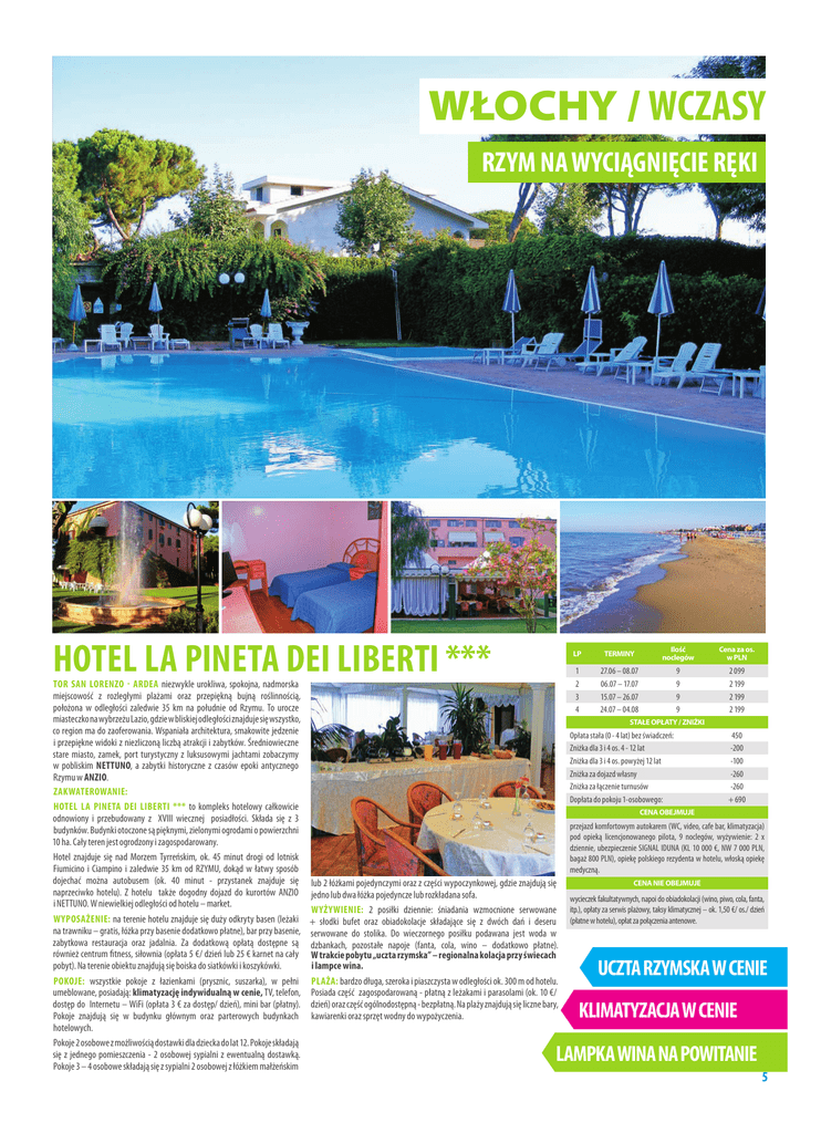 WŁOCHY / WCZASY RZYM NA WYCIĄGNIĘCIE RĘKI HOTEL LA PINETA DEI LIBERTI *** TOR SAN LORENZO - ARDEA niezwykle urokliwa, spokojna, nadmorska miejscowość z rozległymi plażami oraz przepiękną bujną roślinnością, położona w odległości zaledwie 35 km na południe od Rzymu. To urocze miasteczko na wybrzeżu Lazio, gdzie w bliskiej odległości znajduje się wszystko, co region ma do zaoferowania. Wspaniała architektura, smakowite jedzenie i przepiękne widoki z niezliczoną liczbą atrakcji i zabytków. Średniowieczne stare miasto, zamek, port turystyczny z luksusowymi jachtami zobaczymy w pobliskim NETTUNO, a zabytki historyczne z czasów epoki antycznego Rzymu w ANZIO. ZAKWATEROWANIE: HOTEL LA PINETA DEI LIBERTI *** to kompleks hotelowy całkowicie odnowiony i przebudowany z XVIII wiecznej posiadłości. Składa się z 3 budynków. Budynki otoczone są pięknymi, zielonymi ogrodami o powierzchni 10 ha. Cały teren jest ogrodzony i zagospodarowany. Hotel znajduje się nad Morzem Tyrreńskim, ok. 45 minut drogi od lotnisk Fiumicino i Ciampino i zaledwie 35 km od RZYMU, dokąd w łatwy sposób dojechać można autobusem (ok. 40 minut - przystanek znajduje się naprzeciwko hotelu). Z hotelu także dogodny dojazd do kurortów ANZIO i NETTUNO. W niewielkiej odległości od hotelu – market. WYPOSAŻENIE: na terenie hotelu znajduje się duży odkryty basen (leżaki na trawniku – gratis, łóżka przy basenie dodatkowo płatne), bar przy basenie, zabytkowa restauracja oraz jadalnia. Za dodatkową opłatą dostępne są również centrum fitness, siłownia (opłata 5 €/ dzień lub 25 € karnet na cały pobyt). Na terenie obiektu znajdują się boiska do siatkówki i koszykówki. POKOJE: wszystkie pokoje z łazienkami (prysznic, suszarka), w pełni umeblowane, posiadają: klimatyzację indywidualną w cenie, TV, telefon, dostęp do Internetu – WiFi (opłata 3 € za dostęp/ dzień), mini bar (płatny). Pokoje znajdują się w budynku głównym oraz parterowych budynkach hotelowych. Pokoje 2 osobowe z możliwością dostawki dla dziecka do lat 12. Pokoje składają się z jednego pomieszczenia - 2 osobowej sypialni z ewentualną dostawką. Pokoje 3 – 4 osobowe składają się z sypialni 2 osobowej z łóżkiem małżeńskim LP TERMINY Ilość noclegów Cena za os. w PLN 1 2 3 4 27.06 – 08.07 06.07 – 17.07 15.07 – 26.07 24.07 – 04.08 9 9 9 9 2 099 2 199 2 199 2 199 STAŁE OPŁATY / ZNIŻKI Opłata stała (0 - 4 lat) bez świadczeń: Zniżka dla 3 i 4 os. 4 - 12 lat Zniżka dla 3 i 4 os. powyżej 12 lat Zniżka za dojazd własny Zniżka za łączenie turnusów Dopłata do pokoju 1-osobowego: 450 -200 -100 -260 -260 + 690 CENA OBEJMUJE przejazd komfortowym autokarem (WC, video, cafe bar, klimatyzacja) pod opieką licencjonowanego pilota, 9 noclegów, wyżywienie: 2 x dziennie, ubezpieczenie SIGNAL IDUNA (KL 10 000 €, NW 7 000 PLN, bagaż 800 PLN), opiekę polskiego rezydenta w hotelu, włoską opiekę medyczną. lub 2 łóżkami pojedynczymi oraz z części wypoczynkowej, gdzie znajdują się jedno lub dwa łóżka pojedyncze lub rozkładana sofa. WYŻYWIENIE: 2 posiłki dziennie: śniadania wzmocnione serwowane + słodki bufet oraz obiadokolacje składające się z dwóch dań i deseru serwowane do stolika. Do wieczornego posiłku podawana jest woda w dzbankach, pozostałe napoje (fanta, cola, wino – dodatkowo płatne). W trakcie pobytu „uczta rzymska” – regionalna kolacja przy świecach i lampce wina. PLAŻA: bardzo długa, szeroka i piaszczysta w odległości ok. 300 m od hotelu. Posiada część zagospodarowaną - płatną z leżakami i parasolami (ok. 10 €/ dzień) oraz część ogólnodostępną - bezpłatną. Na plaży znajdują się liczne bary, kawiarenki oraz sprzęt wodny do wypożyczenia. CENA NIE OBEJMUJE wycieczek fakultatywnych, napoi do obiadokolacji (wino, piwo, cola, fanta, itp.), opłaty za serwis plażowy, taksy klimatycznej – ok. 1,50 €/ os./ dzień (płatne w hotelu), opłat za połączenia antenowe. UCZTA RZYMSKA W CENIE KLIMATYZACJA W CENIE LAMPKA WINA NA POWITANIE 5