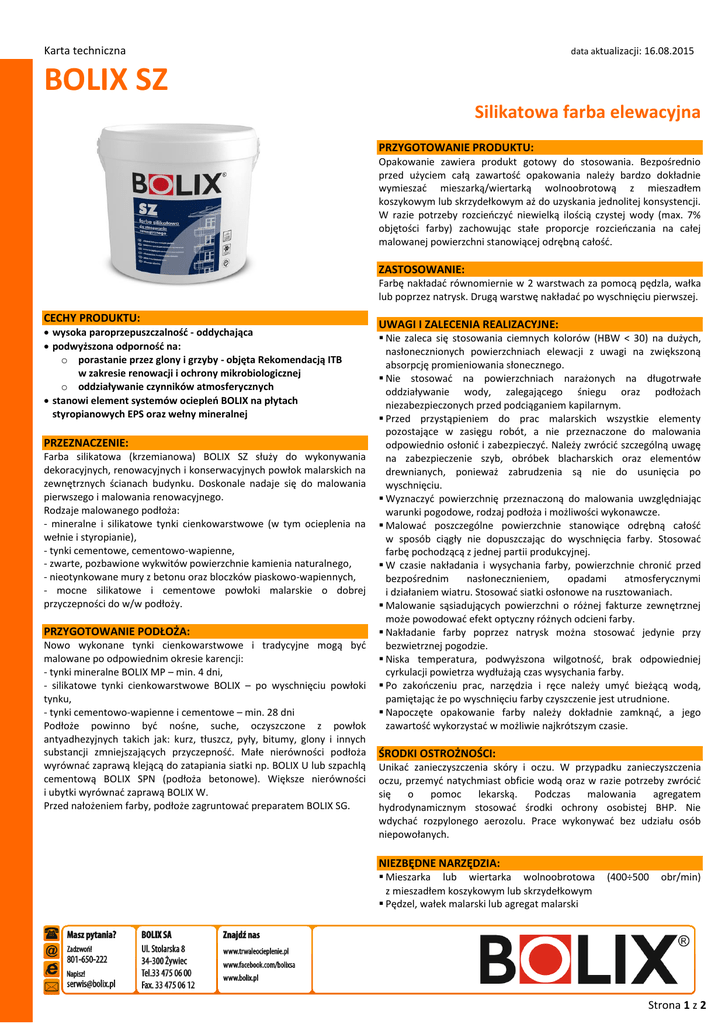 Karta techniczna data aktualizacji: 16.08.2015 BOLIX SZ Silikatowa farba elewacyjna PRZYGOTOWANIE PRODUKTU: Opakowanie zawiera produkt gotowy do stosowania. Bezpośrednio przed użyciem całą zawartość opakowania należy bardzo dokładnie wymieszać mieszarką/wiertarką wolnoobrotową z mieszadłem koszykowym lub skrzydełkowym aż do uzyskania jednolitej konsystencji. W razie potrzeby rozcieńczyć niewielką ilością czystej wody (max. 7% objętości farby) zachowując stałe proporcje rozcieńczania na całej malowanej powierzchni stanowiącej odrębną całość. ZASTOSOWANIE: Farbę nakładać równomiernie w 2 warstwach za pomocą pędzla, wałka lub poprzez natrysk. Drugą warstwę nakładać po wyschnięciu pierwszej. CECHY PRODUKTU: wysoka paroprzepuszczalność - oddychająca podwyższona odporność na: o porastanie przez glony i grzyby - objęta Rekomendacją ITB w zakresie renowacji i ochrony mikrobiologicznej o oddziaływanie czynników atmosferycznych stanowi element systemów ociepleń BOLIX na płytach styropianowych EPS oraz wełny mineralnej PRZEZNACZENIE: Farba silikatowa (krzemianowa) BOLIX SZ służy do wykonywania dekoracyjnych, renowacyjnych i konserwacyjnych powłok malarskich na zewnętrznych ścianach budynku. Doskonale nadaje się do malowania pierwszego i malowania renowacyjnego. Rodzaje malowanego podłoża: - mineralne i silikatowe tynki cienkowarstwowe (w tym ocieplenia na wełnie i styropianie), - tynki cementowe, cementowo-wapienne, - zwarte, pozbawione wykwitów powierzchnie kamienia naturalnego, - nieotynkowane mury z betonu oraz bloczków piaskowo-wapiennych, - mocne silikatowe i cementowe powłoki malarskie o dobrej przyczepności do w/w podłoży. PRZYGOTOWANIE PODŁOŻA: Nowo wykonane tynki cienkowarstwowe i tradycyjne mogą być malowane po odpowiednim okresie karencji: - tynki mineralne BOLIX MP – min. 4 dni, - silikatowe tynki cienkowarstwowe BOLIX – po wyschnięciu powłoki tynku, - tynki cementowo-wapienne i cementowe – min. 28 dni Podłoże powinno być nośne, suche, oczyszczone z powłok antyadhezyjnych takich jak: kurz, tłuszcz, pyły, bitumy, glony i innych substancji zmniejszających przyczepność. Małe nierówności podłoża wyrównać zaprawą klejącą do zatapiania siatki np. BOLIX U lub szpachlą cementową BOLIX SPN (podłoża betonowe). Większe nierówności i ubytki wyrównać zaprawą BOLIX W. Przed nałożeniem farby, podłoże zagruntować preparatem BOLIX SG. UWAGI I ZALECENIA REALIZACYJNE: Nie zaleca się stosowania ciemnych kolorów (HBW < 30) na dużych, nasłonecznionych powierzchniach elewacji z uwagi na zwiększoną absorpcję promieniowania słonecznego. Nie stosować na powierzchniach narażonych na długotrwałe oddziaływanie wody, zalegającego śniegu oraz podłożach niezabezpieczonych przed podciąganiem kapilarnym. Przed przystąpieniem do prac malarskich wszystkie elementy pozostające w zasięgu robót, a nie przeznaczone do malowania odpowiednio osłonić i zabezpieczyć. Należy zwrócić szczególną uwagę na zabezpieczenie szyb, obróbek blacharskich oraz elementów drewnianych, ponieważ zabrudzenia są nie do usunięcia po wyschnięciu. Wyznaczyć powierzchnię przeznaczoną do malowania uwzględniając warunki pogodowe, rodzaj podłoża i możliwości wykonawcze. Malować poszczególne powierzchnie stanowiące odrębną całość w sposób ciągły nie dopuszczając do wyschnięcia farby. Stosować farbę pochodzącą z jednej partii produkcyjnej. W czasie nakładania i wysychania farby, powierzchnie chronić przed bezpośrednim nasłonecznieniem, opadami atmosferycznymi i działaniem wiatru. Stosować siatki osłonowe na rusztowaniach. Malowanie sąsiadujących powierzchni o różnej fakturze zewnętrznej może powodować efekt optyczny różnych odcieni farby. Nakładanie farby poprzez natrysk można stosować jedynie przy bezwietrznej pogodzie. Niska temperatura, podwyższona wilgotność, brak odpowiedniej cyrkulacji powietrza wydłużają czas wysychania farby. Po zakończeniu prac, narzędzia i ręce należy umyć bieżącą wodą, pamiętając że po wyschnięciu farby czyszczenie jest utrudnione. Napoczęte opakowanie farby należy dokładnie zamknąć, a jego zawartość wykorzystać w możliwie najkrótszym czasie. ŚRODKI OSTROŻNOŚCI: Unikać zanieczyszczenia skóry i oczu. W przypadku zanieczyszczenia oczu, przemyć natychmiast obficie wodą oraz w razie potrzeby zwrócić się o pomoc lekarską. Podczas malowania agregatem hydrodynamicznym stosować środki ochrony osobistej BHP. Nie wdychać rozpylonego aerozolu. Prace wykonywać bez udziału osób niepowołanych. NIEZBĘDNE NARZĘDZIA: Mieszarka lub wiertarka wolnoobrotowa z mieszadłem koszykowym lub skrzydełkowym Pędzel, wałek malarski lub agregat malarski (400÷500 obr/min) Strona 1 z 2 Karta techniczna data aktualizacji: 16.08.2015 BOLIX SZ Silikatowa farba elewacyjna DANE TECHNICZNE: ORIENTACYJNE ZUŻYCIE: Poniższe parametry techniczne odnoszą się do warunków optymalnych, tj. temperatury +23 (±2)°C i wilgotności względnej powietrza 50 (±5)%. W innych warunkach podane parametry mogą ulec zmianie. ■ 0,18 – 0,25 l/m2 – gładkie, niechłonne podłoże przy dwukrotnym malowaniu ■ 0,30 – 0,4l/m2 – podłoże chropowate (np. tynki strukturalne BOLIX) przy dwukrotnym malowaniu Temperatura otoczenia i podłoża w trakcie nakładania i wysychania farby: od +10°C do +25°C Wilgotność względna powietrza w trakcie nakładania i wysychania farby: od 30 do 80% pH: ok. 11,1 Gęstość objętościowa farb bazowych: ok. 1,46 kg/dm3 Kolorystyka: wybrane kolory z palety barw BOLIX KOLOR 300+ Spektrum Połysk wg EN ISO 2813: matowy - kategoria G3 Wielkość ziarna wg PN-EN 1062-1: <100 µm - kategoria S1 Czas schnięcia powierzchniowego powłoki farby: min. 2h Czas uzyskania pełnej odporności na szorowanie wg PN-C-81913: min. 28 dni Odporność powłoki na szorowanie normowe wg PN-C-81913: >2000 cykli Op