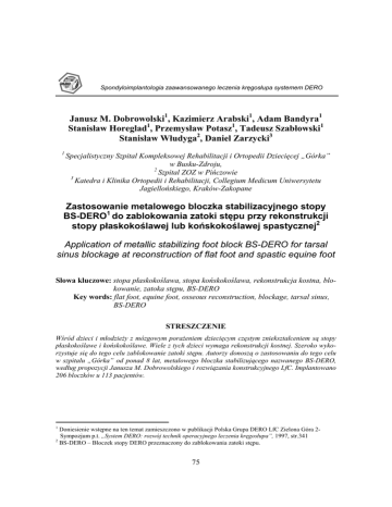 Spondyloimplantologia zaawansowanego leczenia kręgosłupa systemem DERO Janusz M. Dobrowolski1, Kazimierz Arabski1, Adam Bandyra1 Stanisław Horeglad1, Przemysław Potasz1, Tadeusz Szabłowski1 Stanisław Włudyga2, Daniel Zarzycki3 1 Specjalistyczny Szpital Kompleksowej Rehabilitacji i Ortopedii Dziecięcej „Górka” w Busku-Zdroju, 2 Szpital ZOZ w Pińczowie 3 Katedra i Klinika Ortopedii i Rehabilitacji, Collegium Medicum Uniwersytetu Jagiellońskiego, Kraków-Zakopane Zastosowanie metalowego bloczka stabilizacyjnego stopy BS-DERO1 do zablokowania zatoki stępu przy rekonstrukcji stopy płaskokoślawej lub końskokoślawej spastycznej2 Application of metallic stabilizing foot block BS-DERO for tarsal sinus blockage at reconstruction of flat foot and spastic equine foot Słowa kluczowe: stopa płaskokoślawa, stopa końskokoślawa, rekonstrukcja kostna, blokowanie, zatoka stępu, BS-DERO Key words: flat foot, equine foot, osseous reconstruction, blockage, tarsal sinus, BS-DERO STRESZCZENIE Wśród dzieci i młodzieży z mózgowym porażeniem dziecięcym częstym zniekształceniem są stopy płaskokoślawe i końskokoślawe. Wiele z tych dzieci wymaga rekonstrukcji kostnej. Szeroko wykorzystuje się do tego celu zablokowanie zatoki stępu. Autorzy donoszą o zastosowaniu do tego celu w szpitalu „Górka” od ponad 8 lat, metalowego bloczka stabilizującego nazwanego BS-DERO, według propozycji Janusza M. Dobrowolskiego i rozwiązania konstrukcyjnego LfC. Implantowano 206 bloczków u 113 pacjentów. 1 Doniesienie wstępne na ten temat zamieszczono w publikacji Polska Grupa DERO LfC Zielona Góra 2Sympozjum p.t. „System DERO: rozwój technik operacyjnego leczenia kręgosłupa”, 1997, str.341 2 BS-DERO – Bloczek stopy DERO przeznaczony do zablokowania zatoki stępu. 75 76 Janusz M. Dobrowolski, Kazimierz Arabski, Adam Bandyra, Stanisław Horeglad i inni... ABSTRACT Among children and youth affected by cerebral palsy the equine foots and flat foots are frequent deformations. Lots of children require the osseous reconstruction. For this purpose the blockage of tarsal sinus is widely used. The authors present the results of over 8 years of application, in “Górka” hospital, of metallic stabilizing block named BS-DERO, according to proposition of Janusz M. Dobrowolski and construction solution of LfC. 206 blocks at 113 patients were implanted. WSTĘP Specjalistyczny Szpital Kompleksowej Rehabilitacji i Ortopedii Dziecięcej „Górka” w Busku-Zdroju jest niepublicznym zakładem opieki zdrowotnej będącym częścią organizacyjną „Uzdrowiska Busko Zdrój” S.A. To 4 oddziałowy, 164 łóżkowy szpital zajmujący się leczeniem operacyjnym przypadków ortopedycznych (bez urazówki) oraz kompleksową rehabilitacją. Każdy oddział jest jednocześnie ortopedyczny i rehabilitacyjny. W tym samym więc oddziale dziecko jest poddawane operacji i rehabilitacji. Leczymy pacjentów do końca wieku rozwojowego. Większość pacjentów to dzieci i młodzież z porażeniem mózgowym. Operatywa ortopedyczna obejmuje wady wrodzone, skoliozy, wydłużanie i korekty osi kończyn oraz wszystkie zabiegi korekcyjne w mózgowym porażeniu dziecięcym. OMÓWIENIE Duże zniekształcenia płaskokoślawe i końskokoślawe stóp u dzieci z mózgowym porażeniem bywają jednym z głównych powodów niemożliwości poprawienia ich lokomocji. U dzieci od 9 roku życia szeroko w ortopedii stosuje się rekonstrukcję kostną tych zniekształceń przez zablokowanie zatoki stępu blaszką kostną korówkową pobraną z piszczeli (wg techniki Green-Gricea). Ponieważ jest zrozumiałe, że zablokowanie takie prowadzić ma w istocie do artrodezy skokowo-piętowej w pozycji czynnościowo korzystnej, a wiec w pozycji prawidłowego niekoślawego ustawienia stawu skokowo-piętowego, w Szpitalu „Górka” od lat dokładamy starań aby to skorygowane ustawienie było trwałe i nie pogarszało się z czasem. Poszerzyliśmy więc zabieg o dokładanie przeszczepu kostnego gąbczastego z przodu i tyłu blokującej zatokę blaszki kostnej. U tych dzieci, u których spotykaliśmy specjalnie duże nasilenie spatyczności mieści strzałkowych, zgodnie z techniką podaną przez Tomasza Goryńskiego, przenosimy dodatkowo ścięgno m. strzałkowego krótkiego na ścięgna m. piszczelowego tylnego. To znacznie poprawiło wyniki, gdyż uzyskujemy pomocną nam siłę podnoszącą przyśrodkowy brzeg stopy i zmniejszającą spastyczną presję na ponowne zapadanie się zatoki stępu i ponowne koślawienie stopy przed wgojeniem się przeszczepu. Sądzimy, że wgajanie się przeszczepu trwa około 10 miesięcy. Stale istnieje konieczność balansowania pomiędzy dwiema sprzecznymi racjami. Z jednej strony dziecko spastyczne nie może leżeć miesiącami czekając na dobre wgojenie przeszczepu, a z drugiej, jeśli obciążymy niewygojony przeszczep, obserwujemy zbyt dużo niezadowalających wyników. Zastosowanie metalowego bloczka stabilizacyjnego stopy BS-DERO... Sprzeczność ta powoduje jeszcze gorsze samopoczucie operatora, gdy dodamy, że duża większość pacjentów wymaga operacji obu stóp jednocześnie, a wyniki odległe obserwujemy sami, bo sami operujemy i sami rehabilitujemy tych pacjentów i widujemy jak na naszych oczach wynik początkowo dobry ewoluuje ku coraz gorszemu. To spowodowało myślenie o zastosowaniu implantu. Pomysł zastosowania metalowego bloczka stabilizująco-blokującego zatokę stępu (BS-DERO) powstał w czasie IV kursu DERO w listopadzie 1996r. w Zakopanem i po dogłębnej dyskusji współautorów doniesienia z L. Ciupikiem zaproponowano jego konstrukcję i procedurę implantowania. Konstrukcja bloczka w postaci ażurowego wydrążonego, prostokątnego, wykonanego z tytanu koszyczka jak na rys. 1 wraz ze stalowym prowadnikiem – pobijakiem do jego wprowadzania pozwala na zastąpienie kostnej blaszki korowej pobranej z przednio-przyśrodkowej powierzchni piszczeli tym odpornym mechanicznie i