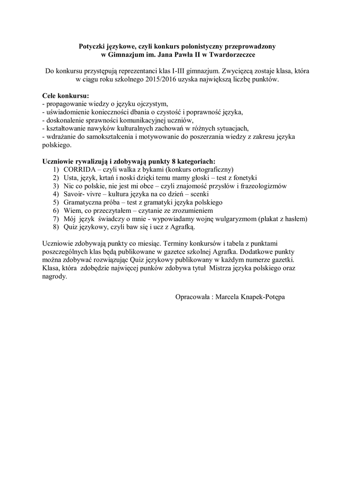 Potyczki językowe, czyli konkurs polonistyczny przeprowadzony w Gimnazjum im. Jana Pawła II w Twardorzeczce Do konkursu przystępują reprezentanci klas I-III gimnazjum. Zwycięzcą zostaje klasa, która w ciągu roku szkolnego 2015/2016 uzyska największą liczbę punktów. Cele konkursu: - propagowanie wiedzy o języku ojczystym, - uświadomienie konieczności dbania o czystość i poprawność języka, - doskonalenie sprawności komunikacyjnej uczniów, - kształtowanie nawyków kulturalnych zachowań w różnych sytuacjach, - wdrażanie do samokształcenia i motywowanie do poszerzania wiedzy z zakresu języka polskiego. Uczniowie rywalizują i zdobywają punkty 8 kategoriach: 1) CORRIDA – czyli walka z bykami (konkurs ortograficzny) 2) Usta, język, krtań i noski dzięki temu mamy głoski – test z fonetyki 3) Nic co polskie, nie jest mi obce – czyli znajomość przysłów i frazeologizmów 4) Savoir- vivre – kultura języka na co dzień – scenki 5) Gramatyczna próba – test z gramatyki języka polskiego 6) Wiem, co przeczytałem – czytanie ze zrozumieniem 7) Mój język świadczy o mnie - wypowiadamy wojnę wulgaryzmom (plakat z hasłem) 8) Quiz językowy, czyli baw się i ucz z Agrafką. Uczniowie zdobywają punkty co miesiąc. Terminy konkursów i tabela z punktami poszczególnych klas będą publikowane w gazetce szkolnej Agrafka. Dodatkowe punkty można zdobywać rozwiązując Quiz językowy publikowany w każdym numerze gazetki. Klasa, która zdobędzie najwięcej punków zdobywa tytuł Mistrza języka polskiego oraz nagrody. Opracowała : Marcela Knapek-Potępa