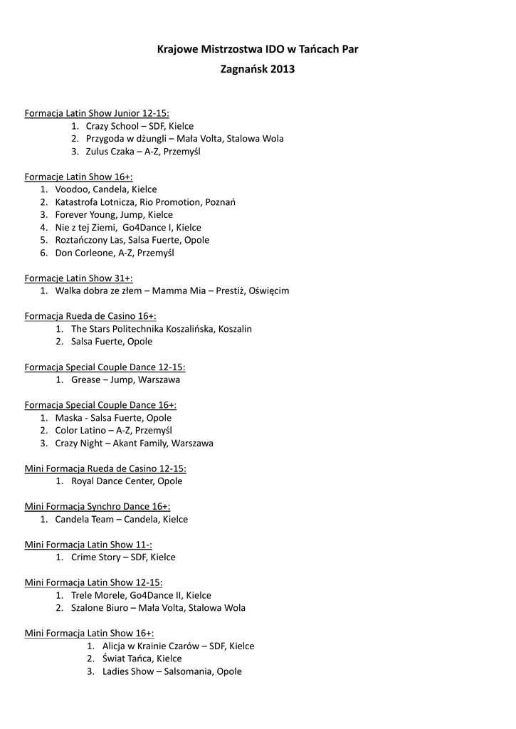 Krajowe Mistrzostwa IDO w Tańcach Par Zagnańsk 2013 Formacja Latin Show Junior 12-15: 1. Crazy School – SDF, Kielce 2. Przygoda w dżungli – Mała Volta, Stalowa Wola 3. Zulus Czaka – A-Z, Przemyśl Formacje Latin Show 16+: 1. Voodoo, Candela, Kielce 2. Katastrofa Lotnicza, Rio Promotion, Poznań 3. Forever Young, Jump, Kielce 4. Nie z tej Ziemi, Go4Dance I, Kielce 5. Roztańczony Las, Salsa Fuerte, Opole 6. Don Corleone, A-Z, Przemyśl Formacje Latin Show 31+: 1. Walka dobra ze złem – Mamma Mia – Prestiż, Oświęcim Formacja Rueda de Casino 16+: 1. The Stars Politechnika Koszalińska, Koszalin 2. Salsa Fuerte, Opole Formacja Special Couple Dance 12-15: 1. Grease – Jump, Warszawa Formacja Special Couple Dance 16+: 1. Maska - Salsa Fuerte, Opole 2. Color Latino – A-Z, Przemyśl 3. Crazy Night – Akant Family, Warszawa Mini Formacja Rueda de Casino 12-15: 1. Royal Dance Center, Opole Mini Formacja Synchro Dance 16+: 1. Candela Team – Candela, Kielce Mini Formacja Latin Show 11-: 1. Crime Story – SDF, Kielce Mini Formacja Latin Show 12-15: 1. Trele Morele, Go4Dance II, Kielce 2. Szalone Biuro – Mała Volta, Stalowa Wola Mini Formacja Latin Show 16+: 1. Alicja w Krainie Czarów – SDF, Kielce 2. Świat Tańca, Kielce 3. Ladies Show – Salsomania, Opole 4. Moulin Rouge – A-Z, Przemyśl Solo Salsa Shines dz. 11- : 1. Kałka Alicja – SDF, Kielce 2. Szewczyk Kinga – SDF, Kielce 3. Banasiewicz Weronika – SDF, Kielce 4. Kasprzyk Nina – SDF, Kielce 5. Golda Michalina – SDF, Kielce 6. Golda Magdalena – SDF, Kielce 7. Reczyńska Julia – SDF, Kielce 8. Piłat Aleksandra – SDF, Kielce 9. Miazga Ewa - Mała Volta, Stalowa Wola 10. Piekarz Paulina - Royal Dance Center, Opole 11. Krzyżak Weronika – Go4Dance, Kielce Solo Salsa Shines dz. 12-15: 1. Salwa Wiktoria – Candela, Kielce 2. Młynik Paulina – Candela, Kielce 3. Ciopińska Karolina – SDF, Kielce 4. Golda Gabriela – SDF, Kielce 5. Kosowska Weronika – SDF, Kielce 6. Kozłowska Wiktoria – SDF, Kielce 7. Pela Magdalena – SDF, Kielce 8. Sroka Daria – SDF, Kielce 9. Zygadlewicz Aleksandra – SDF, Kielce 10. Chudzicka Julia – SDF, Kielce 11. Pawlik Kaja – SDF, Kielce 12. Malopolska Aleksandra – SDF, Kielce 13. Jedlińska Katarzyna – SDF, Kielce 14. Grabowska Aleksandra – SDF, Kielce 15. Krzepkowska Milena – SDF, Kielce 16. Tworek Wiktoria - Świat Tańca, Kielce 17. Steć Greta - Mała Volta, Stalowa Wola 18. Kotwica Laura - Mała Volta, Stalowa Wola 19. Porębska Katarzyna - Mała Volta, Stalowa Wola 20. Nowak Zuzanna - Mała Volta, Stalowa Wola 21. Kołodziej Monika – Salsomania, Opole 22. Batel Wiktoria – Adamant Studio, Biała 23. Perdek Klaudia – Adamant Studio, Biała 24. Grzywacz Joanna – Jowita Fitdance, Gdynia 25. Siczek Nikola – Jowita Fitdance, Gdynia 26. Kaśków Julia - Royal Dance Center, Opole 27. Kawa Natalia - Royal Dance Center, Opole 28. Pakulska Judyta - Royal Dance Center, Opole 29. Sobczak Magdalena - Royal Dance Center, Opole 30. Wróbel Anna - Royal Dance Center, Opole 31. Pszonak Róża - A-Z, Przemyśl 32. Godos Klaudia - A-Z, Przemyśl 33. Raba Karolina - A-Z, Przemyśl 34. Półchłopek Karolina - A-Z, Przemyśl 35. Błahuciak Kinga - A-Z, Przemyśl 36. Korecka Justyna - A-Z, Przemyśl Solo Salsa Shine chł. 12-15: 1. Cebulski Grzegorz – SDF, Kielce 2. Żak Grzegorz – SDF, Kielce 3. Bury Wojciech - Royal Dance Center, Opole 4. Kurek Marcin - Royal Dance Center, Opole 5. Głowacki Mateusz - Royal Dance Center, Opole 6. Wysocki Michał - Royal Dance Center, Opole Solo Salsa Shines dz. 16+: 1. Ali Mariam – Rio Promotion, Poznań 2. Uba Magdalena – Rio Promotion, Poznań 3. Karbowiak Dorota – Extreme Studio, Lublin 4. Kisiel Izabela - Extreme Studio, Lublin 5. Mazur Agnieszka - Extreme Studio, Lublin 6. Popik Agnieszka - Extreme Studio, Lublin 7. Wasilczuk Marlena - Extreme Studio, Lublin 8. Łataś Katarzyna – Candela, Kielce 9. Dereniewicz Olga – Candela, Kielce 10. Gryz Karolina – Go4Dance, Kielce 11. Janowska Magdalena – Go4Dance, Kielce 12. Łataś Iwona – Go4Dance, Kielce 13. Nowak Agata – Go4Dance, Kielce 14. Wesołowska Monika – Go4Dance, Kielce 15. Kundera Klaudia – SDF, Kielce 16. Michałek Anna – SDF, Kielce 17. Pobocha Izabela – SDF, Kielce 18. Przydatek Barbara – Świat Tańca, Kielce 19. Cebula Natalia - Mała Volta, Stalowa Wola 20. Jasiel Kinga - Jowita Fitdance, Gdynia 21. Pachocka Aleksandra - Jowita Fitdance, Gdynia 22. Mroziak Dominika - Jowita Fitdance, Gdynia 23. Miller Anna - Jowita Fitdance, Gdynia 24. Domerecka Aleksandra - Royal Dance Center, Opole 25. Adamek Gabriela - A-Z, Przemyśl 26. Storc Jolanta - A-Z, Przemyśl 27. Madejczyk (Frąk) Inga - A-Z, Przemyśl 28. Podbiegła Katarzyna - A-Z, Przemyśl 29. Oliwia Białogłowska - The Salsa Kings, Gdynia Solo Salsa Shine chł. 16+: 1. Mazur Tomasz – Rio Promotion, Poznań 2. Grzywniak Cezary – Rio Promotion, Poznań 3. Zacharski Mariusz – Candela, Kielce 4. Górski Piotr – Go4Dance, Kielce 5. Midura Łukasz – SDF, Kielce 6. Baczkur Marcin - Royal Dance Center, Opole 7. Bielecki Remigiusz - Royal Dance Center, Opole 8. Symala Łukasz - Royal Dance Center, Opole 9. Szmuc Adam - Royal Dance Center, Opole Solo Latin Show dz. 11-: 1. Słapek Bernadetta – Lekcja muzyki – Świat Tańca, Kielce Solo Latin Show dz. 12-15: 1. Salwa Wiktoria – Super Mario – Candela, Kielce 2. Szewczyk Julia – Santa Claus is coming to town – Candela, Kielce 3. Zygadlewicz Aleksandra – Zakonnica w przebraniu – SDF, Kielce 4. Ciopińska Karolina – Szalona Uczennica – SDF, Kielce 5. Kozłowska Wiktoria – Tomb Rider – SDF, Kielce 6. Kołodziej Monika – When The Sun goes down – Salsomania, Opole 7. Batel Wiktoria – Miss Captain – Adamant Studio, Biała 8. Perdek Klaudia – Dark Angel – Adamant Studio, Biała 9. Pszonak Róża – House Keeping - A-Z, Przemyśl 10. Godos Klaudia – Funny School - A-Z, Przemyśl Solo Latin Show dz