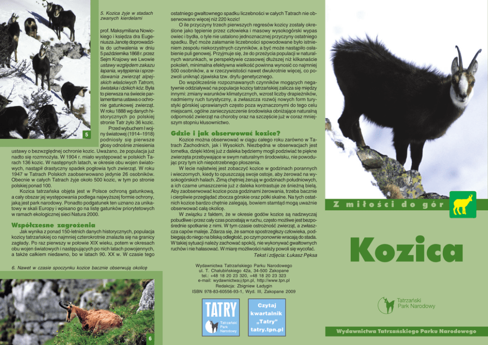 5. Kozica żyje w stadach zwanych kierdelami prof. Maksymiliana Nowic− kiego i księdza dra Euge− niusza Janotę doprowadzi− ła do uchwalenia w dniu 5 października 1868 r. przez Sejm Krajowy we Lwowie ustawy względem zakazu łapania, wytępienia i sprze− dawania zwierząt alpej− skich właściwych Tatrom, świstaka i dzikich kóz. Była to pierwsza na świecie par− lamentarna ustawa o ochro− nie gatunkowej zwierząt. W roku 1888 wg danych hi− storycznych po polskiej stronie Tatr żyło 36 kozic. Przed wybuchem I woj− ny światowej (1914–1918) 5 podniosły się pierwsze głosy odnośnie zniesienia ustawy o bezwzględnej ochronie kozic. Uważano, że populacja już nadto się rozmnożyła. W 1904 r. miało występować w polskich Ta− rach 136 kozic. W następnych latach, w okresie obu wojen świato− wych, nastąpił drastyczny spadek pogłowia tych zwierząt. W roku 1947 w Tatrach Polskich zaobserwowano jedynie 26 osobników. Obecnie w całych Tatrach żyje około 500 kozic, w tym po stronie polskiej ponad 100. Kozica tatrzańska objęta jest w Polsce ochroną gatunkową, a cały obszar jej występowania podlega najwyższej formie ochrony, jaką jest park narodowy. Ponadto podgatunek ten uznano za unika− towy w skali Europy i wpisano go na listę gatunków priorytetowych w ramach ekologicznej sieci Natura 2000. Współczesne zagrożenia Jak wynika z ponad 150−letnich danych historycznych, populacja kozicy tatrzańskiej co najmniej czterokrotnie znalazła się na granicy zagłady. Po raz pierwszy w połowie XIX wieku, potem w okresach obu wojen światowych i następujących po nich latach powojennych, a także całkiem niedawno, bo w latach 90. XX w. W czasie tego ostatniego gwałtownego spadku liczebności w całych Tatrach nie ob− serwowano więcej niż 220 kozic! O ile przyczyny trzech pierwszych regresów kozicy zostały okre− ślone jako tępienie przez człowieka i masowy wysokogórski wypas owiec i bydła, o tyle nie ustalono jednoznacznej przyczyny ostatniego spadku. Być może załamanie liczebności spowodowane było istnie− niem zespołu niekorzystnych czynników, a być może nastąpiło osła− bienie puli genowej. Przyjmuje się, że do przeżycia populacji w natural− nych warunkach, w perspektywie czasowej dłuższej niż kilkanaście pokoleń, minimalna efektywna wielkość powinna wynosić co najmniej 500 osobników, a w rzeczywistości nawet dwukrotnie więcej, co po− zwoli uniknąć zjawiska tzw. dryfu genetycznego. Do współcześnie rozpoznawanych czynników mogących nega− tywnie oddziaływać na populacje kozicy tatrzańskiej zalicza się między innymi: zmiany warunków klimatycznych, wzrost liczby drapieżników, nadmierny ruch turystyczny, a zwłaszcza rozwój nowych form tury− styki górskiej uprawianych często poza wyznaczonymi do tego celu miejscami, ogólne zanieczyszczenie środowiska obniżające naturalną odporność zwierząt na choroby oraz na szczęście już w coraz mniej− szym stopniu kłusownictwo. Gdzie i jak obserwować kozice? Kozice można obserwować w ciągu całego roku zarówno w Ta− trach Zachodnich, jak i Wysokich. Niezbędna w obserwacjach jest lornetka, dzięki której już z daleka będziemy mogli podziwiać te piękne zwierzęta przebywające w swym naturalnym środowisku, nie powodu− jąc przy tym ich niepotrzebnego płoszenia. W lecie najłatwiej jest zobaczyć kozice w godzinach porannych i wieczornych, kiedy to opuszczają swoje ostoje, aby żerować na wy− sokogórskich halach. Zimą chętniej żerują w godzinach południowych, a ich czarne umaszczenie już z daleka kontrastuje ze śnieżną bielą. Aby zaobserwować kozice poza godzinami żerowania, trzeba bacznie i cierpliwie przeglądać zbocza górskie oraz półki skalne. Na tych ostat− nich kozice bardzo chętnie zalegają, bowiem stamtąd mogą uważnie obserwować całą okolicę. W związku z faktem, że w okresie godów kozice są nadzwyczaj pobudliwe i przez cały czas pozostają w ruchu, często możliwe jest bezpo− średnie spotkanie z nimi. W tym czasie ostrożność zwierząt, a zwłasz− cza capów maleje. Zdarza się, że samce spostrzegłszy człowieka, pod− biegają do niego na bliską odległość, po czym ponownie wracają do stada. W takiej sytuacji należy zachować spokój, nie wykonywać gwałtownych ruchów i nie hałasować. W miarę możliwości należy powoli się wycofać. Tekst i zdjęcia: Łukasz Pęksa Wydawnictwa Tatrzańskiego Parku Narodowego ul. T. Chałubińskiego 42a, 34−500 Zakopane tel.: +48 18 20 23 320, +48 18 20 23 323 e−mail: [email protected], http://www.tpn.pl Redakcja: Zbigniew Ładygin ISBN 978−83−60556−93−1, Wyd. III, Zakopane 2009 6. Nawet w czasie spoczynku kozice bacznie obserwują okolicę Z miłości do gór Kozica Czytaj kwartalnik „Tatry” tatry.tpn.pl 6 Wydawnictwa Tatrzańskiego Parku Narodowego Kozica, żywy symbol Tatr, na stałe wpisała się w świado− mość mieszkańców Podhala jako przykład swobody i umi− łowania gór. Łowy na nią stanowiły spełnienie marzeń i pragnień kolejnych pokoleń myśliwych. Była i wciąż jest bohaterką ludowych gadek i opowieści, piosenek oraz pie− śni, motywem malowideł na szkle, rzeźb i płaskorzeźb. Od niej wywodzą się lokalne nazwy: Kozi Wierch, Kozia Doli− na, Kozi Grzbiet itp. Dla obu transgranicznych parków na− rodowych – polskiego Tatrzańskiego Parku Narodowego (TPN) oraz słowackiego Tatranského národného parku (TANAP) – powstałych w połowie minionego wieku kozica stała się godłem i zarazem nadrzędnym celem ochrony. Pochodzenie i występowanie Pierwsze ślady obecności kozic pochodzą z końca plejstocenu europejskiego, a więc sprzed ponad 30 tys. lat. Przesuwające się wówczas lodowce z północy Europy i z Alp wyparły te zwierzęta ze szczytów górskich w niższe obszary pokryte roślinnością tundrową. Kilka tysięcy lat później, po ustąpieniu zlodow
