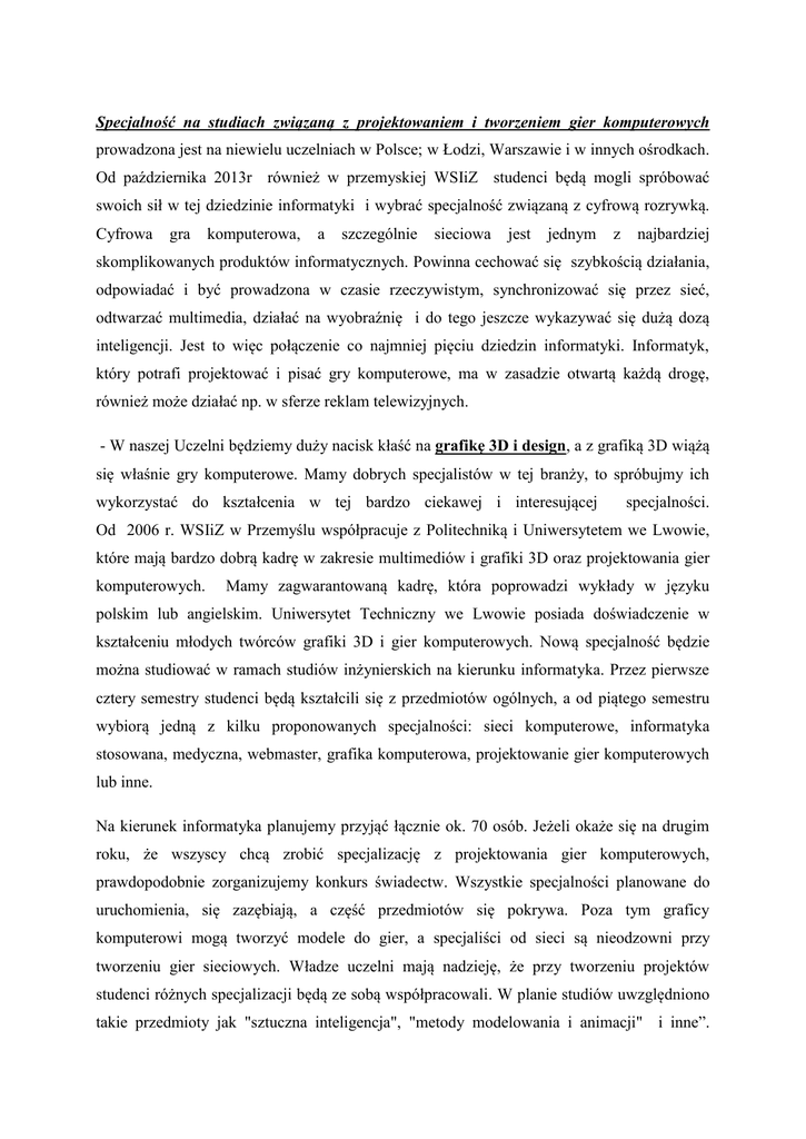 Specjalność na studiach związaną z projektowaniem i tworzeniem gier komputerowych prowadzona jest na niewielu uczelniach w Polsce; w Łodzi, Warszawie i w innych ośrodkach. Od października 2013r również w przemyskiej WSIiZ studenci będą mogli spróbować swoich sił w tej dziedzinie informatyki i wybrać specjalność związaną z cyfrową rozrywką. Cyfrowa gra komputerowa, a szczególnie sieciowa jest jednym z najbardziej skomplikowanych produktów informatycznych. Powinna cechować się szybkością działania, odpowiadać i być prowadzona w czasie rzeczywistym, synchronizować się przez sieć, odtwarzać multimedia, działać na wyobraźnię i do tego jeszcze wykazywać się dużą dozą inteligencji. Jest to więc połączenie co najmniej pięciu dziedzin informatyki. Informatyk, który potrafi projektować i pisać gry komputerowe, ma w zasadzie otwartą każdą drogę, również może działać np. w sferze reklam telewizyjnych. - W naszej Uczelni będziemy duży nacisk kłaść na grafikę 3D i design, a z grafiką 3D wiążą się właśnie gry komputerowe. Mamy dobrych specjalistów w tej branży, to spróbujmy ich wykorzystać do kształcenia w tej bardzo ciekawej i interesującej specjalności. Od 2006 r. WSIiZ w Przemyślu współpracuje z Politechniką i Uniwersytetem we Lwowie, które mają bardzo dobrą kadrę w zakresie multimediów i grafiki 3D oraz projektowania gier komputerowych. Mamy zagwarantowaną kadrę, która poprowadzi wykłady w języku polskim lub angielskim. Uniwersytet Techniczny we Lwowie posiada doświadczenie w kształceniu młodych twórców grafiki 3D i gier komputerowych. Nową specjalność będzie można studiować w ramach studiów inżynierskich na kierunku informatyka. Przez pierwsze cztery semestry studenci będą kształcili się z przedmiotów ogólnych, a od piątego semestru wybiorą jedną z kilku proponowanych specjalności: sieci komputerowe, informatyka stosowana, medyczna, webmaster, grafika komputerowa, projektowanie gier komputerowych lub inne. Na kierunek informatyka planujemy przyjąć łącznie ok. 70 osób. Jeżeli okaże się na drugim roku, że wszyscy chcą zrobić specjalizację z projektowania gier komputerowych, prawdopodobnie zorganizujemy konkurs świadectw. Wszystkie specjalności planowane do uruchomienia, się zazębiają, a część przedmiotów się pokrywa. Poza tym graficy komputerowi mogą tworzyć modele do gier, a specjaliści od sieci są nieodzowni przy tworzeniu gier sieciowych. Władze uczelni mają nadzieję, że przy tworzeniu projektów studenci różnych specjalizacji będą ze sobą współpracowali. W planie studiów uwzględniono takie przedmioty jak "sztuczna inteligencja", "metody modelowania i animacji" i inne”. Uczelnia planuje zakup 20 wydajnych tabletów, na których studenci będą mogli testować stworzone przez siebie gry i animacje. Gra komputerowa – program komputerowy służący do celów edukacyjnych lub rozrywkowych[1]. "Gra wideo" to zasadniczo ta sama forma rozrywki, lecz odnosi się nie tylko do gier uruchamianych na komputerach osobistych, ale również na tabletach [2] oraz tradycyjnych konsolach czy automatach zręcznościowych a obecnie na bardzo nowoczesnych smartfonach. Termin "gra komputerowa" zawiera w sobie również znaczenie gry, wyświetlającej jedynie tekst (przez co teoretycznie może być rozpoczęta nawet na dalekopisie lub używając innych metod, jak na przykład dźwięku czy wibracji, jako głównego środka przekazu. Zalety gier komputerowych i wideo http://pl.wikipedia.org/wiki/Gra_komputerowa Prawdopodobnie najlepiej widocznymi wartościami gier komputerowych i wideo są wartości artystyczne i rozrywkowe. Jako forma rozrywki multimedialnej nowe gry komputerowe i wideo używają wysoce unikalnego połączenia grafiki trójwymiarowej, efektów specjalnych, architektur, sztucznej inteligencji, efektów dźwiękowych, przedstawienia dramatyzmu wydarzeń, muzyki, fabuły i, co najważniejsze, interaktywności. Ta interaktywność pozwala graczom na eksplorację artystycznej wizji twórców i symulacji trójwymiarowego otoczenia (co nie jest dostępne dla żadnej innej formy rozrywki) pokazując działania gracza bez możliwości ich zredukowania. Tak więc każdy nowo zaczęty scenariusz będzie rozgrywany w pewien sposób inaczej, ponieważ to gracz kieruje akcją w grze. Nawet jeśli gra jest silnie uskryptowiona, wciąż daje ona większe poczucie swobody niż inne media. Inną cechą gier jest potrzebna szybkość reakcji. Chociaż wiele gier, włączając sporty czy nawet gry karciane, zależy od szybkiej reakcji gracza, gry komputerowe i wideo są w stanie stworzyć symulowany świat, w którym szybki czas reakcji będzie częścią świata. W dyskusji na ten temat projektant gier Warren Spector użył terminu "szybkie opowiadanie" do opisania jak w symulowanym środowisku fabuła może być tworzona przez to, co "dzieje się z graczem"[8].