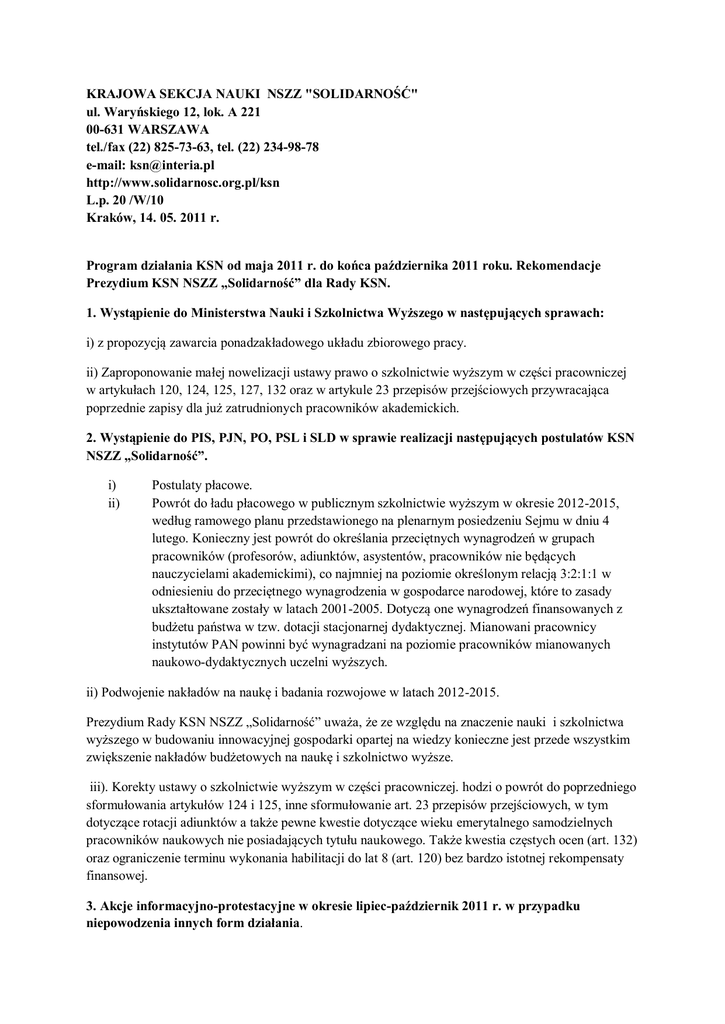 KRAJOWA SEKCJA NAUKI NSZZ "SOLIDARNOŚĆ" ul. Waryńskiego 12, lok. A 221 00-631 WARSZAWA tel./fax (22) 825-73-63, tel. (22) 234-98-78 e-mail: [email protected] http://www.solidarnosc.org.pl/ksn L.p. 20 /W/10 Kraków, 14. 05. 2011 r. Program działania KSN od maja 2011 r. do końca października 2011 roku. Rekomendacje Prezydium KSN NSZZ „Solidarność” dla Rady KSN. 1. Wystąpienie do Ministerstwa Nauki i Szkolnictwa Wyższego w następujących sprawach: i) z propozycją zawarcia ponadzakładowego układu zbiorowego pracy. ii) Zaproponowanie małej nowelizacji ustawy prawo o szkolnictwie wyższym w części pracowniczej w artykułach 120, 124, 125, 127, 132 oraz w artykule 23 przepisów przejściowych przywracająca poprzednie zapisy dla już zatrudnionych pracowników akademickich. 2. Wystąpienie do PIS, PJN, PO, PSL i SLD w sprawie realizacji następujących postulatów KSN NSZZ „Solidarność”. i) ii) Postulaty płacowe. Powrót do ładu płacowego w publicznym szkolnictwie wyższym w okresie 2012-2015, według ramowego planu przedstawionego na plenarnym posiedzeniu Sejmu w dniu 4 lutego. Konieczny jest powrót do określania przeciętnych wynagrodzeń w grupach pracowników (profesorów, adiunktów, asystentów, pracowników nie będących nauczycielami akademickimi), co najmniej na poziomie określonym relacją 3:2:1:1 w odniesieniu do przeciętnego wynagrodzenia w gospodarce narodowej, które to zasady ukształtowane zostały w latach 2001-2005. Dotyczą one wynagrodzeń finansowanych z budżetu państwa w tzw. dotacji stacjonarnej dydaktycznej. Mianowani pracownicy instytutów PAN powinni być wynagradzani na poziomie pracowników mianowanych naukowo-dydaktycznych uczelni wyższych. ii) Podwojenie nakładów na naukę i badania rozwojowe w latach 2012-2015. Prezydium Rady KSN NSZZ „Solidarność” uważa, że ze względu na znaczenie nauki i szkolnictwa wyższego w budowaniu innowacyjnej gospodarki opartej na wiedzy konieczne jest przede wszystkim zwiększenie nakładów budżetowych na naukę i szkolnictwo wyższe. iii). Korekty ustawy o szkolnictwie wyższym w części pracowniczej. hodzi o powrót do poprzedniego sformułowania artykułów 124 i 125, inne sformułowanie art. 23 przepisów przejściowych, w tym dotyczące rotacji adiunktów a także pewne kwestie dotyczące wieku emerytalnego samodzielnych pracowników naukowych nie posiadających tytułu naukowego. Także kwestia częstych ocen (art. 132) oraz ograniczenie terminu wykonania habilitacji do lat 8 (art. 120) bez bardzo istotnej rekompensaty finansowej. 3. Akcje informacyjno-protestacyjne w okresie lipiec-październik 2011 r. w przypadku niepowodzenia innych form działania. i) Akcje medialne: Zorganizowanie konsorcjów komisji zakładowych, które sfinansują ogłoszenia płatne w lokalnej prasie krytykujące złe rozwiązania ustawowe, niskie finansowanie nauki, niskie płace i nieuzasadnione „kominy płacowe”. KSN opłaci dwa-trzy ogłoszenia w Rzeczpospolitej. W ogłoszeniach trzeba wymienić – zdaniem Prezydium – nazwiska wszystkich posłów i senatorów głosujących za rozwiązaniami niekorzystnymi dla pracowników. Rozważyć możliwość ogłoszeń na billboardach. ii) Pikiety podczas inauguracji roku akademickiego na wszystkich uczelniach. iii) Prowadzenie referendum strajkowego, które zademonstruje gotowość środowiska do strajku. iv) Demonstracja 14 października wspólnie z „Solidarnością” nauczycielską. v) Konkurs na najbardziej wnikliwe artykuły o sytuacji nauki i szkolnictwa wyższego w latach 20882011. Pięć najlepszych prac o długości co najmniej 8000 znaków opublikowanych w prasie centralnej (Rzeczpospolita, Gazeta Wyborcza, Dziennik-Gazeta Prawna, Nasz Dziennik, Polityka, Mówimy Rze, Newsweek, Wprost) w okresie 1 lipca – 31 października 2011 r. zostanie nagrodzonych kwotą 1000 zł każda. Przewodniczący KSN NSZZ „Solidarność” Edward Malec Appendix. 3. Wzór listu do partii politycznych w sprawach poruszanych w punkcie 2 (zamiast XXXX należy podstawić PiS, PJN, PO, PSL i SLD). (Pragnę podkreślić, że jest to wstępna wersja listu, spełniająca – moim zdaniem – rekomendacje z punktu 2. List ten wystosuję w imieniu KSN do kierownictwa wszystkich partii politycznych, o ile Rada KSN zgodzi się z rekomendacją Prezydium.) Wystąpienie do XXXX w sprawie realizacji postulatów Krajowej Sekcji Nauki NSZZ „Solidarność”. 1. Konieczne jest zagwarantowanie środków finansowych w budżecie państwa na powrót do ładu płacowego w publicznym szkolnictwie wyższym. Niezbędny jest powrót do zasad ukształtowanych w latach 2001-2005 określania przeciętnych wynagrodzeń w grupach pracowników (profesorów, adiunktów, asystentów, pracowników nie będących nauczycielami akademickimi), co najmniej na poziomie określonym relacją 3:2:1:1 w odniesieniu do przeciętnego wynagrodzenia w gospodarce narodowej. Dotyczy to wynagrodzeń finansowanych z budżetu RP w tzw. dotacji podstawowej dydaktycznej Wzrost wynagrodzeń może być powiązany z eliminacją wieloetatowości w grupie profesorów i znaczącym jej ograniczeniem w pozostałych grupach pracowniczych. Wynagrodzenia mianowanych pracowników instytutów Polskiej Akademii Nauk powinny być na poziomie mianowanych pracowników naukowo-dydaktycznych uczelni wyższych. 2. Niezbędne jest podwojenie nakładów budżetowych na naukę, badania rozwojowe i szkolnictwo wyższe w latach 2012-2015. Prezydium Rady KSN NSZZ „Solidarność” uważa, że ze względu na znaczenie nauki i szkolnictwa wyższego w budowaniu innowacyjnej gospodarki opartej na wiedzy konieczne jest przede wszystkim zwiększenie nakładów budżetowych na naukę i szkolnictwo wyższe. Uważamy, że ze względu na znaczenie nauki i szkolnictwa wyższego w budowaniu społeczeństwa opartego na wiedzy środki budżetowe powinny wynosić co najmniej 0,8% PKB na naukę i 1,2% PKB na szkolnictwo wyższe. 3. Wysokość budżetowych 