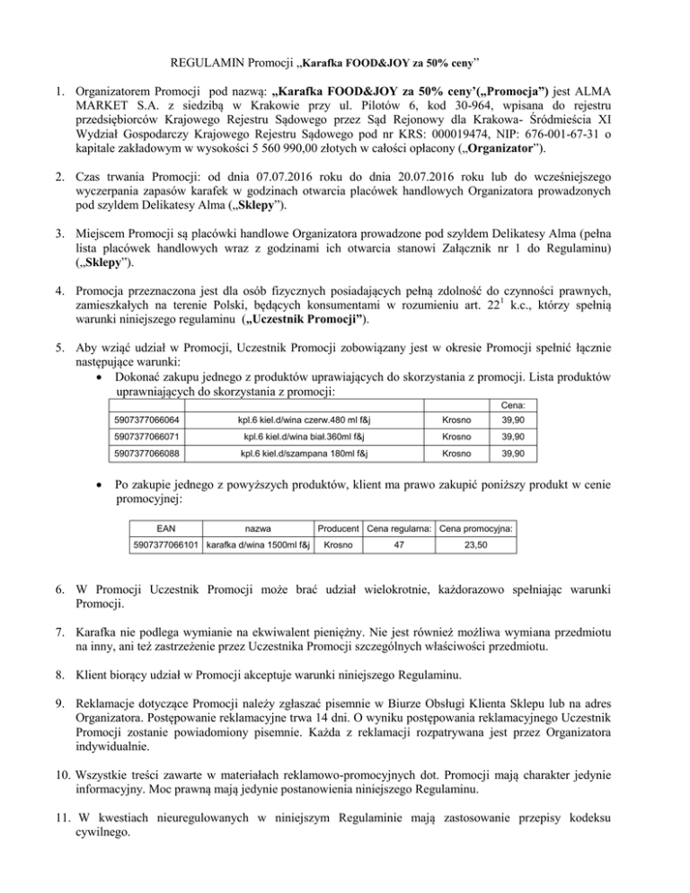 REGULAMIN Promocji „Karafka FOOD&JOY za 50% ceny” 1. Organizatorem Promocji pod nazwą: „Karafka FOOD&JOY za 50% ceny’(„Promocja”) jest ALMA MARKET S.A. z siedzibą w Krakowie przy ul. Pilotów 6, kod 30-964, wpisana do rejestru przedsiębiorców Krajowego Rejestru Sądowego przez Sąd Rejonowy dla Krakowa- Śródmieścia XI Wydział Gospodarczy Krajowego Rejestru Sądowego pod nr KRS: 000019474, NIP: 676-001-67-31 o kapitale zakładowym w wysokości 5 560 990,00 złotych w całości opłacony („Organizator”). 2. Czas trwania Promocji: od dnia 07.07.2016 roku do dnia 20.07.2016 roku lub do wcześniejszego wyczerpania zapasów karafek w godzinach otwarcia placówek handlowych Organizatora prowadzonych pod szyldem Delikatesy Alma („Sklepy”). 3. Miejscem Promocji są placówki handlowe Organizatora prowadzone pod szyldem Delikatesy Alma (pełna lista placówek handlowych wraz z godzinami ich otwarcia stanowi Załącznik nr 1 do Regulaminu) („Sklepy”). 4. Promocja przeznaczona jest dla osób fizycznych posiadających pełną zdolność do czynności prawnych, zamieszkałych na terenie Polski, będących konsumentami w rozumieniu art. 221 k.c., którzy spełnią warunki niniejszego regulaminu („Uczestnik Promocji”). 5. Aby wziąć udział w Promocji, Uczestnik Promocji zobowiązany jest w okresie Promocji spełnić łącznie następujące warunki: Dokonać zakupu jednego z produktów uprawiających do skorzystania z promocji. Lista produktów uprawniających do skorzystania z promocji: Cena: 5907377066064 kpl.6 kiel.d/wina czerw.480 ml f&j Krosno 39,90 5907377066071 kpl.6 kiel.d/wina biał.360ml f&j Krosno 39,90 5907377066088 kpl.6 kiel.d/szampana 180ml f&j Krosno 39,90 Po zakupie jednego z powyższych produktów, klient ma prawo zakupić poniższy produkt w cenie promocyjnej: EAN nazwa 5907377066101 karafka d/wina 1500ml f&j Producent Cena regularna: Cena promocyjna: Krosno 47 23,50 6. W Promocji Uczestnik Promocji może brać udział wielokrotnie, każdorazowo spełniając warunki Promocji. 7. Karafka nie podlega wymianie na ekwiwalent pieniężny. Nie jest również możliwa wymiana przedmiotu na inny, ani też zastrzeżenie przez Uczestnika Promocji szczególnych właściwości przedmiotu. 8. Klient biorący udział w Promocji akceptuje warunki niniejszego Regulaminu. 9. Reklamacje dotyczące Promocji należy zgłaszać pisemnie w Biurze Obsługi Klienta Sklepu lub na adres Organizatora. Postępowanie reklamacyjne trwa 14 dni. O wyniku postępowania reklamacyjnego Uczestnik Promocji zostanie powiadomiony pisemnie. Każda z reklamacji rozpatrywana jest przez Organizatora indywidualnie. 10. Wszystkie treści zawarte w materiałach reklamowo-promocyjnych dot. Promocji mają charakter jedynie informacyjny. Moc prawną mają jedynie postanowienia niniejszego Regulaminu. 11. W kwestiach nieuregulowanych w niniejszym Regulaminie mają zastosowanie przepisy kodeksu cywilnego. 12. Treść Regulaminu dostępna jest w Biurze Obsługi Klienta każdego Sklepu oraz na stronie internetowej Organizatora www.almamarket.pl . Załącznik nr 1 Lokalizacje Delikatesów Alma Miasto Adres Bydgoszcz Delikatesy Alma, Focus Mall, ul. Jagiellońska 39 - 47, 85 - 097 Bydgoszcz Bochnia Delikatesy Alma Smart, Plac św. Kingi 1, 32-700 Bochnia Częstochowa Delikatesy Alma, Galeria Jurajska, Aleja Wojska Polskiego 207, 42-202 Częstochowa Gdynia Delikatesy Alma, ul. Redłowska 41, 81 - 450 Gdynia Gdynia Delikatesy Alma, Galeria Szperk, ul. Płk. Dąbka 338 , 81-198 Kosakowo k. Gdyni Gdynia Delikatesy Alma, Dom Mody Klif, Al. Zwycięstwa 256, 81-525 Gdynia Gdynia Delikatesy Alma, ul. Staniszewskiego 1, 81-603 Gdynia Katowice Delikatesy Alma, ul. Kościuszki 90, 40 - 047 Katowice Kraków Delikatesy Alma, ul. Pilotów 6, 30-964 Kraków Kraków Delikatesy Alma, Galeria Kazimierz, ul. Podgórska 34, 31-356 Kraków Kraków Delikatesy Alma, ul. Kościuszki 71, 30 - 114 Kraków Kraków Delikatesy Alma, Salwator City, ul. Stańczyka 14, 30-126 Kraków Kraków Delikatesy Alma, Futura Park, ul. Rożańskiego 32, 32-085 Kraków Modlniczka Kraków Delikatesy Alma, C.H. Dekada, ul. Stojałowskiego 6, 30-611 Kraków Kraków Delikatesy Alma, ul. F. Nullo 42, 31-543 Kraków Lubin Delikatesy Alma , Cuprum Arena, ul. Sikorskiego 20, 59-300 Lubin Lublin Łódź Delikatesy Alma, Galeria Olimp, al. Spółdzielczości Pracy 32, 20-147 Lublin Delikatesy Alma, ul. Kilińskiego 122-128, 90-316 Łódź Nowy Targ Delikatesy Alma, ul. Szaflarska 174, 34-400 Nowy Targ Olsztyn Delikatesy Alma, Centrum Handlowo- Usługowe "Alfa Centrum" Al. Piłsudskiego 16, 10-576 Olsztyn Opole Delikatesy Alma, Solaris Center, pl. M. Kopernika 16, 45-040 Opole Piaseczno Delikatesy Alma, ul. Wojska Polskiego 17, 05-500 Piaseczno Poznań Delikatesy Alma, Stary Browar, ul. Półwiejska 32, 61-888 Poznań Pruszków Delikatesy Alma, ul. Sprawiedliwości 4, 05-800 Pruszków Rybnik Delikatesy Alma , Focus Mall, ul. Chrobrego 1, 44-200 Rybnik Rzeszów Delikatesy Alma, Capital Park, al. T. Rejtana 23, 35-326 Rzeszów Sopot Delikatesy Alma, ul. Sikorskiego 8/10, 81-827 Sopot Szczecin Delikatesy Alma, Galeria Kaskada, Al. Niepodległości 36, 70-404 Szczecin Tarnów Delikatesy Alma, ul. Dąbrowskiego 10, 33-100 Tarnów, Warszawa Delikatesy Alma, Promenada,ul. Ostrobramska 75 C, 04-175 Warszawa Warszawa Delikatesy Alma, ul. Zwycięzców 40,03-937 Warszawa, Warszawa Delikatesy Alma, ul. Wrocławska 8, 01-493 Warszawa Warszawa Delikatesy Alma, Triton Park, ul. Grójecka 194, 02-301 Warszawa Warszawa Delikatesy Alma, Dom Mody Klif, ul. Okopowa 58/72, 01-042 Warszawa Warszawa Delikatesy Alma, Europlex, ul. Puławska 17, 02-515 Warszawa Warszawa – Skorosze Delikatesy Alma, C.H. Skorosze, ul. Gen. F. Sławoja- Składkowskiego 4, Warszawa 02-497 Warszawa Konstancin Delikatesy Alma, Stara Papiernia, al. Wojska Polskiego 3, lok. 46, 05-520 Konstancin Jeziorna Warszawa Wilanów Delikatesy Alma, Office Park, al. Rzeczypospolitej 1, 02-972 Warszawa Wrocław Del