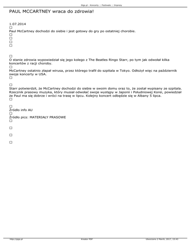 Gigs.pl - Koncerty :: Festiwale :: Imprezy PAUL MCCARTNEY wraca do zdrowia! 1.07.2014 Paul McCartney dochodzi do siebie i jest gotowy do gry po ostatniej chorobie. O stanie zdrowia wypowiedział się jego kolego z The Beatles Ringo Starr, po tym jak odwołał kilka koncertów z racji choroby. McCartney ostatnio złapał wirusa, przez którego trafił do szpitala w Tokyo. Odłożył więc na październik swoje koncerty w USA. Starr potwierdził, że McCartney dochodzi do siebie w swoim domu oraz to, że został wypisany ze szpitala. Rzecznik prasowy muzyka, który musiał odwołać swoje występy w Japonii i Południowej Korei, powiedział że Paul ma się dobrze i wróci na trasę w lipcu. Kolejny koncert odbędzie się w Albany 5 lipca. Źródło info AU Źródło pics: MATERIAŁY PRASOWE http://gigs.pl Kreator PDF Utworzono 2 March, 2017, 15:43