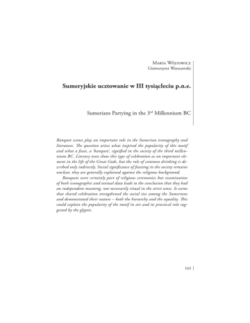Marta Wójtowicz Uniwersytet Warszawski Sumeryjskie ucztowanie w III tysiącleciu p.n.e. Sumerians Partying in the 3rd Millennium BC Banquet scenes play an important role in the Sumerian iconography and literature. The question arises what inspired the popularity of this motif and what a feast, a ‘banquet’, signified in the society of the third millennium BC. Literary texts show this type of celebration as an important element in the life of the Great Gods, but the role of common drinking is described only indirectly. Social significance of feasting in the society remains unclear, they are generally explained against the religious background. Banquets were certainly part of religious ceremonies but examination of both iconographic and textual data leads to the conclusion that they had an independent meaning, not necessarily ritual in the strict sense. It seems that shared celebration strengthened the social ties among the Sumerians and demonstrated their nature – both the hierarchy and the equality. This could explain the popularity of the motif in art and its practical role suggested by the glyptic. 163 Święto – Zabawa – Uroczystość w świecie starożytnym Lew i towarzysze Odcisk pieczęci cylindrycznej z przedstawiający groteskowe przyjęcie pochodzi z Ur, z II połowy III tys. p.n.e. (fig. 1)1. Ucztują lew i zwierzęta stanowiące w naturze jego ofiary. Lew jest zdecydowanie najważniejszy, nie ma równego sobie towarzysza, muzycy i inne zwierzęta mu służą. Łaskawy pan, stanowi także zagrożenie dla biesiadników – scenie uczty towarzyszy druga, w której lew koziołka zabija2. Jest to szczególny przykład tzw. sceny bankietowej, jednego z najpopularniejszych motywów w ikonografii III tys. Doczekał się on tutaj swojej parodii. Wspólne ucztowanie stanowi ważny punkt odniesienia w literaturze i ikonografii sumeryjskiej. Bardzo często pojawia się na pieczęciach cylindrycznych czy w utworach literackich (np. zwroty akcji następują podczas uczty). Cecha ta zanika z końcem III tysiąclecia i ani w gliptyce, ani w tekstach akadyjskich uczta nie ma takiego znaczenia. Nie ulega wątpliwości, że piwo pozostaje podstawowym napojem, ale sytuacje społeczne z nim związane najwyraźniej straciły zainteresowanie autorów źródeł. Pojawia się pytanie o okoliczności, w jakich alkohol pito oraz jakie znaczenie społeczne te okazje miały w III tysiącleciu. Alkohol był obecny w czasie świąt i przyjęć, stan upojenia został szybko rozpoznany jako użyteczny dla obrzędów religijnych. Picie było z pewnością aktywnością towarzyską: samotni amatorzy trunków pojawiają się w ikonografii rzadko. Tematem tekstu będzie więc picie wspólne, społeczne w źródłach z III tys. p.n.e., określane poniżej jako bankiet, przyjęcie lub uczta3 – najbardziej charakterystyczne przykłady źródeł literackich i ikonograficznych oraz interpretacje. Źródła literackie 1 Fig. 1; P. Amiet, La glyptique mesopotamienne archaique, Paris 1980, nr 1308 (s. 457). Odciski pieczęci zostały znalezione na poziomie nieco niższym niż groby królewskie (por. L. Legrain,Ur Excavations III, pl. 20 i 51, nr 384). 2 Więcej na temat przedstawień zwierząt zachowujących się jak ludzie w sztuce mezopotamskiej: M. Rutten, Les Animaux aattitudes humanes dans l’art de l’ancienne Mesopotamie, „Revue des Etudes Semitiques” 1938, s. 97–119;. P. Amiet, La glyptique mesopotamienne archaique, Paris 1980, s. 158–159. 3 Słowo „bankiet” kojarzy się z okazją wystawną i uroczystą. Jednak określenie „scena bankietowa” stosowane jest w literaturze w odniesieniu do wszystkich przedstawień pijących – również wtedy, gdy trudno powiedzieć cokolwiek o ich statusie społecznym czy okazji – i w takim znaczeniu go używane jest w tekście. 164 Sumeryjskie ucztowanie w III tysiącleciu p.n.e. Pierwszym z tekstów, do jakiego warto się odnieść, jest tzw. pieśń pijacka, wydana przez Miguela Civila w 1964 r4– the only Sumerian drinking song so far discovered5. Tym ciekawsza, że nie jest adresowana do bogini i trudny do określenia jest kontekst kultowy, w jakim mogłaby się pojawić. Pieśń opisuje dokładnie łatwo rozpoznawalne skutki używania alkoholu – swobodny nastrój i lekkość serca, chwali urodę naczyń napełnionych piwem (l. 57: dug-sig5 dag-dug-e sa-gi4-a). Radości pijącego są tematem samodzielnym, trudnym do podporządkowania określonemu rytuałowi (jak np. opis uczty po obrzędzie świętych zaślubin w Kantacie na cześć Inanny6). W tekście wystepują trzy bóstwa, nie zajmują jednak głównego miejsca. Przywołanie osobistego boga (l. 58: ša3 di ir-za hu-mu-ra-ab-hun-e – ‘may the heart of your god be well disposed over you’) jest raczej literackim środkiem opisu szczęścia człowieka. Bogini Ninkasi (l. 66) zajmuje pozycję nieporównywalną do tej w hymnie na jej cześć – jej wezwanie poza kultem jest naturalne skoro bogini jest samym piwem, mocą zawartą w alkoholu, a picie powoduje doświadczenie jej mocy. W tym sensie ucztowanie jest święte, niekoniecznie jednak bardziej niż inne codzienne czynności. W religii mezopotamskiej bogowie są częścią rzeczywistości, istnieją, kiedy ich moc objawia się w świecie7. Bankiet jest zawsze obrzędem ku czci Ninkasi w tym sensie, w jakim objawia jej siłę, niekoniecznie jednak ma znaczeni kultowe8. Druga grupa tekstów istotna przy opisie uczty sumeryjskiej i jej znaczeń, to cykl mitów związanych z bogiem Enki (głównie: Podróż Enki do Nibru, Enki i Ninmah, Inanna i Enki). We wszystkich tych tekstach alkohol i uczta są ważnymi elementami akcji. Pierwszy tekst szczegółowo opisuje przygotowania i przebieg bankietu, dwa kolejne opowiadają historie, w których decydującym o rozwoju akcji elementem jest upojenie alkoholowe. 4 M. Civil, A Hymn to the Beer Goddes and a Drinking Song, [w:] Studies Presented to A. Leo Oppenheim , Chicago 1964, s. 67–89, l. 