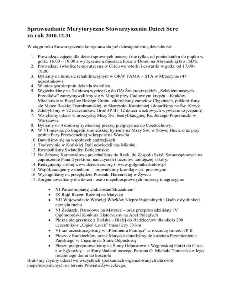 Sprawozdanie Merytoryczne Stowarzyszenia Dzieci Serc za rok 2010-12-31 W ciągu roku Stowarzyszenie kontynuował o jużdziesięcioletniądział alnoś ć : 1. Prowadząc zaję cia dla dzieci sprawnych inaczej i nie tylko, od poniedział ku do pią tku w godz. 16.00 – 18.00 z wył ą czeniem miesiąca lipca w Domu na Abramskiej tzw. SDS. 2. Prowadząc ś wietlicęterapeutycznąw Ciś cu we wtorki i czwartki w godz. od 17;0019;00 3. Byliś my na turnusie rehabilitacyjnym w ORW FAMA – STA w Mrzeżynie (47 uczestników) 4. W miesią cu sierpniu dział ał aś wietlica 5. Wyjechaliś my na 2 dniowąwycieczkędo Gór Świętokrzyskich ,,Szlakiem naszych Przodków” zatrzymywaliś my sięw Mogile przy Cudownym krzyż u – Kraków, Miechowie w Bazylice Boż ego Grobu, zdobyliś my zamek w Chęcinach, pokł oniliś my sięMatce Boskiej Ostrobramskiej, w Skarż ysku Kamiennej i dotarliś my na Św. Krzyż . 6. Zdobyliś my w 72 uczestników GrońJP II ( 12 dzieci wózkowych wywieziono jeepami) 7. Wzięliś my udziałw uroczystej Mszy Św. beatyfikacyjnej Ks. Jerzego Popieł uszki w Warszawie 8. Byliś my na 4 dniowej ż ywieckiej pieszej pielgrzymce do Czę stochowy. 9. W VI miesiąc po tragedii smoleńskiej byliś my na Mszy Św. w Nowej Hucie oraz przy grobie Pary Prezydenckiej w krypcie na Wawelu 10. Bawiliś my sięna wspólnych andrzejkach 11. Tradycyjnie w Końskiej Doli odwiedziłnas Mikoł aj. 12. Roznosiliś my Świateł ko Betlejemskie 13. Na ZabawęKarnawał owąpojechaliś my do Rzyk, do Zespoł u SzkółSamorzą dowych na zaproszenie Pana Dyrektora, nauczycieli i uczniów tamtejszej szkoł y. 14. Redagujemy stronęwww.dzieciserc.org i www.golgotabeskidow.pl 15. Współ pracujemy z mediami – prowadzimy kronikęz art. prasowymi 16. Wystą piliś my na przeglądzie Piosenki Harcerskiej w Żywcu 17. Zorganizowaliś my dla dzieci i osób niepeł nosprawnych imprezy integracyjne: XI Paraolimpiadę,,Jak zostaćStraż akiem” IX Rajd Razem Raźniej na Matyskę VII Wojewódzkie Wyś cigi Wózków Nieprofesjonalnych i Osób z dysfunkcją narzą du ruchu VI Zaduszki Narodowe na Matysce – oraz przeprowadziliś my IV Ogólnopolski Konkurs Historyczny na Apel Poległ ych Piesząpielgrzymkęz Bielska – Biał ej do Radziechów dla okoł o 300 uczestników ,,OgieńLolek” trasa liczy 33 km VI raz uczestniczyliś my w ,,Pł omieniu Pamię ci” w rocznicęś mierci JP II Pieszo z Radziechów, przez Matyske dotarliś my do koś cioł a Przemienienia Pańskiego w Cię cinie na SumęOdpustową Pieszo pielgrzymowaliś my na Sumy Odpustowe z Wę gierskiej Górki do Ciś ca, a w Łę kawicy – szliś my ś ladami naszego Patrona O. Michał a Tomaszka z Jego rodzinnego domu do koś cioł a Braliś my czynny udziałwe wszystkich spotkaniach organizowanych dla osób niepeł nosprawnych na terenie Powiatu Żywieckiego. Podczas Pielgrzymowania zawsze pamiętamy w modlitwie o naszych Darczyńcach, by Pan za ich dobro wspierałswymi ł askami, a Matka Najś wię tsza zawsze sł uż ył a opieką . Wszystkie dane można sprawdzićna www.dzieciserc.org i www.golgotabeskidow.pl Stowarzyszenie Dzieci Serc Dzię kuje i prosi o 1% KRS 0000121276 34-281 Radziechowy, ul. Abramska 2