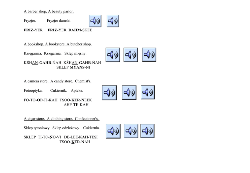 A barber shop. A beauty parlor. Fryzjer. Fryzjer damski. FRIZ-YER FRIZ-YER DAHM-SKEE A bookshop. A bookstore. A butcher shop. Ksiugarnia. Ksiugarnia. Sklep miusny. K²HAN-GAHR-žAH K²HAN-GAHR-žAH SKLEP MYANS-NI A camera store . A candy store. Chemist's. Fotooptyka. Cukiernik. Apteka. FO-TO-OP-TI-KAH TSOO-KER-žEEK AHP-TE-KAH A cigar store. A clothing store. Confectioner's. Sklep tytoniowy. Sklep odzieÕowy. Cukiernia. SKLEP TI-TO-ž žO-VI DE-LEE-KAH-TESI TSOO-KER-žAH