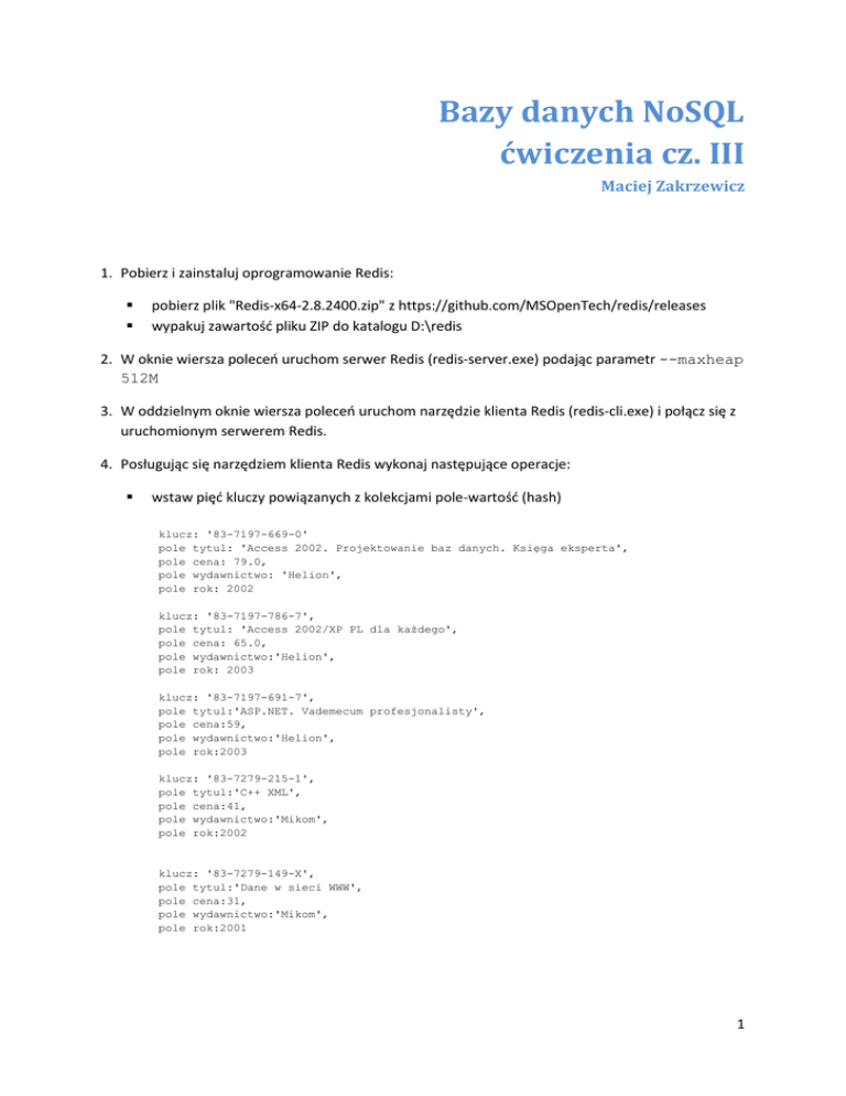 Bazy danych NoSQL ćwiczenia cz. III Maciej Zakrzewicz 1. Pobierz i zainstaluj oprogramowanie Redis: pobierz plik "Redis-x64-2.8.2400.zip" z https://github.com/MSOpenTech/redis/releases wypakuj zawartość pliku ZIP do katalogu D:\redis 2. W oknie wiersza poleceń uruchom serwer Redis (redis-server.exe) podając parametr --maxheap 512M 3. W oddzielnym oknie wiersza poleceń uruchom narzędzie klienta Redis (redis-cli.exe) i połącz się z uruchomionym serwerem Redis. 4. Posługując się narzędziem klienta Redis wykonaj następujące operacje: wstaw pięć kluczy powiązanych z kolekcjami pole-wartość (hash) klucz: '83-7197-669-0' pole tytul: 'Access 2002. Projektowanie baz danych. Księga eksperta', pole cena: 79.0, pole wydawnictwo: 'Helion', pole rok: 2002 klucz: '83-7197-786-7', pole tytul: 'Access 2002/XP PL dla każdego', pole cena: 65.0, pole wydawnictwo:'Helion', pole rok: 2003 klucz: '83-7197-691-7', pole tytul:'ASP.NET. Vademecum profesjonalisty', pole cena:59, pole wydawnictwo:'Helion', pole rok:2003 klucz: '83-7279-215-1', pole tytul:'C++ XML', pole cena:41, pole wydawnictwo:'Mikom', pole rok:2002 klucz: '83-7279-149-X', pole tytul:'Dane w sieci WWW', pole cena:31, pole wydawnictwo:'Mikom', pole rok:2001 1 wyświetl wszystkie pary pole-wartość dla klucza '83-7197-691-7' 1) 2) 3) 4) 5) 6) 7) 8) "tytul" "ASP.NET. Vademecum profesjonalisty" "cena" "59" "wydawnictwo" "Helion" "rok" "2003" wyświetl cenę książki o kluczu '83-7197-691-7' 1) "59" wyświetl wszystkie klucze rozpoczynające się od cyfr "83" 1) 2) 3) 4) 5) "83-7197-691-7" "83-7197-669-0" "83-7197-786-7" "83-7279-215-1" "83-7279-149-X" kluczowi '83-7197-691-7' ustaw automatyczne wygasanie po 10 sekundach (komenda PEXPIRE); sprawdź, czy po tym czasie klucz zostanie usunięty z bazy danych usuń klucz '83-7279-215-1' wyświetl wszystkie klucze 1) "83-7197-669-0" 2) "83-7197-786-7" 3) "83-7279-149-X" wprowadź do bazy danych zestaw kluczy reprezentujących symbole województw na rejestracjach samochodowych, powiązane z pełnymi nazwami województw (string) B C D E F G K L N O P R S T W Z 'podlaskie' 'kujawsko-pomorskie' 'dolnośląskie' 'łódzkie' 'lubuskie' 'pomorskie' 'małopolskie' 'lubelskie' 'warmińsko-mazurskie' 'opolskie' 'wielkopolskie' 'podkarpackie' 'śląskie' 'świętokrzyskie' 'mazowieckie' 'zachodniopomorskie' wyświetl wszystkie jednoliterowe klucze zgromadzone w bazie danych (wskazówka: skorzystaj ze wzorca "?") 1) "E" 2 2) 3) 4) 5) 6) 7) 8) 9) 10) 11) 12) 13) 14) 15) 16) "S" "F" "L" "G" "K" "T" "C" "R" "W" "B" "N" "P" "Z" "D" "O" wyświetl pełną nazwę województwa odpowiadającą kodowi "P" "wielkopolskie" wykonaj kopię bezpieczeństwa danych na dysku zatrzymaj serwer, ponownie go uruchom, a następnie sprawdź, czy wprowadzone wcześniej dane nie zostały utracone 3