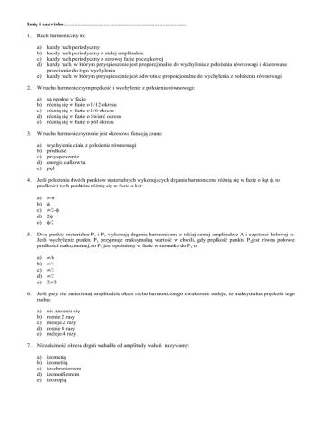 Imię i nazwisko:........................................................................................ 1. Ruch harmoniczny to: a) b) c) d) e) 2. W ruchu harmonicznym prędkość i wychylenie z położenia równowagi: a) b) c) d) e) 3. π/6 π/4 π/3 π/2 2π/3 Jeśli przy nie zmienionej amplitudzie okres ruchu harmonicznego dwukrotnie maleje, to maksymalna prędkość tego ruchu: a) b) c) d) e) 7. π-φ φ π/2-φ 2φ φ/2 Dwa punkty materialne P1 i P2 wykonują drgania harmoniczne o takiej samej amplitudzie A i częstości kołowej ω. Jeśli wychylenie punktu P1 przyjmuje maksymalną wartość w chwili, gdy prędkość punktu P2jest równa połowie prędkości maksymalnej, to P2 jest opóźniony w fazie w stosunku do P1 o: a) b) c) d) e) 6. wychylenie ciała z położenia równowagi prędkość przyspieszenie energia całkowita pęd Jeśli położenia dwóch punktów materialnych wykonujących drgania harmoniczne różnią się w fazie o kąt φ, to prędkości tych punktów różnią się w fazie o kąt: a) b) c) d) e) 5. są zgodne w fazie różnią się w fazie o 1/12 okresu różnią się w fazie o 1/6 okresu różnią się w fazie o ćwierć okresu różnią się w fazie o pół okresu W ruchu harmonicznym nie jest okresową funkcją czasu: a) b) c) d) e) 4. każdy ruch periodyczny każdy ruch periodyczny o stałej amplitudzie każdy ruch periodyczny o zerowej fazie początkowej każdy ruch, w którym przyspieszenie jest proporcjonalne do wychylenia z położenia równowagi i skierowane przeciwnie do tego wychylenia każdy ruch, w którym przyspieszenie jest odwrotnie proporcjonalne do wychylenia z położenia równowagi nie zmienia się rośnie 2 razy maleje 2 razy rośnie 4 razy maleje 4 razy Niezależność okresu drgań wahadła od amplitudy wahań nazywamy: a) b) c) d) e) izomerią izometrią izochronizmem izomorfizmem izotropią 8. Jeśli, dla małych wychyleń z położenia równowagi, amplitudę ruchu wahadła zwiększymy dwukrotnie, to częstotliwość jego ruchu: a) b) c) d) e) 9. wzrośnie 4 razy wzrośnie 2 razy nie zmieni się zmaleje 2 razy zmaleje 4 razy Dwukrotne zwiększenie okresu drgań wahadła można osiągnąć przez: a) b) c) d) e) dwukrotne zwiększenie jego masy czterokrotne zwiększenie jego masy dwukrotne zmniejszenie jego masy dwukrotne zwiększenie jego masy czterokrotne zwiększenie jego długości 10. Aby wahadło (1), odchylone od pionu o kąt φ osiągnęło linię pionu po tym samym czasie, co wahadło (2), odchylone od pionu o kąt 2φ, długości wahadeł muszą spełniać warunek: a) b) c) d) e) L1 = 2L2 L1 = L2 L1 = ½ L2 Żaden z powyższych Czas po upływie którego wahadła osiągną linię pionu, nie zależy od długości wahadeł 11. Siła grawitacji ma na Księżycu wartość 6 razy mniejszą niż na Ziemi. Zegar wahadłowy chodzi na Księżycu: a) b) c) d) e) 6 razy szybciej niż na Ziemi około 2,5 razy szybciej niż na Ziemi tak samo jak na Ziemi około 2,5 razy wolniej niż na Ziemi 6 razy wolniej niż na Ziemi 12. W stanie nieważkości ruch wahadła: a) b) c) d) e) zmienia amplitudę i odbywa się szybciej niż na Ziemi nie zmienia amplitudy i odbywa się szybciej niż na Ziemi zmienia amplitudę i odbywa się wolniej niż na Ziemi przebiega tak samo jak na Ziemi żadna z powyższych odpowiedzi nie jest poprawna 13. Jeśli trzykrotnie zwiększymy długość wahadła, to jego energia: a) b) c) d) e) zwiększy się 9 razy zwiększy się 3 razy zmniejszy się 3 razy zmniejszy się 9 razy energia wahadła nie zależy od długości 14. Jeśli dwukrotnie zwiększymy amplitudę drgań punktu materialnego zawieszonego na sprężynie, to maksymalna wartość jego przyspieszenia: a) b) c) d) e) zwiększy się 4 razy zwiększy się 2 razy nie zmieni się zmniejszy się 2 razy zmniejszy się 4 razy 15. Nie jest falą: a) krótkotrwały impuls świetlny b) c) d) e) krótkotrwały impuls dźwiękowy pojedyncze odkształcenie przesuwające się wzdłuż gumowego węża podmuch wiatru impuls powstający na powierzchni wody po wrzuceniu do niej kamienia 16. Dwie sąsiednie powierzchnie falowe o zgodnych fazach są od siebie odległe o: a) b) c) d) e) dwie długości fali półtorej długości fali długość fali pół długości fali ćwierć długości fali 17. Fale rozchodzące się po powierzchni cieczy: a) b) c) d) e) są falami podłużnymi są falami poprzecznymi są falami podłużnymi lub poprzecznymi w zależności od sposobu wzbudzenia fali są falami podłużnymi lub poprzecznymi w zależności od gęstości cieczy nie są falami podłużnymi ani poprzecznymi 18. W powietrzu długość fali dźwiękowej o częstotliwości 340 Hz wynosi: a) b) c) d) e) 0,1m 0,5m 1m 5m 10m 19. Fala o długości 40cm i okresie 0,25s rozchodzi się z prędkością: a) b) c) d) e) 1,6m/s 1m/s 0,625m/s 0,16m/s 0,1m/s 20. W czasie równym połowie odwrotności częstotliwości fali, faza fali zmienia się o: a) b) c) d) e) π/6 π/4 π/3 π/2 π 21. Najkrótszy czas, w którym faza fali zmieni się o π/2, wynosi: a) b) c) d) e) T/12 T/6 T/4 T/3 T/2 22. Spośród trzech fal danych, odpowiednio równaniami: y 3 = 2 sin[2π ( x − 4t )]: a) b) c) d) e) y1 = 5 sin[2π (3x − 2t )], y 2 = 3 sin[2π (2 x − 3t )] , długość fali (1) jest największa wszystkie trzy fale maja jednakowe natężenie długość fali (3) jest dwa razy mniejsza od długości fali (2) częstotliwość fali (3) jest dwa razy większa od częstotliwości fali (1) fala (2) ma największą prędkość 23. Natężenie fali płaskiej emitowanej przez źródło o stałej mocy: a) jest stałe b) zmienia się sinusoidalnie wraz z odległością od źródła c) zmienia się z odległością r od źródła jak 1/r d) zmienia się z odległością r od źródła jak 1/r2 e) zmienia się z odległością r od źródła jak 1/r3 24. Natężenie fali kulistej w punkcie odległym od źródła fali o 5m jest od natężenia tej samej fali w punkcie odległym od źródła o 1m: a) b) c) d) e) 4 razy 
