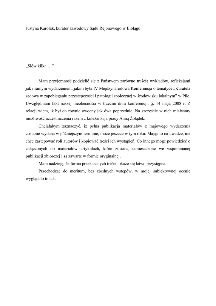 Justyna Karolak, kurator zawodowy Sądu Rejonowego w Elblągu „Słów kilka …” Mam przyjemność podzielić się z Państwem zarówno treścią wykładów, refleksjami jak i samym wydarzeniem, jakim była IV Międzynarodowa Konferencja o tematyce „Kuratela sądowa w zapobieganiu przestępczości i patologii społecznej w środowisku lokalnym” w Pile. Uwzględniam fakt naszej nieobecności w trzecim dniu konferencji, tj. 14 maja 2008 r. Z relacji wiem, iż był on równie owocny jak dwa poprzednie. Na szczęście w nich miałyśmy możliwość uczestniczenia razem z koleżanką z pracy Anną Żołądek. Chciałabym zaznaczyć, iż pełna publikacja materiałów z majowego wydarzenia zostanie wydana w późniejszym terminie, może jeszcze w tym roku. Mając to na uwadze, nie chcę zastępować roli autorów i kopiować treści ich wystąpień. Co innego mogę powiedzieć o załączonych do materiałów artykułach, które zostaną zamieszczone we wspomnianej publikacji zbiorczej i są zawarte w formie oryginalnej. Mam nadzieję, że forma przekazanych treści, okaże się łatwo przystępna. Przechodząc do meritum, bez zbędnych wstępów, w mojej subiektywnej ocenie wyglądało to tak. Pewnie z uwagi na rozległą wiedzę, znajomość tematu i bogate w nim doświadczenie pierwszy wystąpił Prof. dr hab. Wiesław Ambrozik – „Społeczność lokalna jako płaszczyzna oddziaływań profilaktyczno – resocjalizacyjnych” Po tym i kolejnych referatach mieliśmy okazję się przekonać, iż konferencja została przygotowana na wysokim poziomie. Oprócz intelektualnych wywodów nie brakowało żartów, dyskusji. Profesor W. Ambrozik poruszył problematykę: 1) znaczenia kuratorów sądowych w systemie probacji. Wskazywał na fakt, iż powierza się nam tylko pewne ograniczone funkcje prawno – nadzorcze. Należałoby zmienić stan, w którym kuratorzy pełnia rolę wykonawców sądu. Powinni brać większy udział w procesie przygotowawczym, diagnostycznym oraz orzecznictwie. Myślę, iż nie jest to jedynie opinia mówcy, ale nawet dobiegająca z naszego środowiska. Zresztą, jak będziemy mieli okazję się przekonać dalej, ta idea ma już swoje zastosowanie w innym kraju. 2) wymagań od kuratorów wysokich kompetencji zawodowych bez analizy ograniczeń ich możliwości. Każdy z kuratorów styka się z postawą roszczeniową lub bezradności wśród swoich dozorowanych oraz nadzorowanych. Jest to niewygodne pytanie, co kurator może zaoferować takim osobom np. w kwestii zdobycia pracy zarobkowej itp. Rzeczywistość nam udowadnia, że częściej niewiele niż coś, a oczekiwania w stosunku do kuratora są wysokie. 3) roli metod resocjalizacyjnych w pracy kuratora sądowego, czyli temat bardzo nam bliski, codzienny. Istotne jest zatem zróżnicowanie dobieranych w trakcie pracy metod. Nie każdy skazany może być poprowadzony metodą case work, czyli indywidualnego przypadku. Różnorodne metody działają w teorii, a jak miałoby to działać w praktyce. Profesor uważa, iż zasadnym byłoby wykorzystanie metody pracy grupowej poprzez organizowanie zajęć grupowych wśród skazanych. Miałyby one na celu zmianę ich postaw, nauczenie nowych umiejętności w tym społecznych. W moim przekonaniu miałoby to przyjąć formę zajęć psychoedukacyjnych. 4) kuratora jako organizatora w środowisku lokalnym. Kurator miałby możliwość oddziaływania na inne instytucje poprzez zlecanie im konkretnych działań, zwłaszcza w stosunku do osób nieletnich. Uważam, iż takie podzielenie się pracą może wpływać na polepszenie jakości pracy nas samych i nie obciążało by jednej osoby, chociażby psychicznie. Zasadne jest więc, by w pracę ze skazanym czy osobą nieletnią zaangażowanych było kilka osób, placówek. W Polsce podejmowane są próby współpracy różnych instytucji oraz kuratorów np. „Akcja małolat” (Września). Jednakże wydaje się, iż zapotrzebowanie na takie akcje jest większe. 5) konieczności specjalizacji kurateli. Mogłoby to przejawiać się w podziale kuratorów pracujących ze skazanymi za poszczególne przestępstwa, co wiązałoby się z kategoryzowaniem naszej pracy np. ze sprawcami przemocy, uzależnionymi od alkoholu. Nie każdy z nas ma tą samą umiejętność dotarcia do wszystkich osób, ale z częścią mu się lepiej współpracuje. Cóż, w tym momencie skończył się nam czas i kolej przyszła na równie ciekawego mówcę. Prof. dr hab. Andrzej Bałandynowicz „Etapy procesu readaptacji skazanych a prace środowiskowe kuratora sądowego” Merytorycznie, ciekawie, ekspresyjnie. Sam mówca przedstawił już nie innowacyjny, ale własny styl interpretowania rzeczywistości. Dlaczego nie nowy, prekursorski? Odpowiedź jest prosta. Profesor pisze o tym od kilkunastu lat. Problem w tym, iż rządzący państwem nie chcą go słuchać. Wielu słuchaczy wyrażało podobną opinie, inni w niektórych aspektach przytakiwali a byli i tacy, którzy negowali treść wypowiedzi. Jednak chyba warto zwrócić uwagę na pewną prawidłowość. Myśl krytyczna aktywuje nasze własne poglądy oraz często za tym idącą chęć ich zweryfikowania. Może skusi to kogoś do przeczytania choćby jednej z pozycji naukowych profesora. Prof. A. Bałandynowicz mówił z zaangażowaniem o następujących tematach: ¾ mamy brak kompetencji, władzy i możliwości prawnych, by prawidłowo prowadzić system probacji, którego nie ma w Polsce. Jest on na poziomie XIX wieku. Funkcjonuje myślenie systemowe lub inteligencja globalna (metodyka probacji). ¾ źródłem prawa jest konstytucja i o tym powinniśmy pamiętać ¾ w kraju winna funkcjonować zasada partycypacji, czyli forma uzupełniania władzy a nie jej przyklaskiwanie. A więc miejmy możliwość wypowiadania swojego zdania, dzielenia się wiedzą, a nie jedynie przytakujmy osobą rządzącym. Kontynuując, jest to zależne od jakości uzupełnienia. Albo pracujemy demokratycznie we współpr
