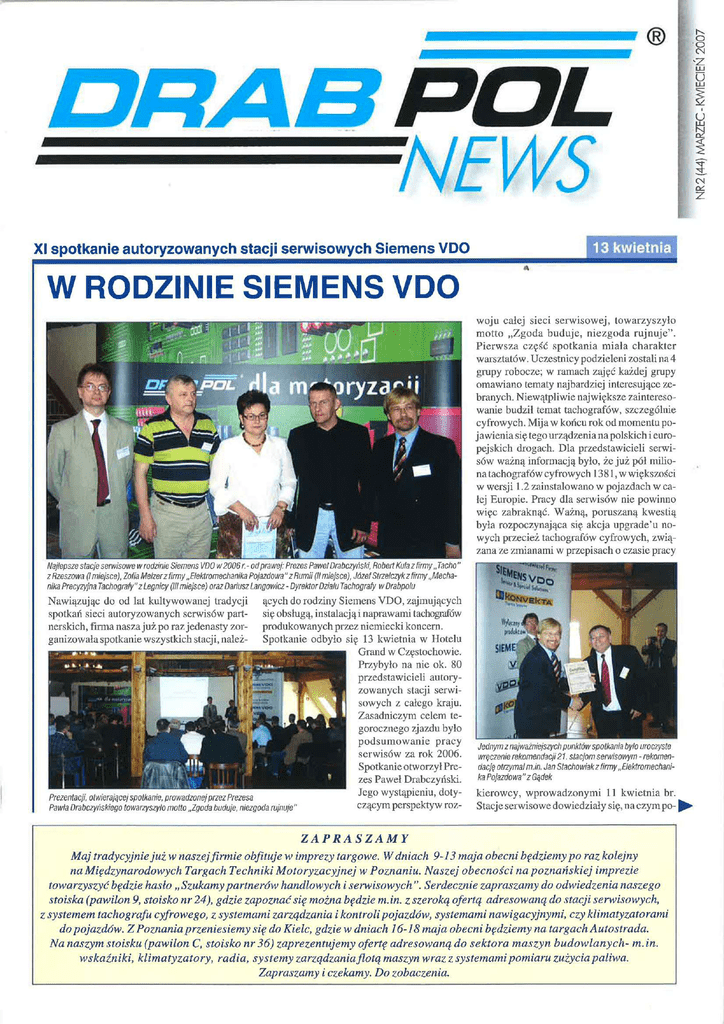 ® o o CN U U NEWS 13 XI s p o t k a n i e a u t o r y z o w a n y c h stacji s e r w i s o w y c h S i e m e n s V D O 3", CN kwietnia W RODZINIE S I E M E N S VDO r "oryza^i w o j u całej s i e c i s e r w i s o w e j , towarzyszyło m o t t o „Zgoda b u d u j e , n i e z g o d a r u j n u j e " . P i e r w s z a częs'ć s p o t k a n i a miała c h a r a k t e r warsztatów. U c z e s t n i c y p o d z i e l e n i z o s t a l i n a 4 g r a p y r o b o c z e ; w r a m a c h zajęć każdej g r u p y o m a w i a n o t e m a t y n a j b a r d z i e j interesujące z e b r a n y c h . Niewątpliwie największe z a i n t e r e s o w a n i e budził t e m a t tachografów, szczególnie c y f r o w y c h . M i j a w końcu r o k o d m o m e n t u p o j a w i e n i a się t e g o urządzenia n a p o l s k i c h i e u r o pejskich drogach. D l a przedstawicieli serwi sów ważną informacją było, że już pól m i l i o n a tachografów c y f r o w y c h 1 3 8 1 , w większości w w e r s j i 1.2 z a i n s t a l o w a n o w p o j a z d a c h w c a łej E u r o p i e . P r a c y d l a serwisów n i c p o w i n n o więc zabraknąć. Ważną, poruszaną kwestią była rozpoczynająca się a k c j a u p g r a d e ' u n o w y c h przecież tachografów c y f r o w y c h , zwią zana ze z m i a n a m i w przepisach o czasie pracy Najlepsze stacje serwisowe w rodzinie Siemens VDO w2006 r.-od prawej: Prezes Paweł Drabczyński, Robert Kula z firmy „Tacho" zRzeszowa (Imiejscej.ZofiaMelzerzfirmy „Elektromechanika Pojazdowa"zRumii (II miejsce), Józef Strzelczyk z iirmy „Mecha nika Precyzyjna Tachografy"z Legnicy (III miejsce) oraz Dariusz Langowicz - Dyrektor Działu Tachografy wDrabpoiu Nawiązując d o o d l a t k u l t y w o w a n e j t r a d y c j i spotkań s i e c i a u t o r y z o w a n y c h serwisów p a r t n e r s k i c h , f i r m a n a s z a już p o r a z j e d e n a s t y z o r ganizowała s p o t k a n i e w s z y s t k i c h s t a c j i , należ- ących d o r o d z i n y S i e m e n s V D O , zajmujących się obsługą, instalacją i n a p r a w a m i tachografów produkowanych przez niemiecki koncern. S p o t k a n i e odbyło się 1 3 k w i e t n i a w H o t e l u G r a n d w Częstochowie. Przybyło n a n i e o k . 8 0 przedstawicieli autory z o w a n y c h stacji s e r w i s o w y c h z całego k r a j u . Zasadniczym celem te g o r o c z n e g o z j a z d u było podsumowanie pracy serwisów z a r o k 2 0 0 6 . S p o t k a n i e otworzył P r e z e s Paweł Drabczyński. J e g o wystąpieniu, d o t y Prezentacji, otwierającej spotkanie, prowadzonej przez Prezesa czącym p e r s p e k t y w r o z Pawia Drabczyńskiego towarzyszyło motto „Zgoda buduje, niezgoda rujnuje" Jednym z najważniejszych punktów spotkania bylo uroczyste wręczenie rekomendacji 21. stacjom serwisowym - rekomen dację otrzyma! m. in. Jan Stachowiak z firmy „Elektromechani ka Pojazdowa" z Gądek kierowcy, w p r o w a d z o n y m i 11 kwietnia br. S t a c j e s e r w i s o w e dowiedziały się, n a c z y m p o - Z A P R A S Z A M Y Moj tradycyjnie już w naszejfirmie obfituje w imprezy targowe. W dniach 9-13 maja obecni będziemy po raz kolejny na Międzynarodowych Targach Techniki Motoryzacyjnej w Poznaniu. Naszej obecności na poznańskiej imprezie towarzyszyć będzie hasło „Szukamy partnerów handlowych i serwisowych ". Serdecznie zapraszamy do odwiedzenia naszego stoiska (pawilon 9, stoisko nr 24), gdzie zapoznać się można będzie m.in. z szeroką ofertą adresowaną do stacji serwisowych, z systemem tachografu cyfrowego, z systemami zarządzania i kontroli pojazdów, systemami nawigacyjnymi, czy klimatyzatorami do pojazdów. Z Poznania przeniesiemy się do Kielc, gdzie w dniach 16-18 maja obecni będziemy na targach Autostrada. Na naszym stoisku (pawilon C, stoisko nr36) zaprezentujemy ofertę adresowaną do sektora maszyn budowlanychm.in. wskaźniki, klimatyzatory, radia, systemy zarządzania flotą maszyn wraz z systemami pomiaru zużycia paliwa. Zapraszamy i czekamy. Do zobaczenia. ^ DRAB ciąg dalszy POL NEWS z e strony •AKTUALNOŚCI •WYDARZENIA*AKTUALNOŚCI"WYDARZENIA«AKTUALNOŚCI-WYDARZENIA 1 mentu o n o w e systemy. Spotkania robocze po święcono również omówieniu zagadnień związanych z akcją r e k o m e n d o w a n y c h s t a c j i serwisowych. Podsumowano dotychczasowe działania, omówiono n o w e pomysły z r o d z o n e z p r a w d z i w e j b u r z y mózgów. W s z y s c y w y p o w i e d z i e l i się jednogłośnie z a kontynuacją r o z poczętej 1,5 r o k u t e m u a k c j i . K u l m i n a c y j n y m p u n k t e m s p o t k a n i a było u r o c z y s t e n a d a n i e tytułów i wręczenie dyplomów Rekomendowanych Stacji Serwisowych n a 2 0 0 7 r o k . W g r u p i e t e j znalazło się 2 1 n a j Uczestnicy spotkania odwiedzili nową siedzibę centrali firmy l e p s z y c h serwisów p a r t n e r s k i c h , Więcej o s t a w Mykanowie k/Częstochowy c j a c h r e k o m e n d o w a n y c h p i s z e m y poniżej. legać będzie w s p o m n i a n y u p g r a d e . Niezbędne t u będą k a r t a w a r s z t a t o w a , d w i e płyty C D z programem, laptop z o p r o g r a m o w a n i e m oraz k o d dostępu. Podkreślić c h c e m y , że d o k o n a n i e u p g r a d e " u , c z y l i unowocześnienia p r o g r a m u dokonać będzie można t y l k o w a u t o r y z o w a n y c h stacjach s e r w i s o w y c h Siemens V D O . Właściciel p o j a z d u , który p r z y j e d z i e d o s t a c j i a u t o r y z o w a n e j S i e m e n s V D O , p o o k . 15 m i n u t a c h będzie miał d o s t o s o w a n y t a c h o g r a f d o o b e c n y c h wymagań i n i e będzie musiał pła cić z a ponowną kalibrację urządzenia. B r a k w y k o n a n i a upgrade"u sygnalizowane jest p r z e z t a c h o g r a f i z upływem c z a s u prowadzić Duże wrażenie na przybyłych gościach zrobił nowoczesny może d o zakłóceń w p r a c y urządzeni
