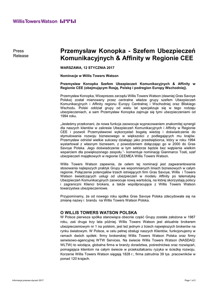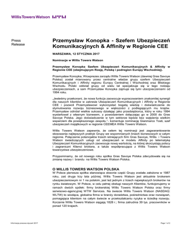 Press Release Przemysław Konopka - Szefem Ubezpieczeń Komunikacyjnych & Affinity w Regionie CEE WARSZAWA, 12 STYCZNIA 2017 Nominacje w Willis Towers Watson Przemysław Konopka Szefem Ubezpieczeń Komunikacyjnych & Affinity w Regionie CEE (obejmującym Rosję, Polskę i podregion Europy Wschodniej). Przemysław Konopka, Wiceprezes zarządu Willis Towers Watson (dawniej Gras Savoye Polska) został mianowany przez centralne władze grupy szefem Ubezpieczeń Komunikacyjnych i Affinity regionu Europy Centralnej i Wschodniej oraz Bliskiego Wschodu. Polski oddział grupy od wielu lat specjalizuje się w tego rodzaju ubezpieczeniach, a sam Przemysław Konopka zajmuje się tymi ubezpieczeniami od 1994 roku. „Jesteśmy przekonani, że nowa funkcja zaowocuje wypracowaniem znakomitej synergii dla naszych klientów w zakresie Ubezpieczeń Komunikacyjnych i Affinity w Regionie CEE i pozwoli Przemysławowi wykorzystać bogatą wiedzę i doświadczenie do stymulowania rozwoju biznesowego w większości z podlegających mu krajów. Przemysław odniósł wielkie sukcesy działając jako przedsiębiorca, który w roku 1994 wystartował z własnym biznesem, z powodzeniem dołączając go w 2000 do Gras Savoye Polska. Jego doświadczenie w tym sektorze będzie bez wątpienia wielkim wsparciem dla powiększonego zespołu.”- komentuje nominację Gianmarco Tosti, szef ubezpieczeń majątkowych w regionie CEEMEA Willis Towers Watson. Willis Towers Watson zapewnia, że celem tej nominacji jest zagwarantowanie stosowania najlepszych praktyk Grupy we wspomnianych liniach biznesowych w całym regionie. Połączenie potencjałów trzech istniejących firm Gras Savoye, Willis i Towers Watson świadczących usługi od ubezpieczeń w modelu Affinity po telematykę Ubezpieczeń Komunikacyjnych zaowocuje nową wartością, na której skorzystają polscy i zagraniczni Klienci brokera, a także współpracujące z Willis Towers Watson towarzystwa ubezpieczeniowe. Przypominamy, że od nowego roku spółka Gras Savoye Polska zdecydowała się na zmianę nazwy i brandu na Willis Towers Watson Polska. O WILLIS TOWERS WATSON POLSKA W Polsce pierwsza spółka stanowiąca obecnie część Grupy została założona w 1987 roku, zaś druga trzy lata później. Willis Towers Watson jest aktualnie brokerem ubezpieczeniowym nr 1 na polskim, jest też jednym z trzech największych brokerów na rynku światowym. W Polsce, w celu pełnej obsługi naszych Klientów, funkcjonujemy w ramach dwóch spółek: firmy brokerskiej Willis Towers Watson Polska oraz firmy serwisowo-agencyjnej WTW Services. Na świecie Willis Towers Watson (NASDAQ: WLTW) to wiodąca, globalna firma w branży doradztwa, pośrednictwa oraz rozwiązań, pomagająca klientom na całym świecie w przekształcaniu ryzyka w ścieżkę rozwoju. Korzenie Willis Towers Watson sięgają 1828 r.; firma zatrudnia 39 tys. pracowników w ponad 120 krajach. Informacja prasowa styczeń 2017 Page 1 of 2 Press Release O WILLIS TOWERS WATSON POLSKA W Polsce pierwsza spółka stanowiąca obecnie część Grupy została założona w 1987 roku, zaś druga trzy lata później. Willis Towers Watson jest aktualnie brokerem ubezpieczeniowym nr 1 na polskim rynku, jest też jednym z trzech największych brokerów na rynku światowym. W Polsce, w celu pełnej obsługi naszych Klientów, funkcjonujemy w ramach dwóch spółek: firmy brokerskiej Willis Towers Watson Polska oraz firmy serwisowo-agencyjnej WTW Services. Na świecie Willis Towers Watson (NASDAQ: WLTW) to wiodąca, globalna firma w branży doradztwa, pośrednictwa oraz rozwiązań, pomagająca klientom na całym świecie w przekształcaniu ryzyka w ścieżkę rozwoju. Korzenie Willis Towers Watson sięgają 1828 r.; firma zatrudnia 39 tys. pracowników w ponad 120 krajach. KONTAKT Joanna Suszczyk: +48 22 318 89 42 I + 48 691 015 025 | [email protected] Y:\moje dokumenty\ASIA_S\Media\2017.01.12 - WTW PL - nominacja Przemysława Konopki.docxY:\moje dokumenty\ASIA_S\Media\2017.01.12 - WTW PL - nominacja Przemysława Konopki.docx Page 2 of 2